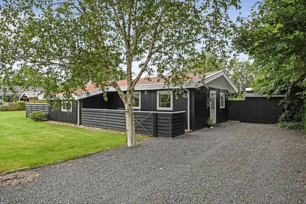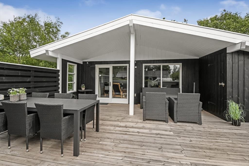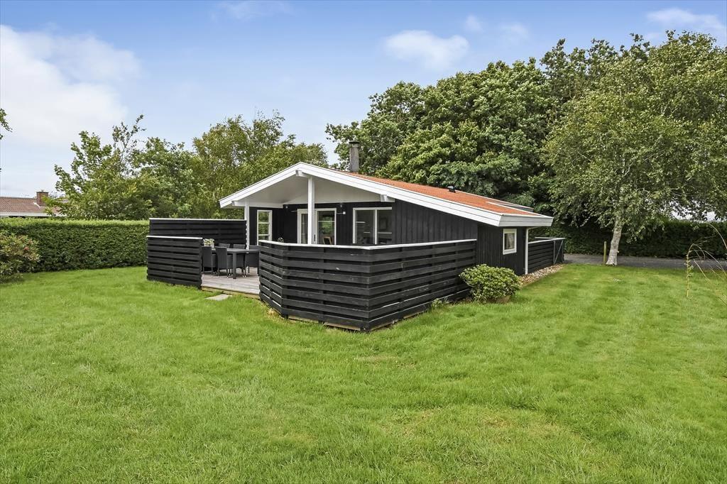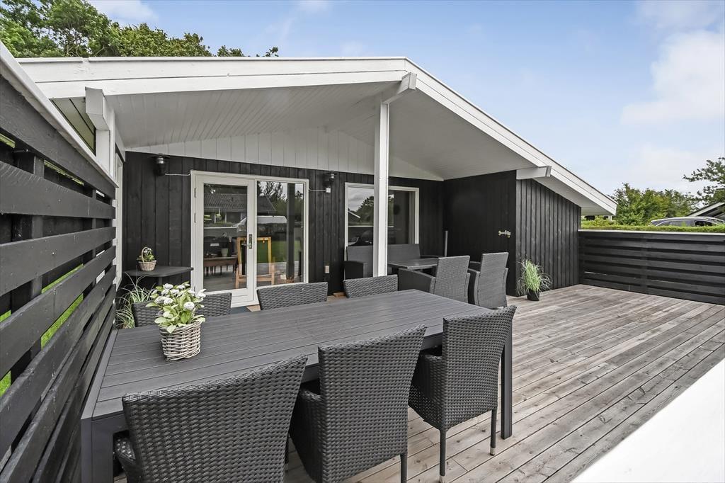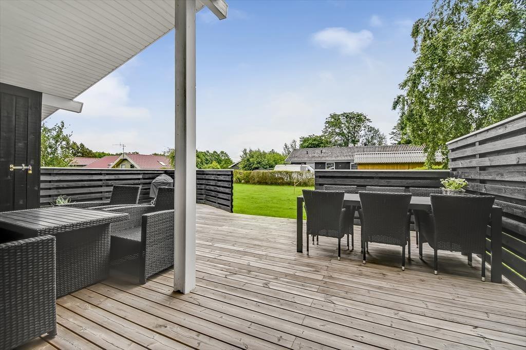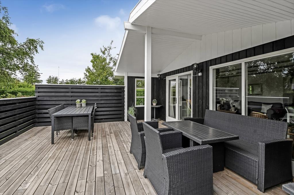 Rundt om sommerhuset er der flere gode siddepladser at vælge imellem, og måske vil du slå dig ned i en solstråle på den østvendte træterrasse først på dagen. Det er dog sandsynligt, at den sydvestvendte terrasse bliver din foretrukne, for den er noget større og tilmed delvist overdækket – og så ligger den meget praktisk i forlængelse af stuen, så det er nemt at tage sommerfrokosten med ud i det fri. Bilen kan holde i den grusbelagte indkørsel, og græsplænen inviterer til leg og boldspil, hvis ikke du smutter med børnene hen på den nærmeste legeplads for at boltre jer der.