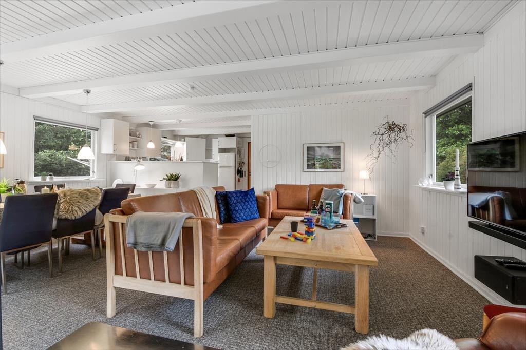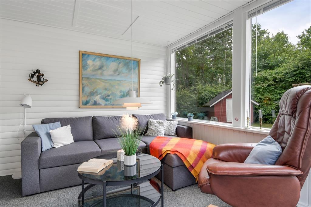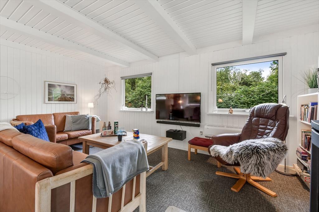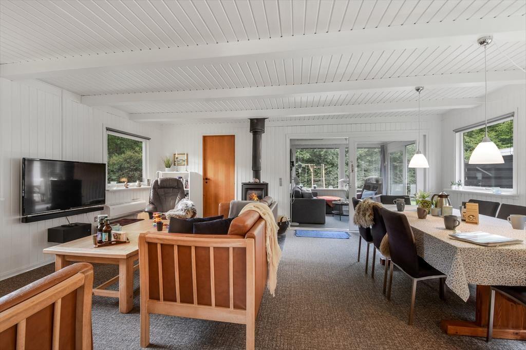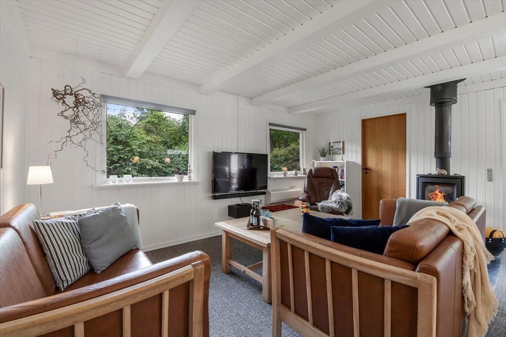 Med hvidmalede trævægge, brændeovn og komfortabelt møblement er sommerhusatmosfæren helt i top i stuen, og hvis du vil slappe af med gode bøger, strikketøj og brætspil, er det her, det hele kan foregå. Der hænger også et stort fladskærms-tv på væggen, hvis dagen skal sluttes af med en spændende film eller et afsnit af yndlingsserien – og hvis du hellere vil sidde med udsigt til den grønne have, kan aftenhyggen rykkes ud i den tilstødende udestue. Feriens små og store måltider kan du tilberede i køkkenet, der ligger i åben forbindelse med stuen, og nattesøvnen får gode betingelser på husets tre dejlige soveværelser.