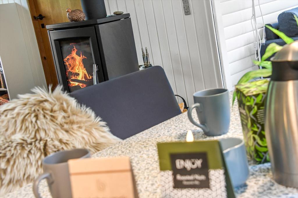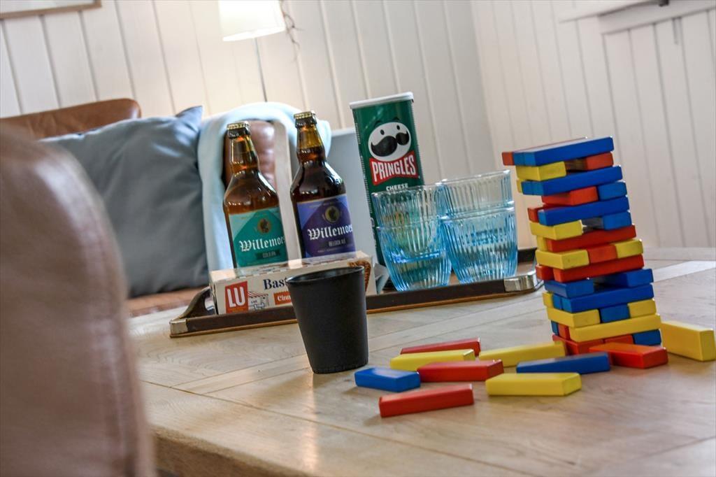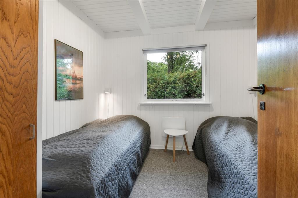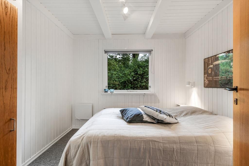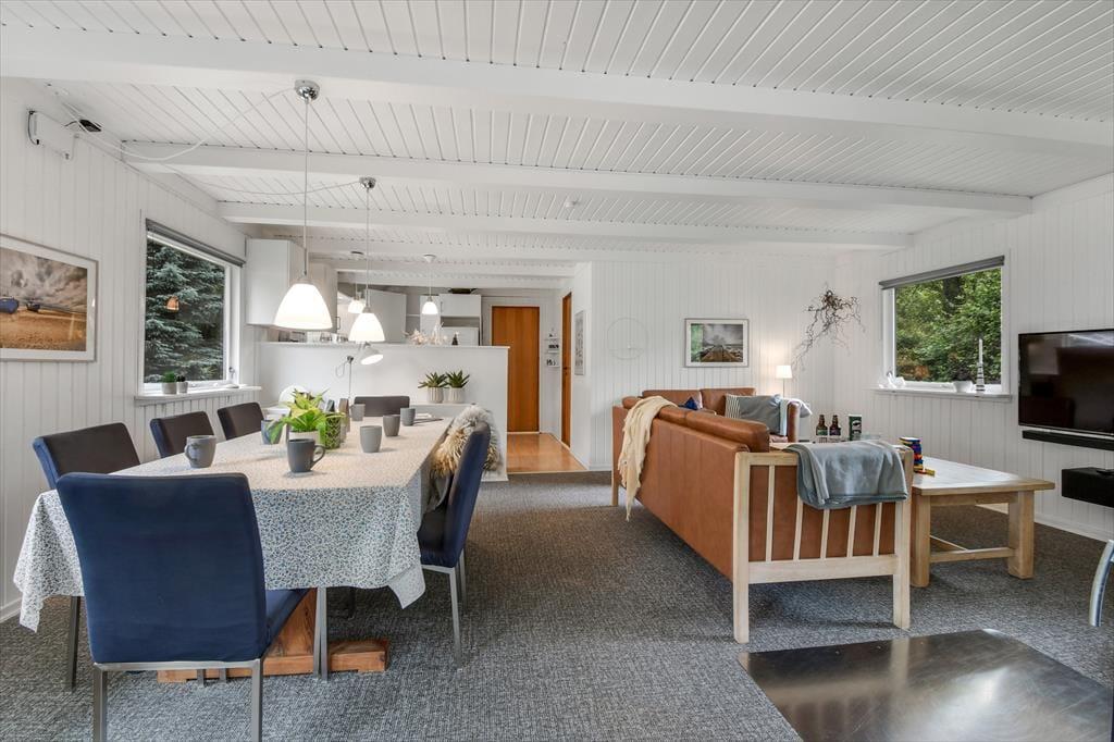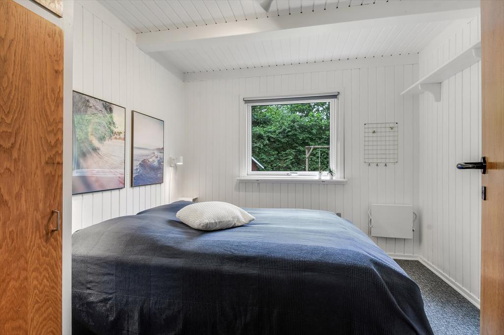 Med hvidmalede trævægge, brændeovn og komfortabelt møblement er sommerhusatmosfæren helt i top i stuen, og hvis du vil slappe af med gode bøger, strikketøj og brætspil, er det her, det hele kan foregå. Der hænger også et stort fladskærms-tv på væggen, hvis dagen skal sluttes af med en spændende film eller et afsnit af yndlingsserien – og hvis du hellere vil sidde med udsigt til den grønne have, kan aftenhyggen rykkes ud i den tilstødende udestue. Feriens små og store måltider kan du tilberede i køkkenet, der ligger i åben forbindelse med stuen, og nattesøvnen får gode betingelser på husets tre dejlige soveværelser.