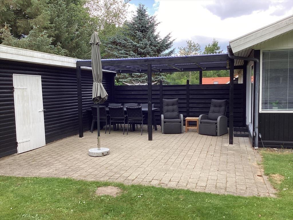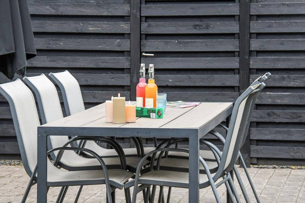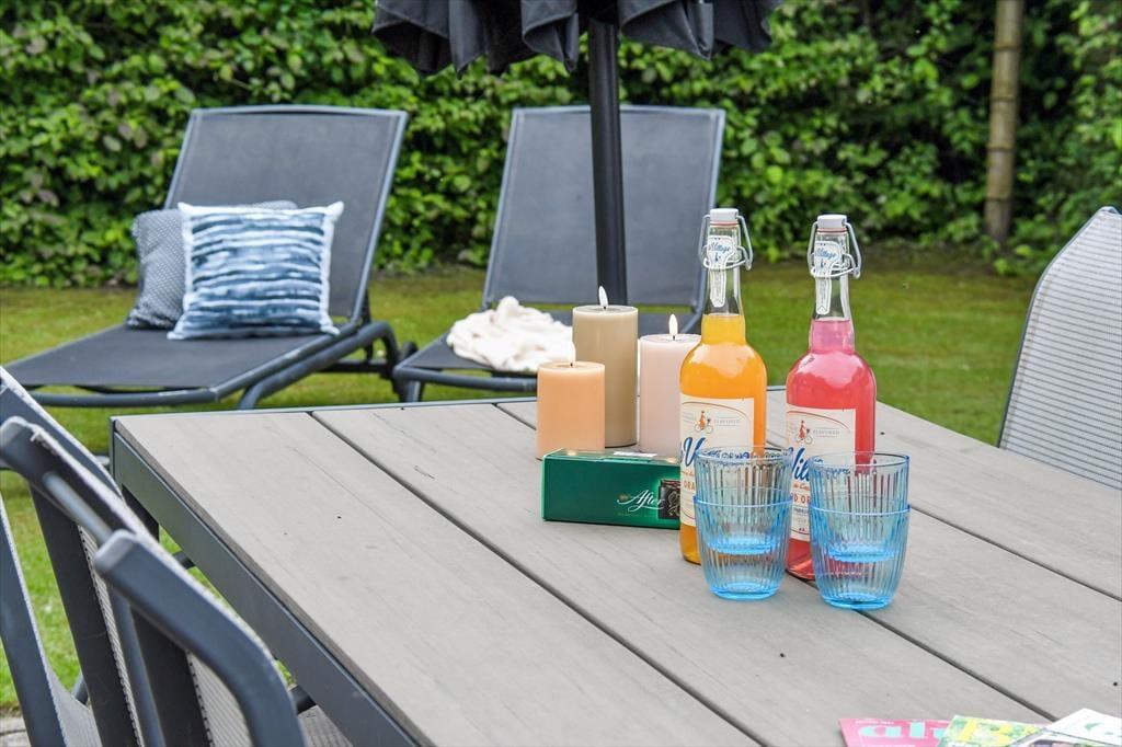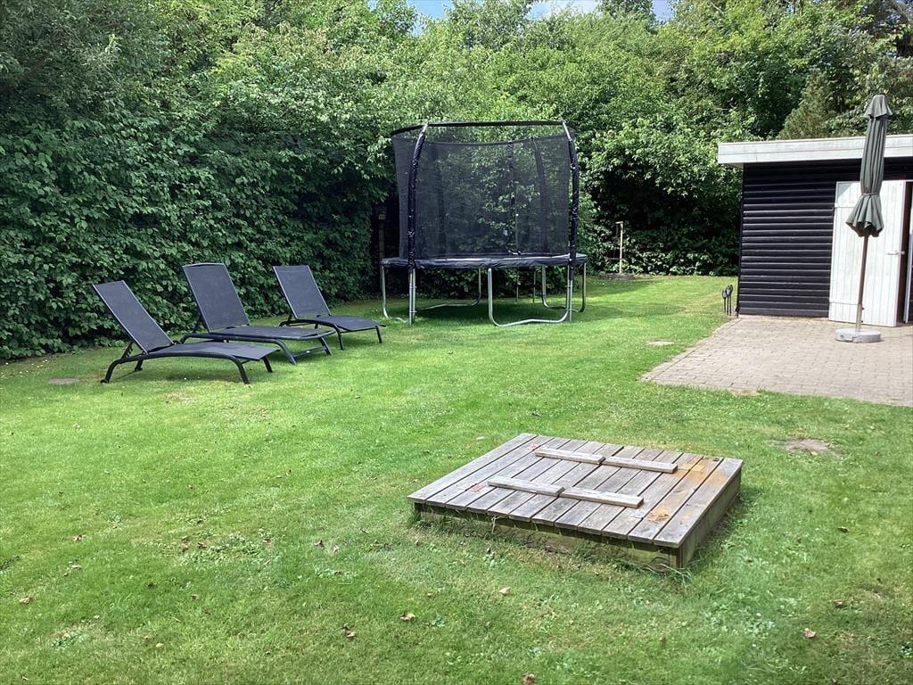 Fra udestuen har du direkte adgang til en stor og ugeneret fliseterrasse, der ligger godt i læ af udhuset og et plankeværk. Når du soler dig her eller sidder i skyggen af parasollen, kan du kigge på havens grønne løvværk, og synet af den velanlagte græsplæne vil måske give dig eller de yngste familiemedlemmer lyst til at springe op for at spille bold eller andre havespil. Sandkassen og trampolinen sørger for underholdning til børnene, hvis de voksne kan bruge en stund mere i havestolene, inden det er tid til at udforske Bork Havn og omegn.