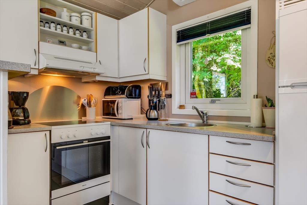Hyggestemningen er i top inden døre, hvor sommerhusets 50 m2 er fornuftigt fordelt mellem opholdsafdelingen, badeværelset og de to soveværelser. Planløsningen gør huset velegnet til en afslappende parferie såvel som en skøn ferie med børnene – og uanset setuppet, kan du se frem til at nyde livet i stuen, når der er ild i brændeovnen, snacks på bordet og eventuelt en god film på fladskærms-tv’et. Brætspil, boglæsning og måske en middagslur eller to kan der også blive plads til, når det er ferietid, og om aftenen kan du glæde dig til at lave mad og efterfølgende indtage måltidet i de hyggelige rammer.