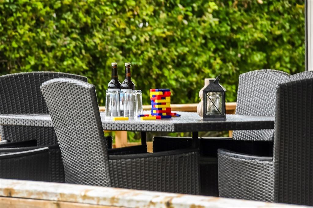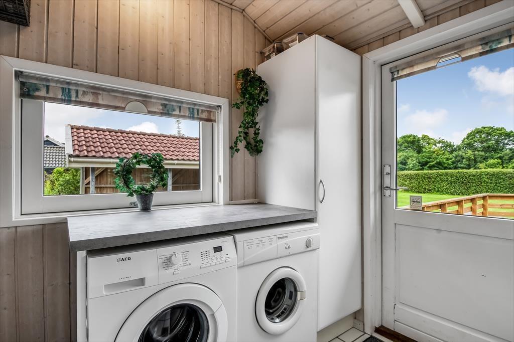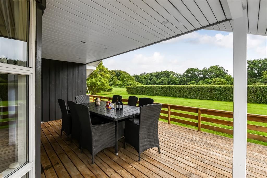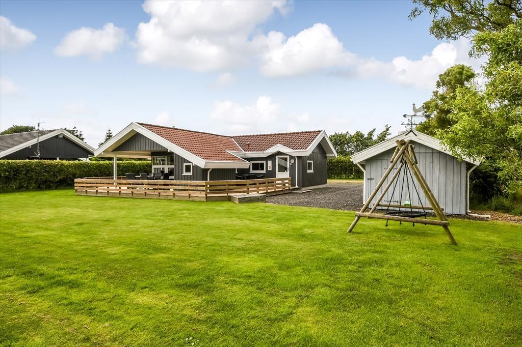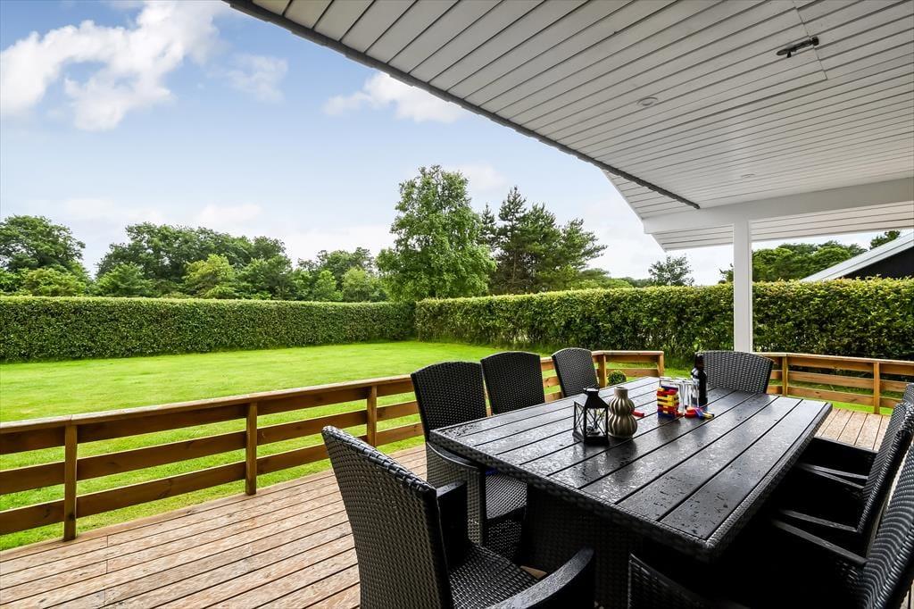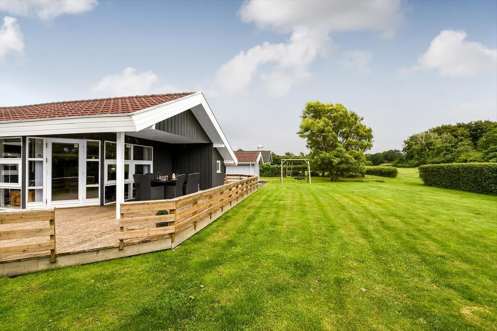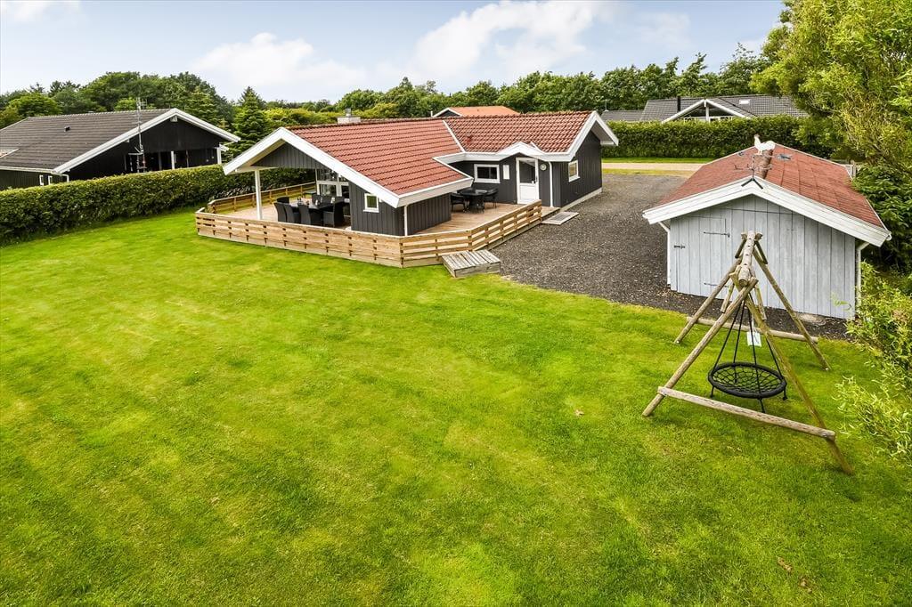 Fra stuen har du direkte adgang til terrassen, og den vej vil du sikkert gå adskillige gange, når der er sommer og feriestemning i luften. I hvert fald er det skønt at slænge sig i solen på det udendørs opholdsmiljø – og hvis du har brug for endnu en iskaffe eller en anden kølig fristelse, er det rart at have kort afstand ind til køkkenet. Baghavens velanlagte græsplæne er godt afskærmet af en tæt hæk, og i det ene hjørne er der en åbning ud mod det grønne fællesareal, der breder sig syd for grunden. Til de yngste feriegæster er der sandkasse og et gyngestativ med sansegynge, og det er nemt at komme hen til den nærmeste legeplads, hvis børnene har brug for endnu mere at boltre sig med.