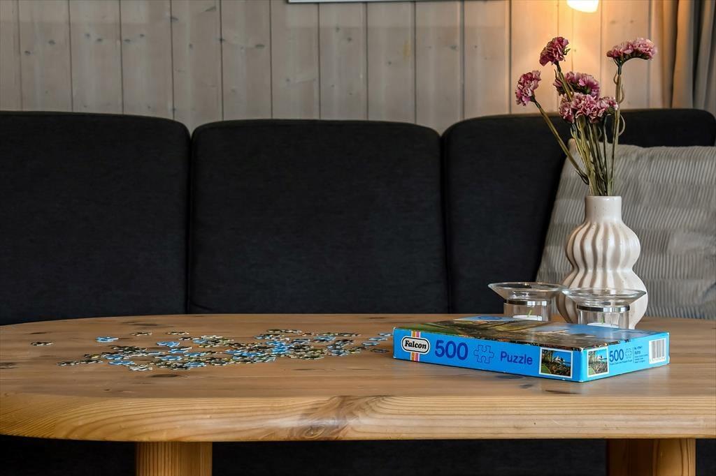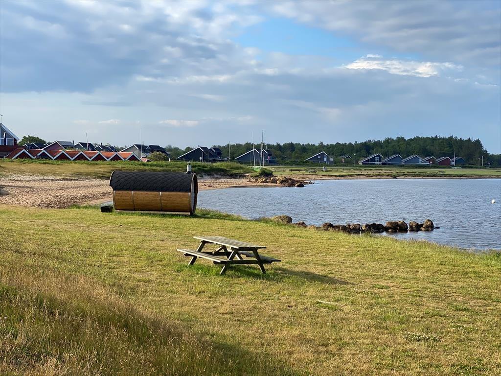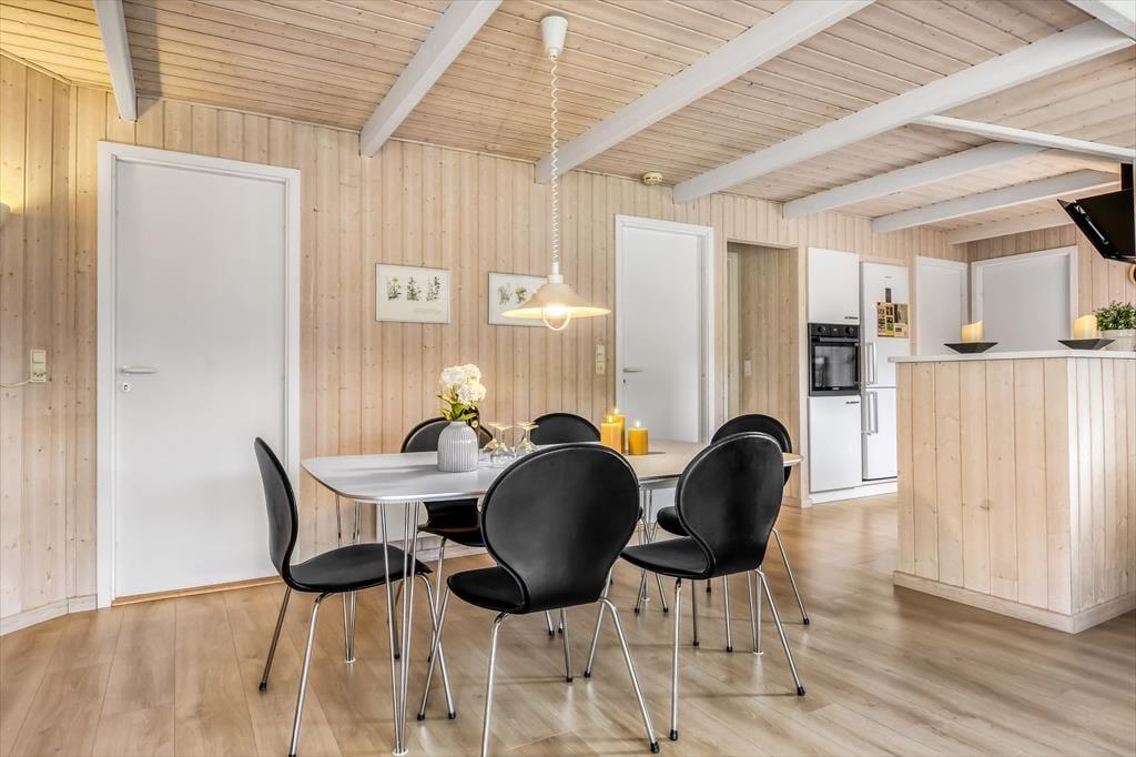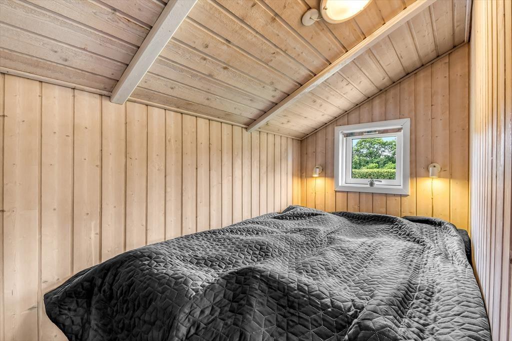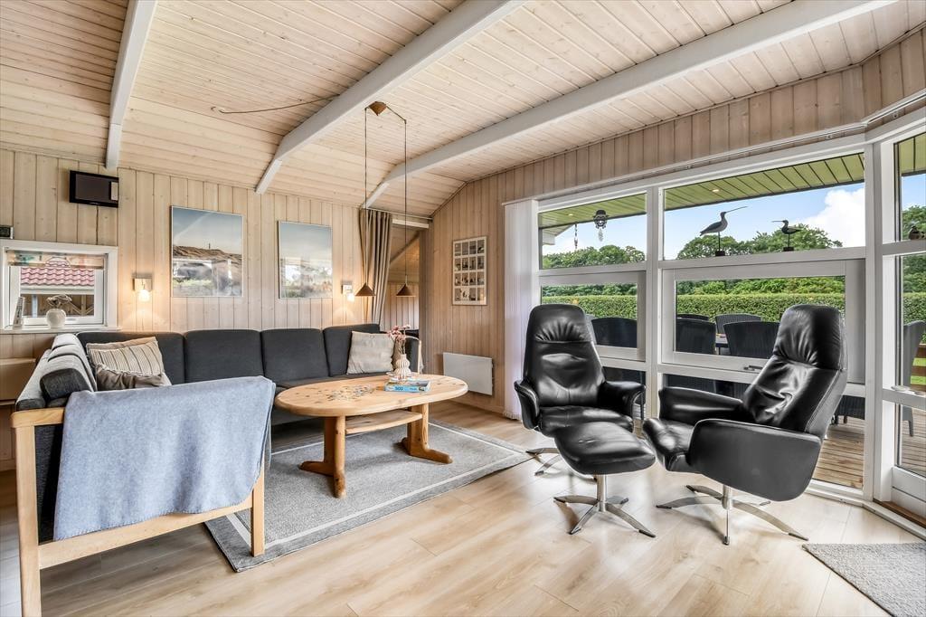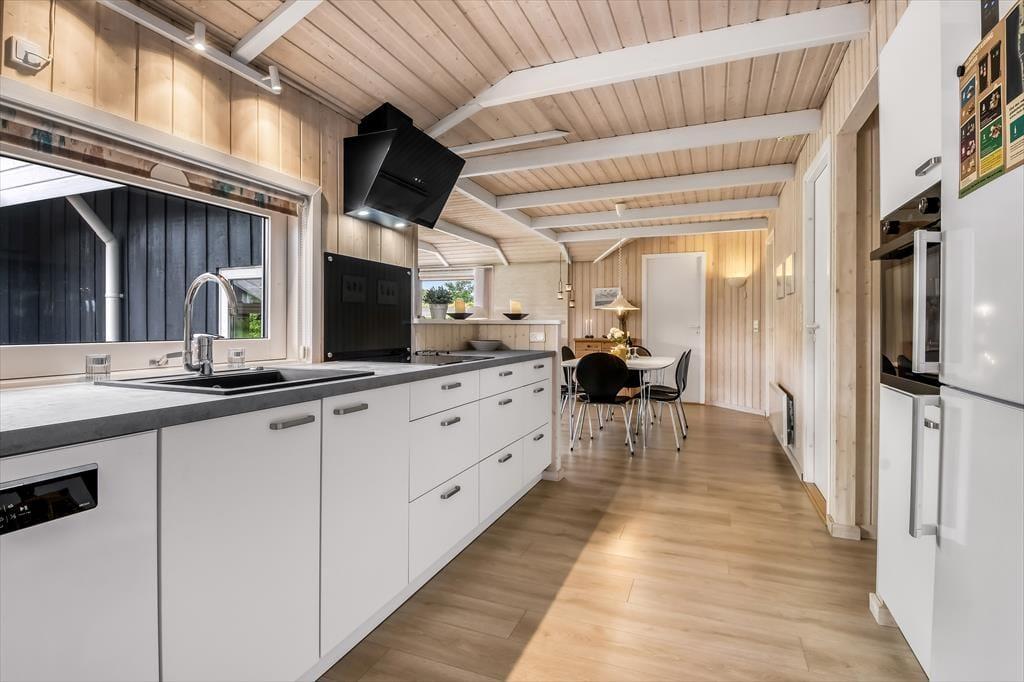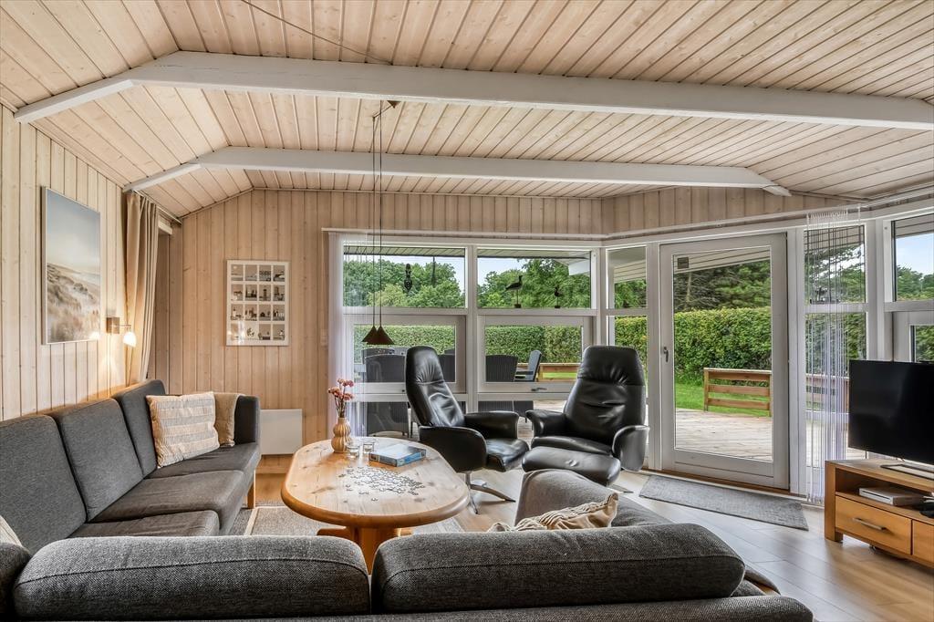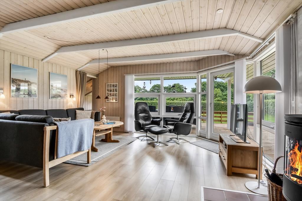 Sommerhusets rummelige stue er det helt oplagte samlingspunkt, for her er der plads til både store og små, uanset om I sidder samlet om et godt måltid mad eller hygger jer hver især med brætspil, bøger og leg på gulvet. Der er brændeovn til årets kølige perioder, og den åbne forbindelse betyder, at duften af hjemmebagte boller eller simremad kan sprede sig og gøre atmosfæren endnu mere rar og hjemlig. Alkoven fungerer ikke kun som hyggekrog i løbet af dagen, men kan også bruges til overnatning på linje med de tre soveværelser, mens det største badeværelse forkæler jer med både spabad og sauna.