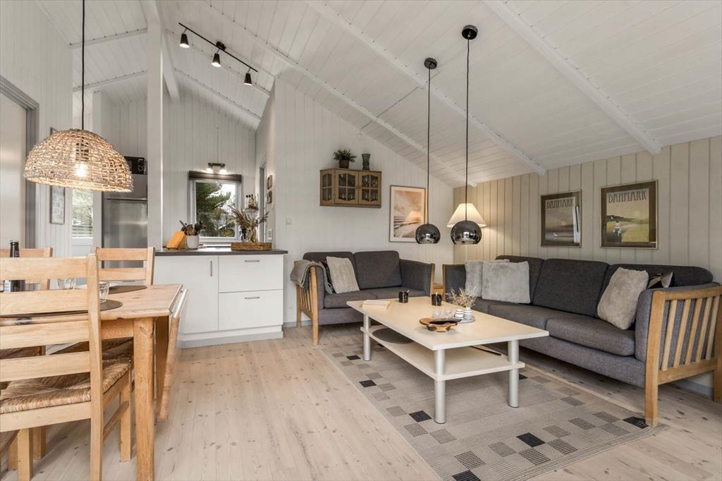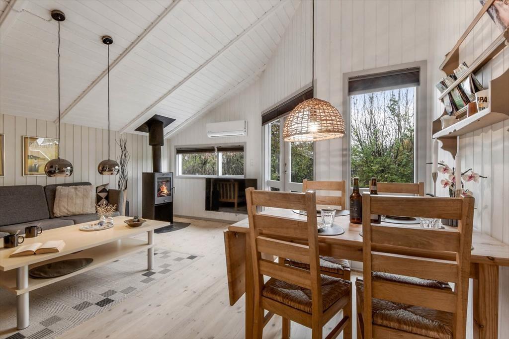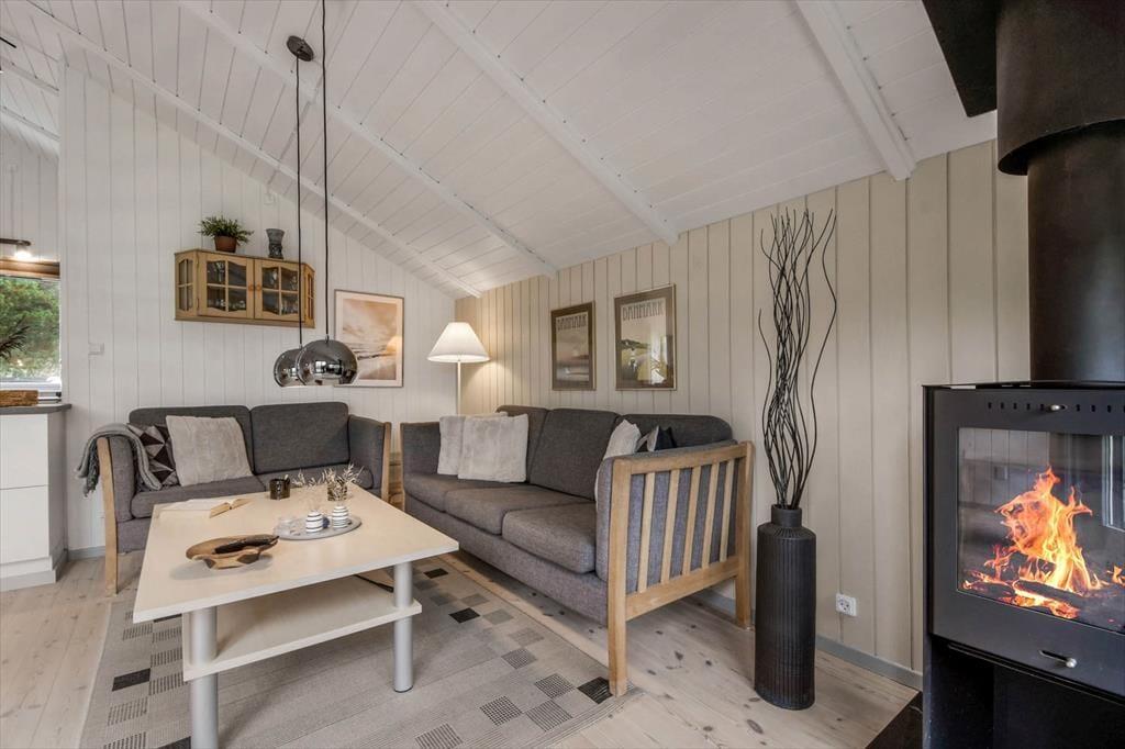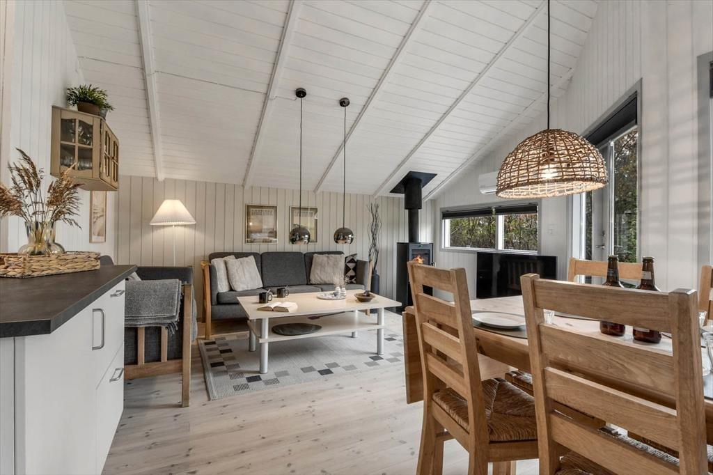 Sommerhuset er lyst og moderne indrettet med et opholdsrum, der hurtigt bliver familiens samlingspunkt. Her er en hyggelig stue med bløde møbler og brændeovn, der spreder varme og stemning på kølige dage. Køkkenet ligger i åben forbindelse med stuen, så I kan være sammen, mens der kokkereres, spilles spil eller bare hygges med en god bog. De to soveværelser byder på en behagelig base for afslappende nætter, og badeværelset er stilfuldt indrettet med alt, hvad I behøver. Fra hvert hjørne af huset mærkes den moderne og hjemlige atmosfære, der indbyder til feriestunder i fuldendt ro.
