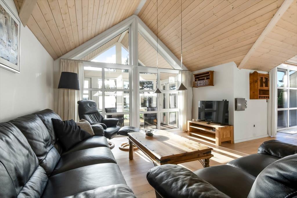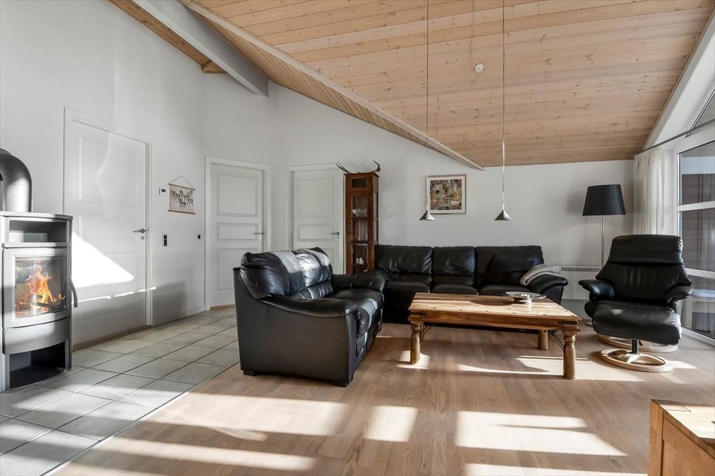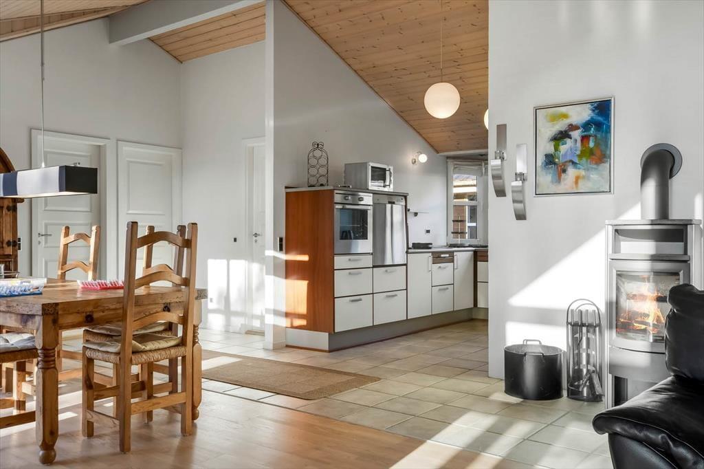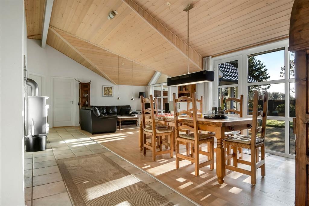 Indenfor bliver du mødt af et dejligt, lyst rum, hvor store vinduespartier lader lyset strømme ind og skaber en åben og luftig atmosfære. Her er et opholdsrum, der fungerer som ferieboligens samlingspunkt, og med brændeovnens varme og det hyggelige sofahjørne er det nemt at finde ro, uanset om du vil fordybe dig i en bog eller nyde en god film. Det åbne køkken ligger i direkte forbindelse med spiseområdet, så du kan holde samtalen i gang, mens aftensmaden bliver tilberedt. Huset byder på tre soveværelser, som alle inviterer til en god nattesøvn, og badeværelset er moderne indrettet med god plads til både afslapning og praktiske gøremål.