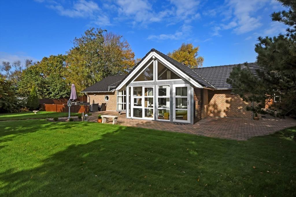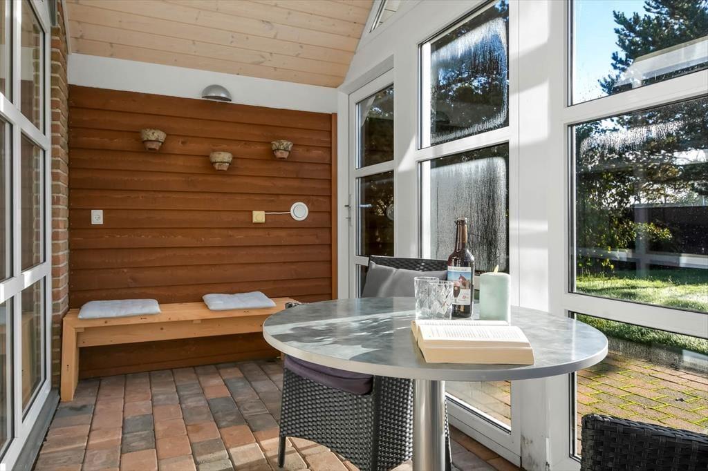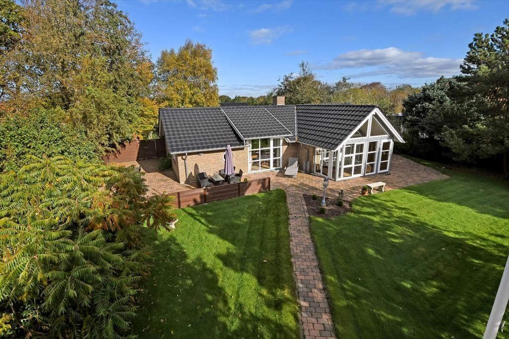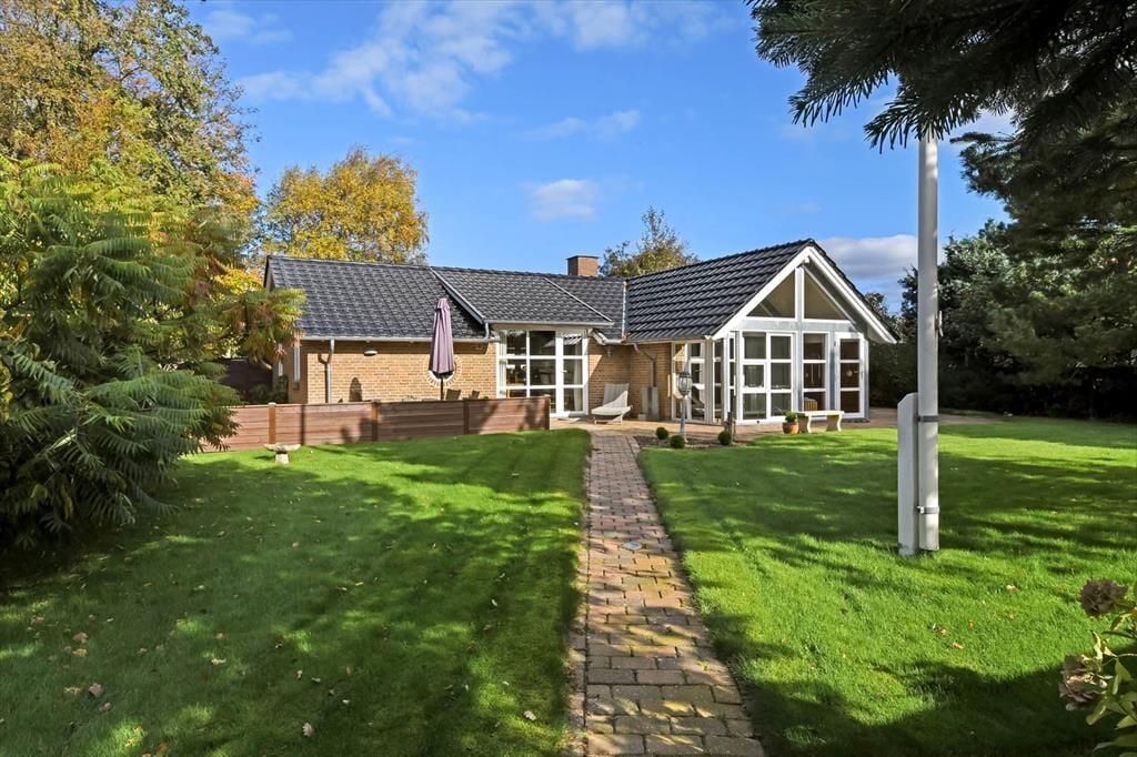 Terrassedørene åbner direkte ud til sommerhusets sydvendte terrasse, hvor du og dine kære kan nyde solen og feriestemningen hele dagen. Der er god plads til afslapning i havemøblerne, og med den frodige have som baggrund får I en skøn ramme til alt fra morgenkaffen til aftengrill. Haven er perfekt til leg og boldspil for familiens yngste, og her er både ro og privatliv, så I kan slappe helt af. Den sydvendte terrasse er også et oplagt sted at nyde et glas vin i solnedgangen, mens sommerhusets grønne omgivelser skaber en fredfyldt atmosfære.