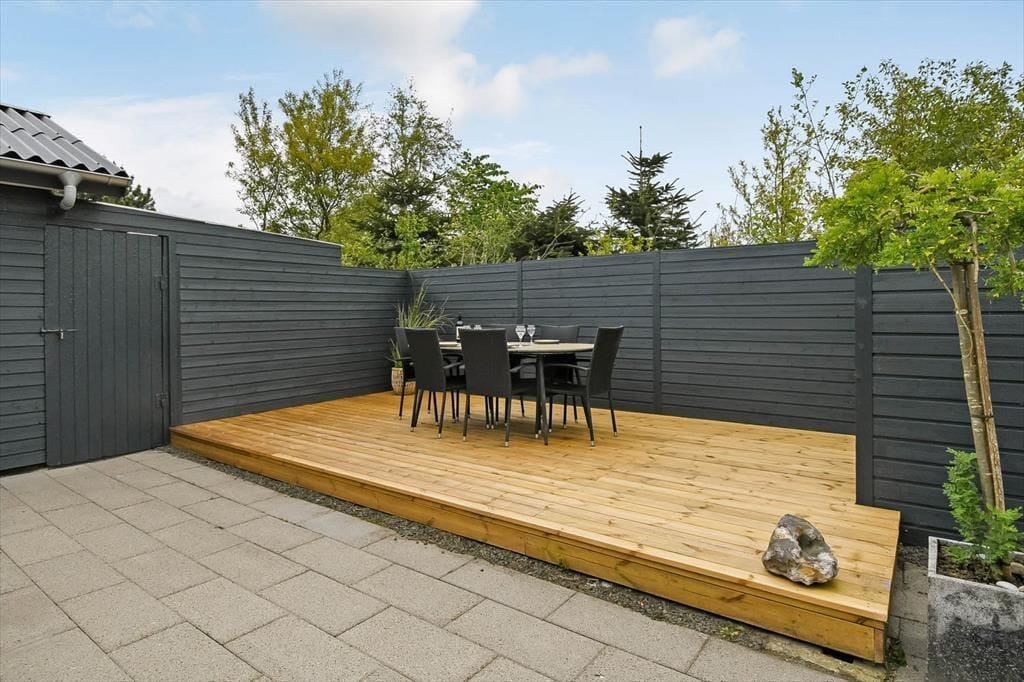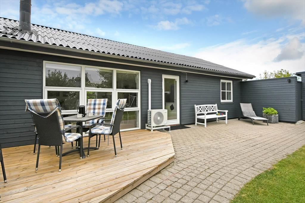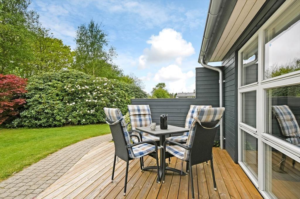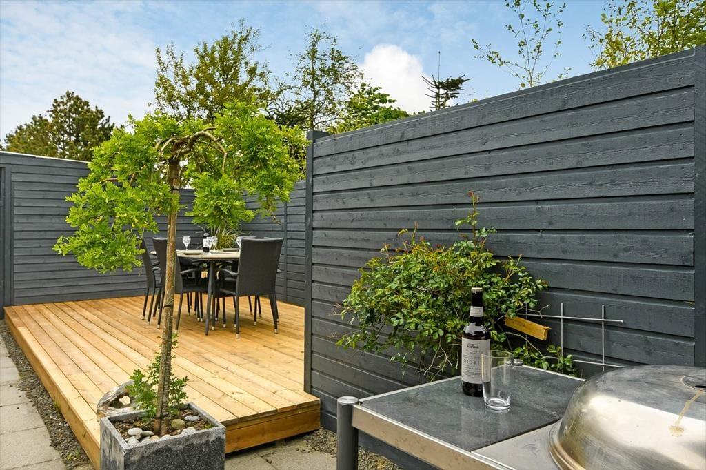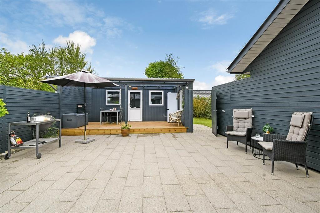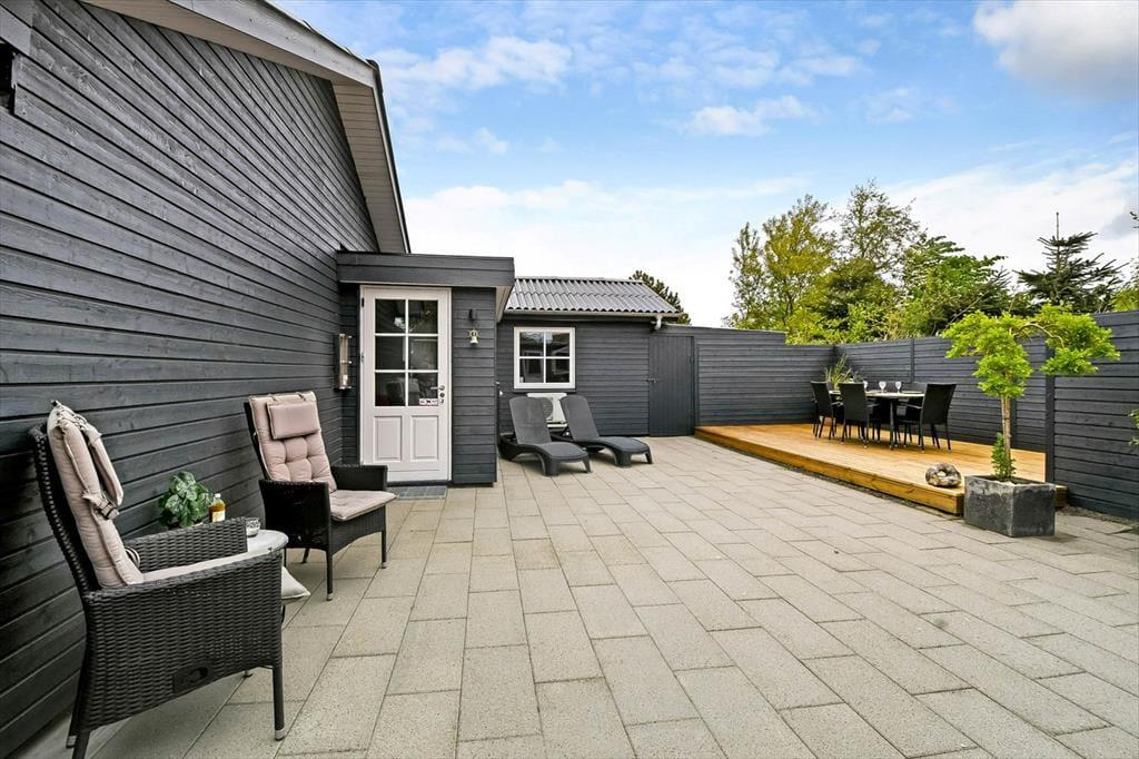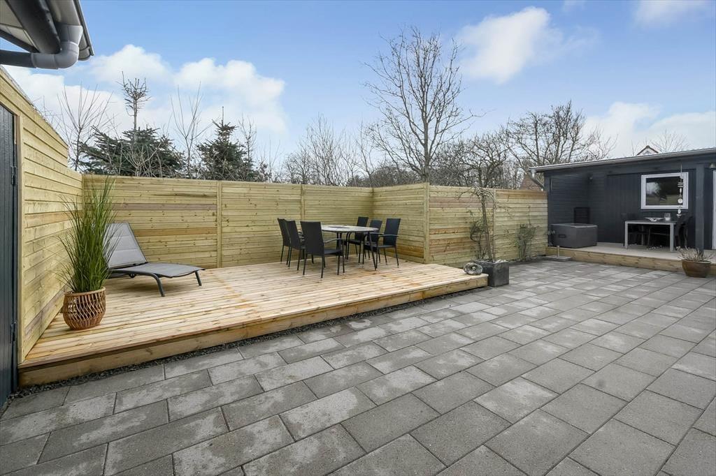Udenfor venter en skøn lukket gårdhave, hvor du kan nyde solen i fuldkommen ro og mag. De to terrasser giver mulighed for at følge solens gang hele dagen – start morgenen med en kop kaffe på den ene terrasse og afslut dagen med en lækker grillmiddag på den anden. Børnene kan lege trygt på græsplænen, mens de voksne slapper af med en god bog eller et glas vin.