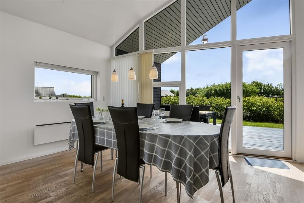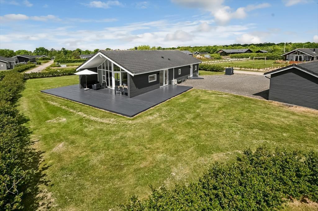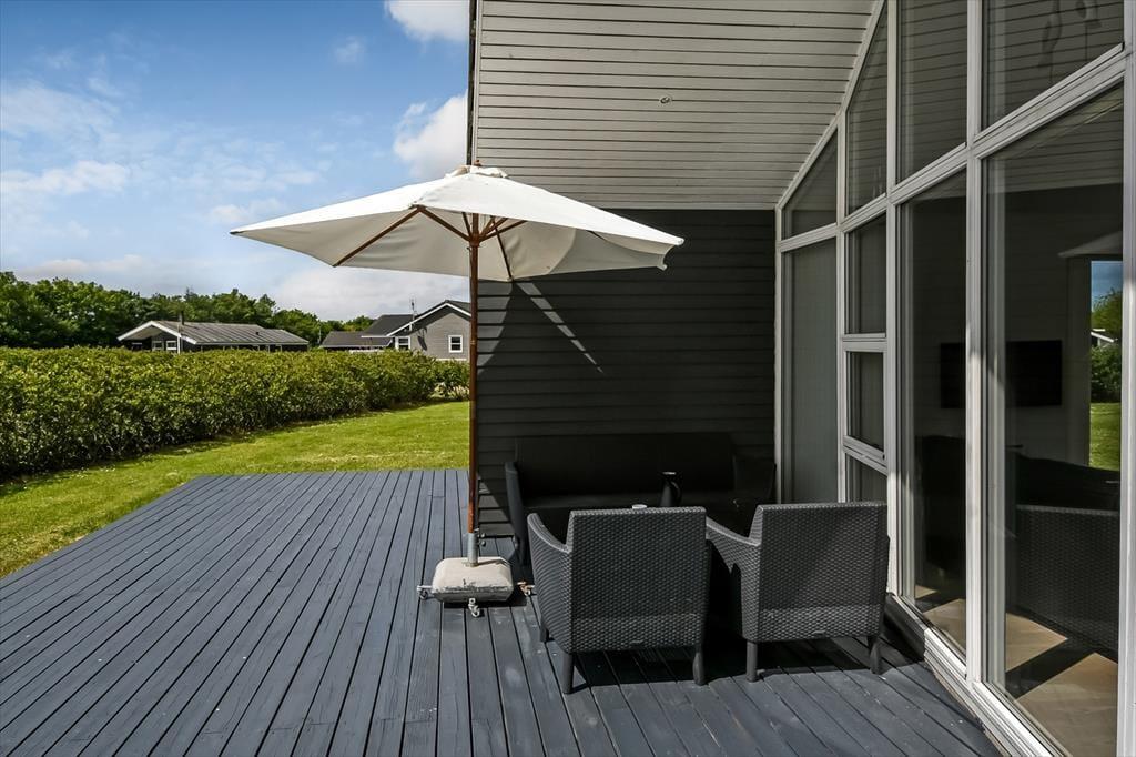 Udendørslivet folder sig ud på den skønne terrasse, der ligger i direkte forbindelse med stuen. Her kan du læne dig tilbage i havestolen med en kop kaffe, mens du nyder fuglekvidder og duften af nyklippet græs. Den grønne grund giver rig mulighed for leg og afslapning, og takket være den rolige placering kan du lade skuldrene sænke sig og bare nyde det stille tempo. Terrassen indbyder til lange måltider under åben himmel og hyggelige aftener i solens sidste stråler – måske med grillen tændt og et tæppe over benene, når duggen falder. Her får du følelsen af at have dit eget lille fristed midt i det vestjyske sommerland.