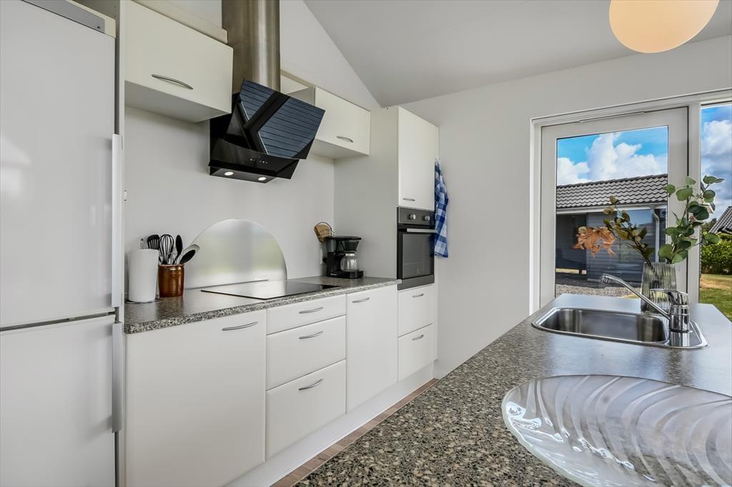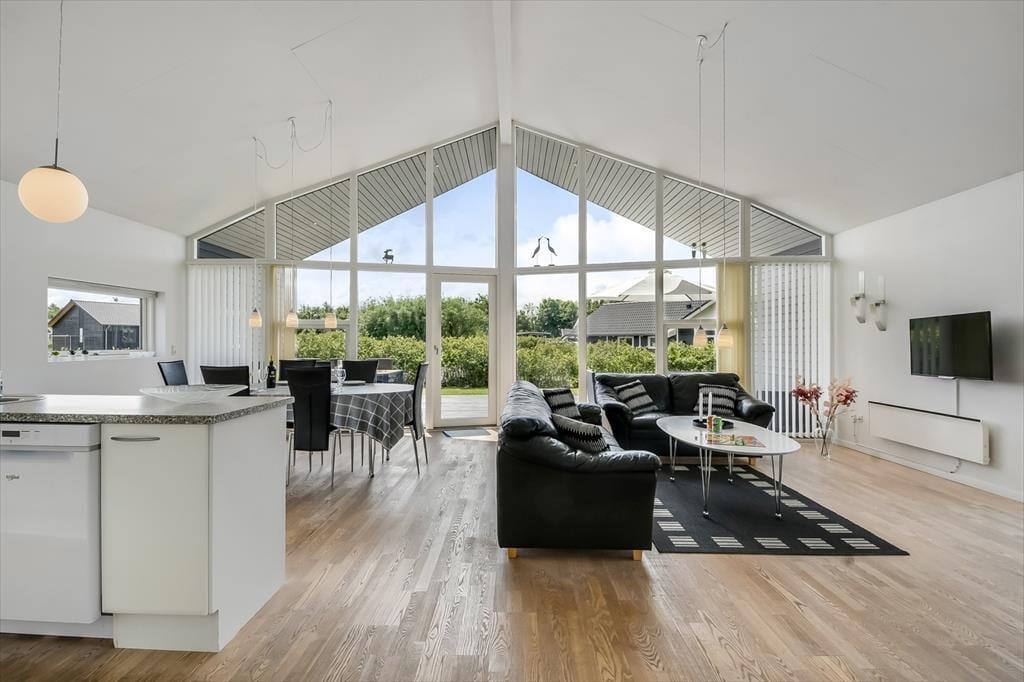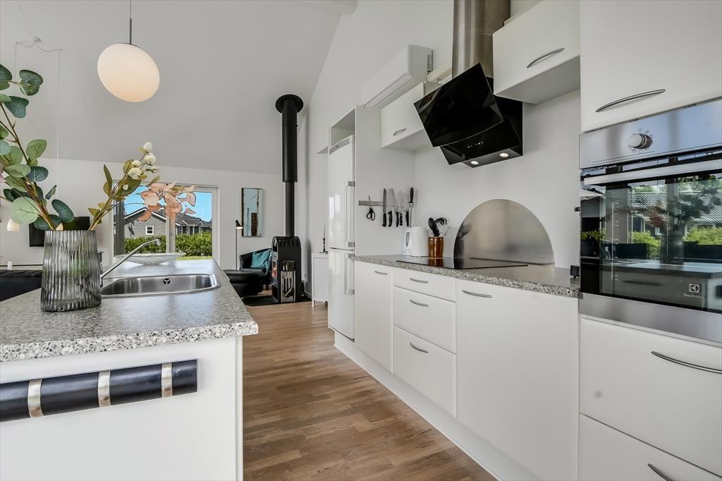 Allerede når du træder ind, mærker du, at her er rart at være. Det store opholdsrum er sommerhusets naturlige hjerte – lyst og indbydende, med god plads til, at hele familien kan samles om madlavning, spil og afslapning. De store vinduespartier lukker lyset og naturens grønne nuancer ind, og selv når du bliver indendørs, er du tæt forbundet med omgivelserne. Den åbne planløsning skaber en følelse af rummelighed, og uanset om du sidder i sofaen med en bog eller hjælper med aftensmaden, er I sammen om ferien. Sommerhuset har to badeværelser, hvilket gør det oplagt til en ferie med både børn, bedsteforældre eller gode venner – her er god plads og gode rammer til alle. Skal brændeovnen startes op er det også muligt at købe brænde ved huset.