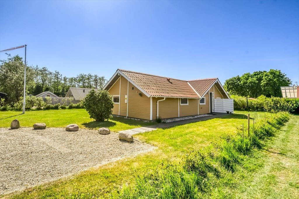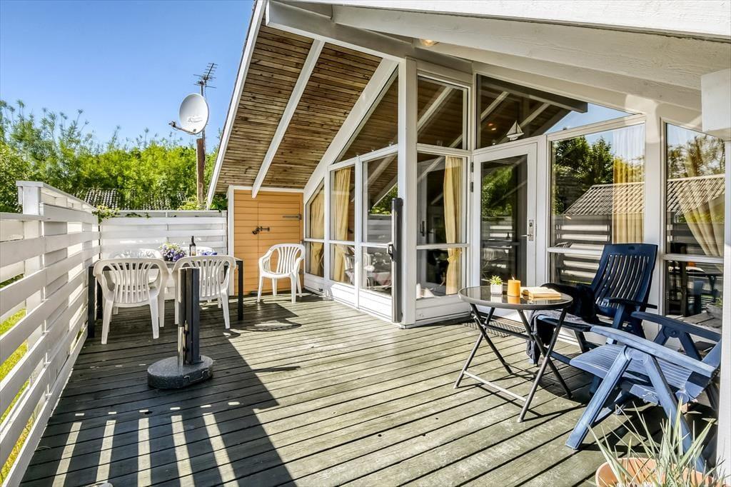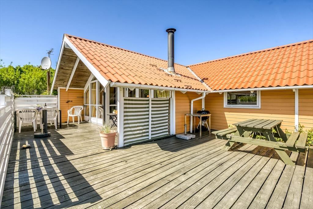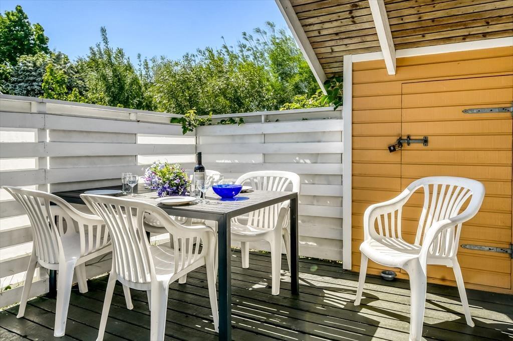 Udendørs bliver du mødt af en dejlig, grøn grund med læ og flere skønne solspots, så du altid kan finde en plads i solen – eller i skyggen, hvis det er det, du har brug for. Her er plads til at lade skuldrene sænke, mens solen varmer huden og fuglene kvidrer i træerne omkring dig. Terrassen er indrettet, så du både kan slappe af i loungemøblerne og nyde måltider under åben himmel, og dine hunde vil elske at snuse rundt i haven, mens børnene leger på græsset. Hvad enten du tager middagsluren i havestolen, spiller kongespil med familien eller skåler i rosé ved solnedgang, så kan du nyde feriedagene i dit helt eget tempo – omgivet af fred, læ og masser af natur.