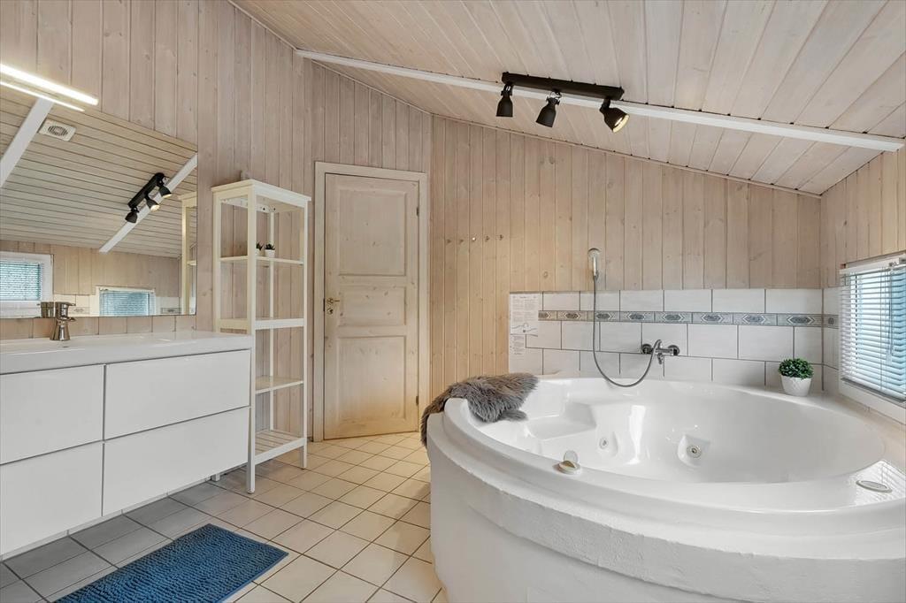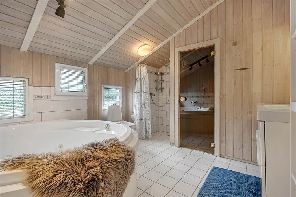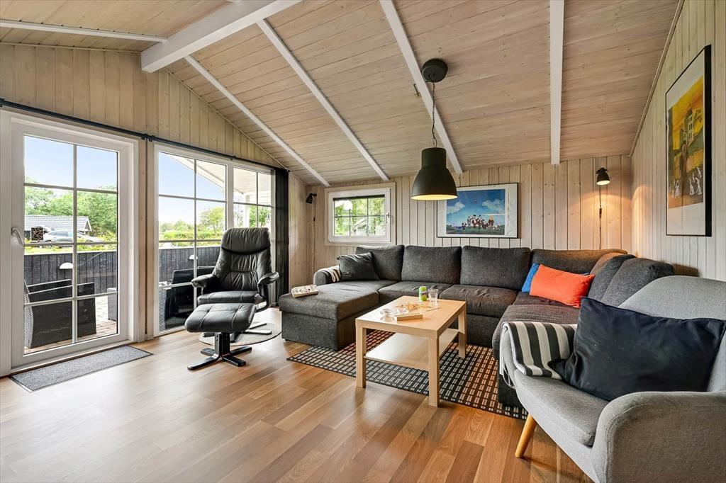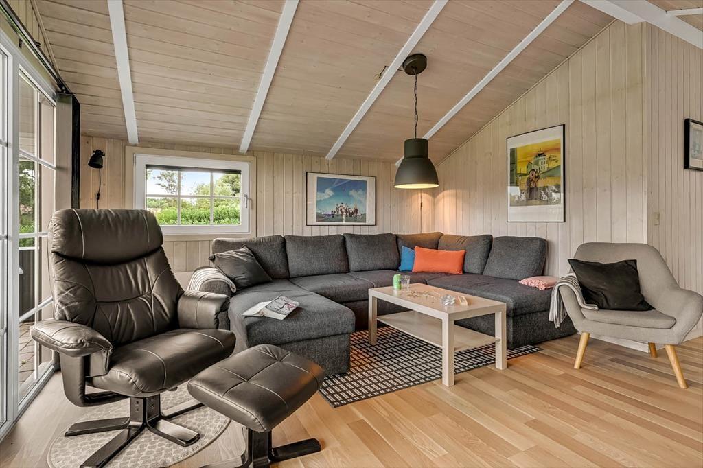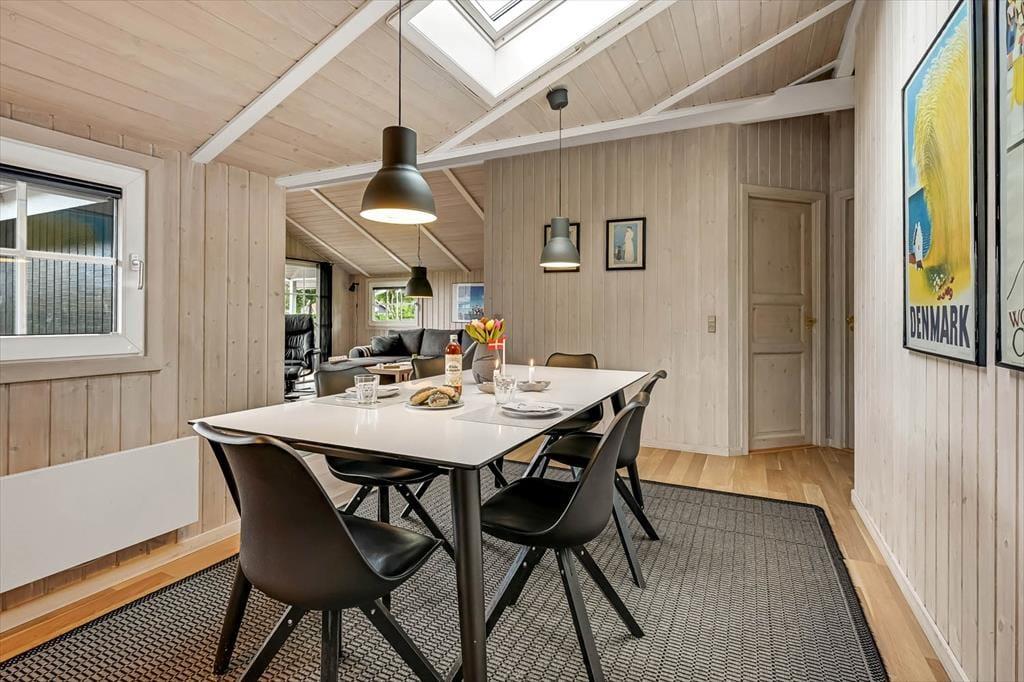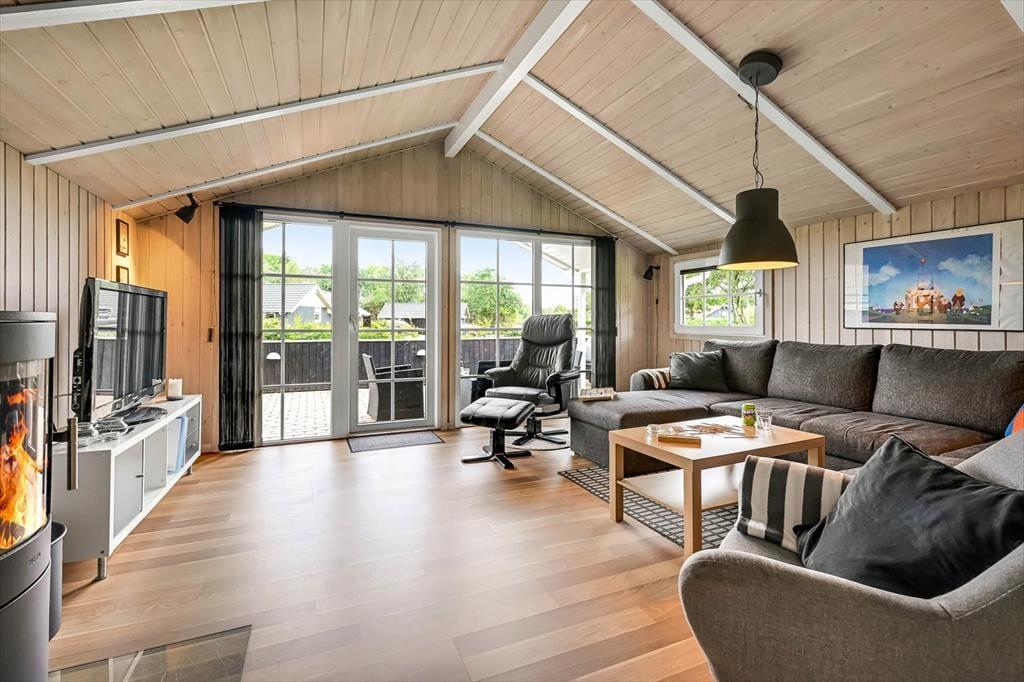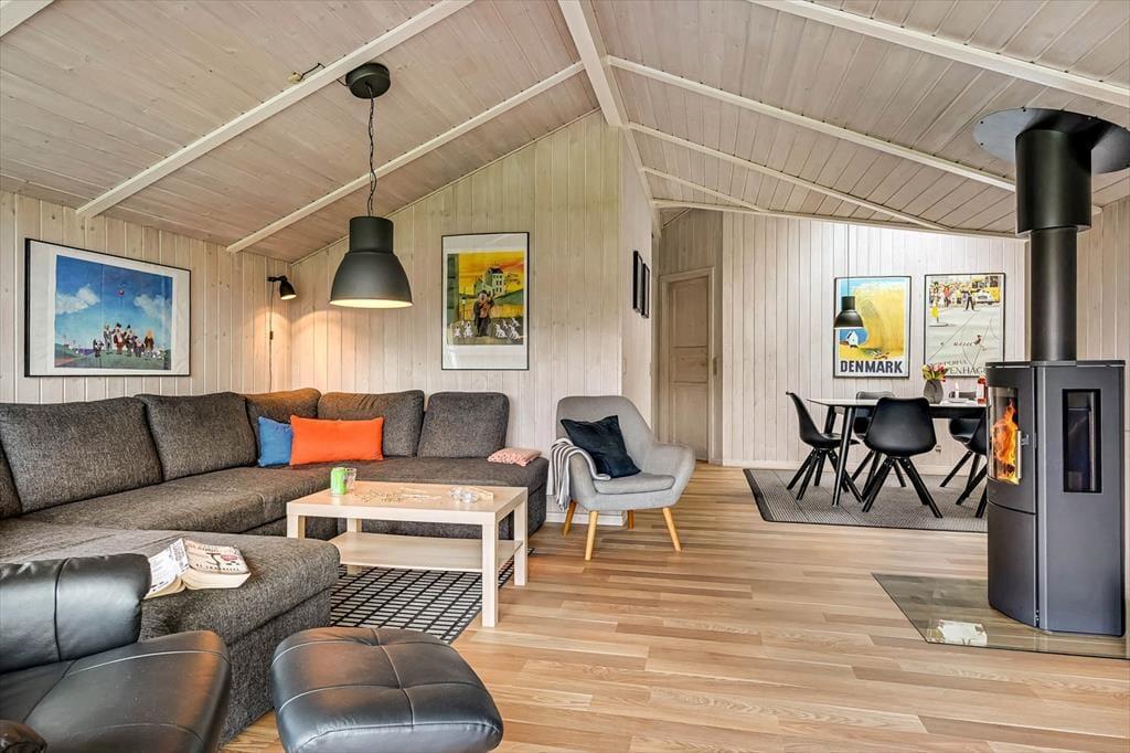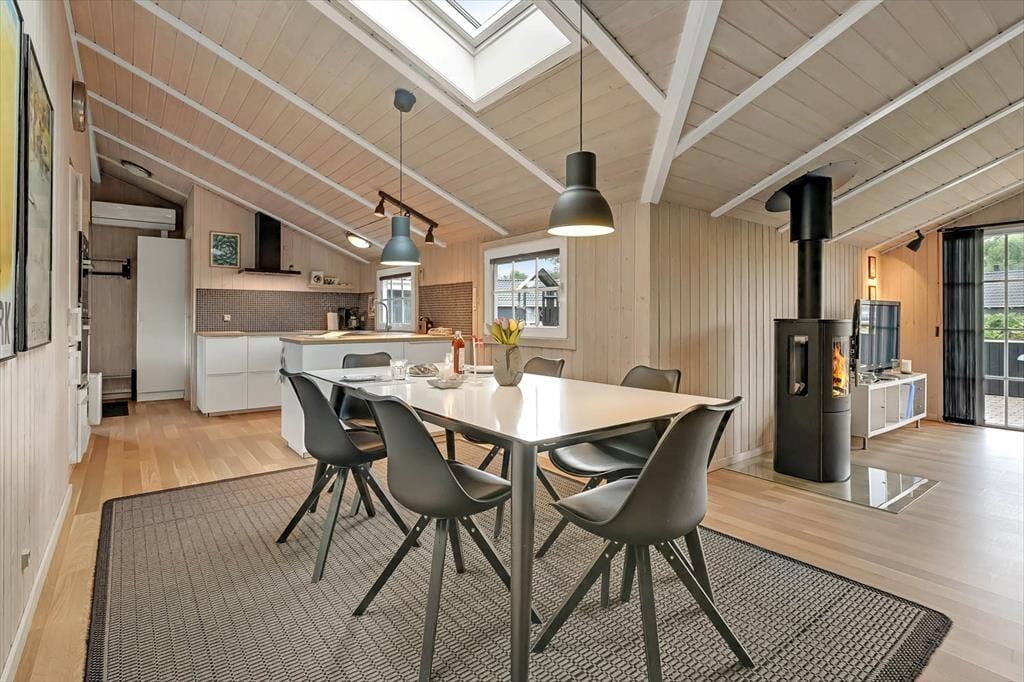 Indenfor møder du en lys og indbydende atmosfære, hvor der er kræset for detaljerne i indretningen. Det veludstyrede køkken ligger i åben forbindelse med opholdsrummet, hvilket giver jer mulighed for at være sammen om madlavning, måltider og hygge, uanset hvor i rummet I befinder jer. I sofahjørnet kan I samle jer til brætspil eller en god film, mens ilden knitrer i brændeovnen og spreder varme og hyggelig stemning. Badeværelset er en sand oase, hvor I kan læne jer tilbage i spabadet og nyde boblernes massage, inden en tur i saunaen fuldender den afslappende ferieoplevelse. Alt i alt danner sommerhuset de perfekte rammer for, at hele familien kan føle sig hjemme og nyde hinandens selskab i en afslappet atmosfære.