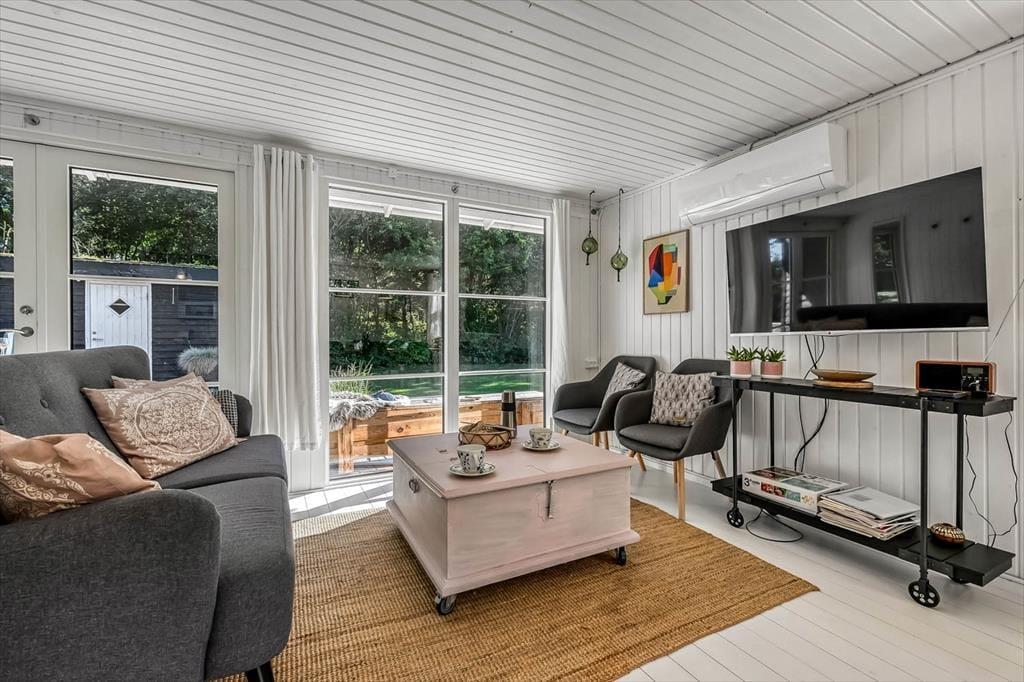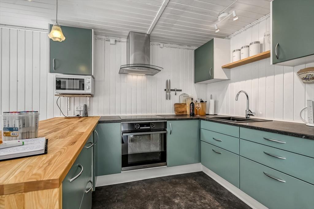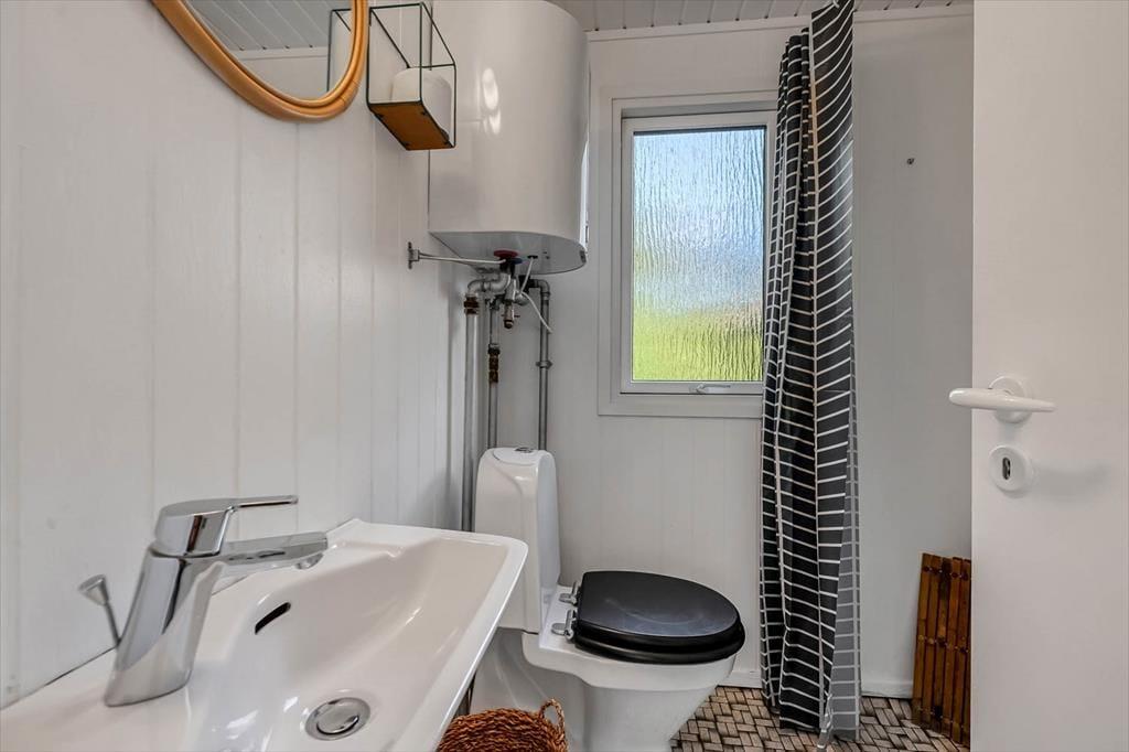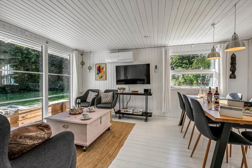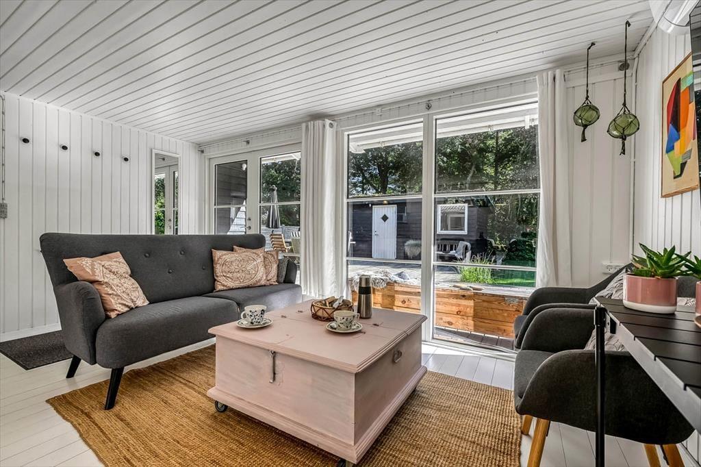 Træd ind i et lyst og imødekommende sommerhus, hvor fokus er på detaljerne og den gode atmosfære. Indretningen er enkel og gennemført, og du fornemmer straks, at her er tænkt over alt fra farvevalg til materialer. I stuen kan du nyde en rolig stund med en kop kaffe i sofaen, mens lyset falder ind gennem de store vinduer og kaster et blødt skær over rummene. Køkkenet ligger i åben forbindelse med opholdsrummet, så du kan følge snakken, mens du laver mad. Stemningen er hjemlig og afslappet, og det lille hus rummer alt, hvad du har brug for til en ferie, hvor roen og nærværet får lov at fylde.
