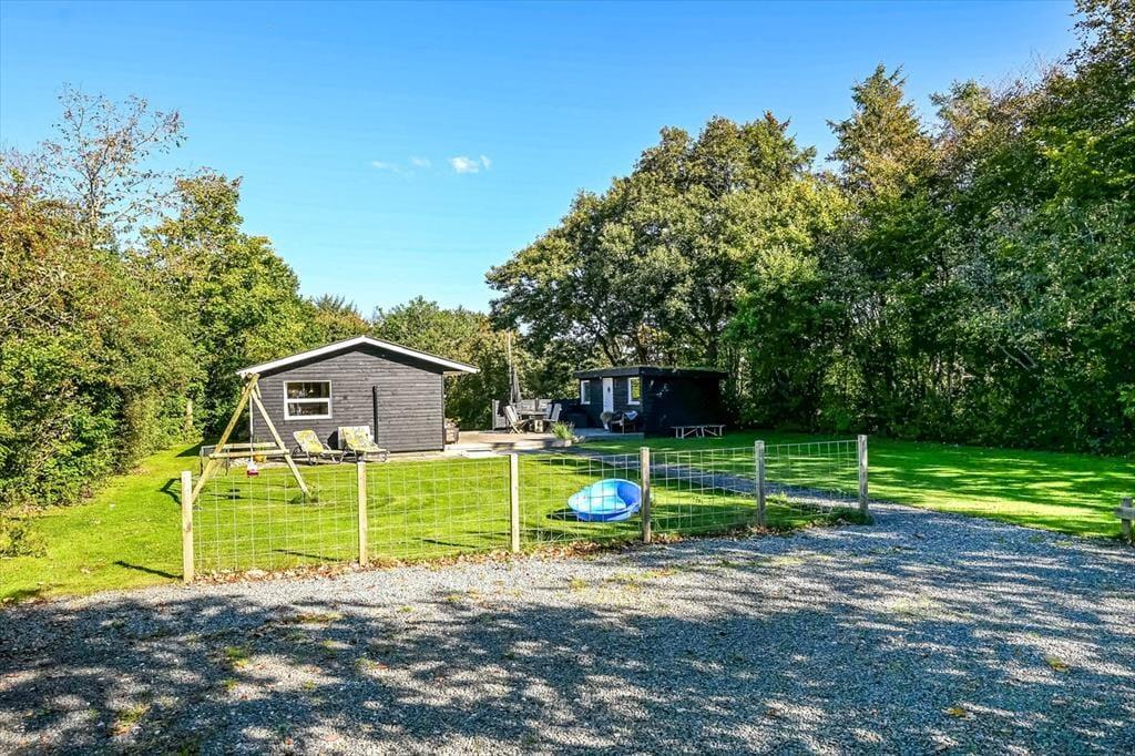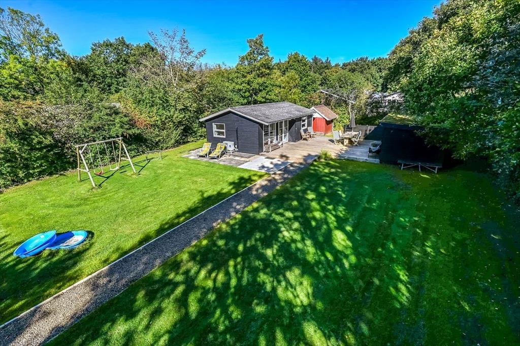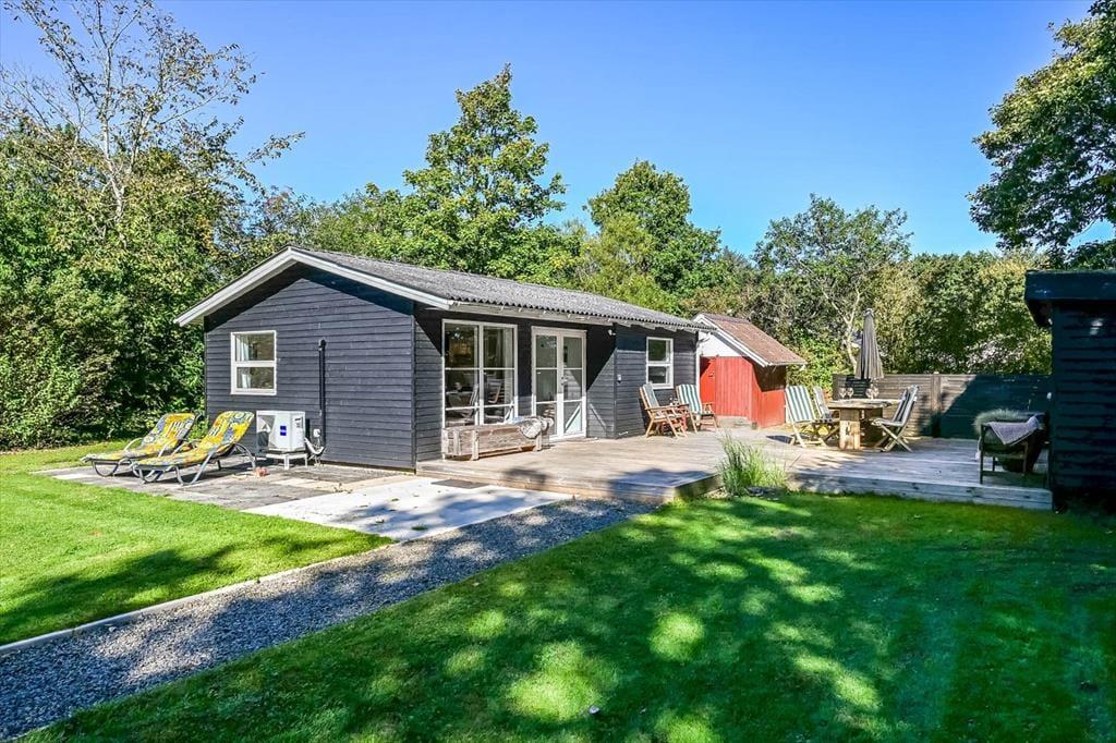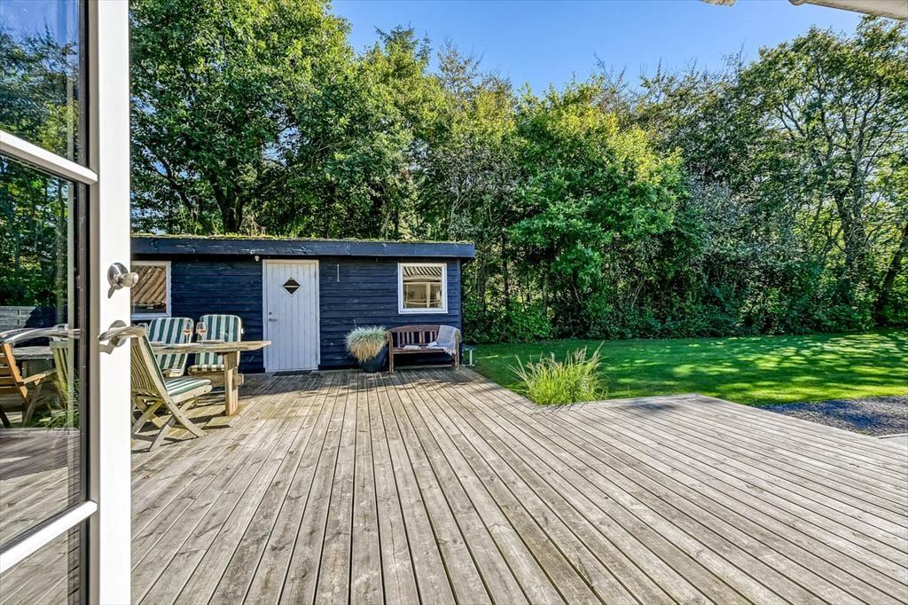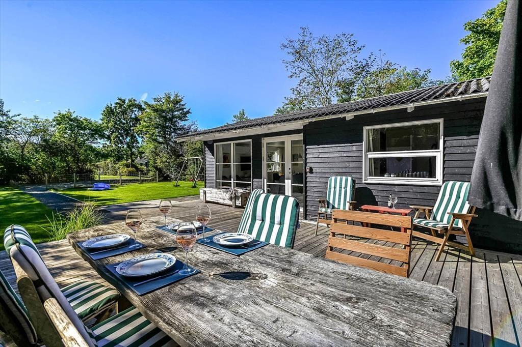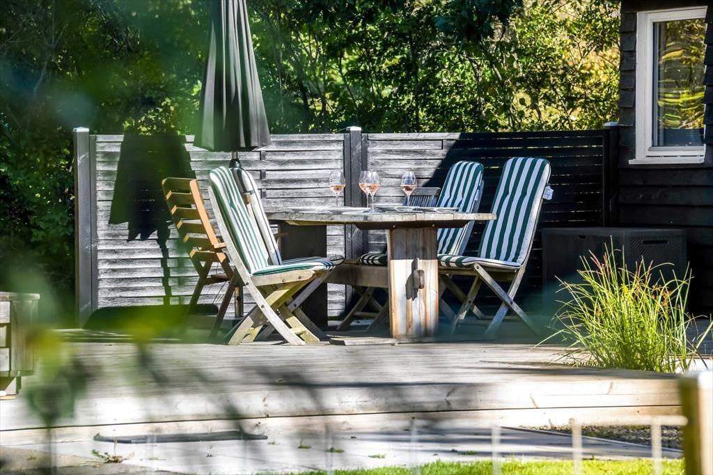 Sommerhuset ligger på en skøn grund med en dejlig træterrasse, der indbyder til lange dage under åben himmel. Her kan du starte morgenen med friskbrygget kaffe og fuglefløjt i baggrunden, eller du kan sætte jer sammen til aftensmad, mens solen går ned over sommerhusområdet. På terrassen er der god plads til at slappe af, uanset om du nyder en stille stund i skyggen eller lader børnene lege på græsset foran. Atmosfæren er rolig og afslappet, og du vil hurtigt opleve, hvordan feriedagene glider ubemærket afsted mellem måltider, solstrejf og latter fra terrassen.