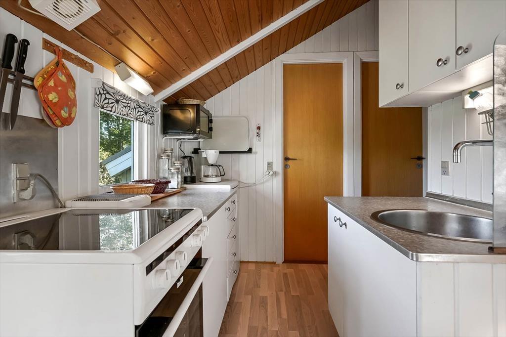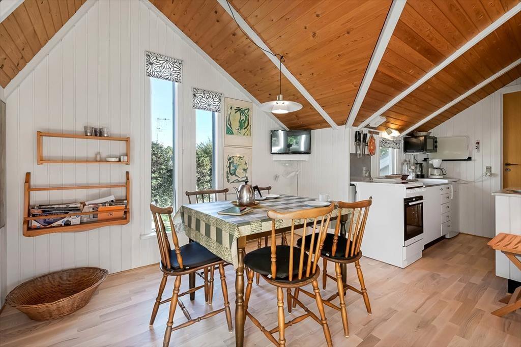 Inde i sommerhuset er stemningen varm og helt nede på jorden – præcis som et klassisk feriehus ved fjorden skal være. De lyse omgivelser, højt til loftet og den rolige indretning gør det let at slappe af fra første øjeblik. Måske bliver spisebordet jeres faste samlingspunkt til lange morgenmadssessioner og brætspil om aftenen, mens stuen indbyder til at krybe sammen med en bog, en kop kaffe eller en serie på skærmen. Køkkenet ligger praktisk placeret, så du stadig er en del af fællesskabet, når aftensmaden simrer – og samtidig kan holde øje med, hvad der foregår ude i haven. Der er tænkt på at skabe en feriebase, der føles afslappet og imødekommende, og både familie, venner og de to medbragte hunde vil hurtigt føle sig hjemme