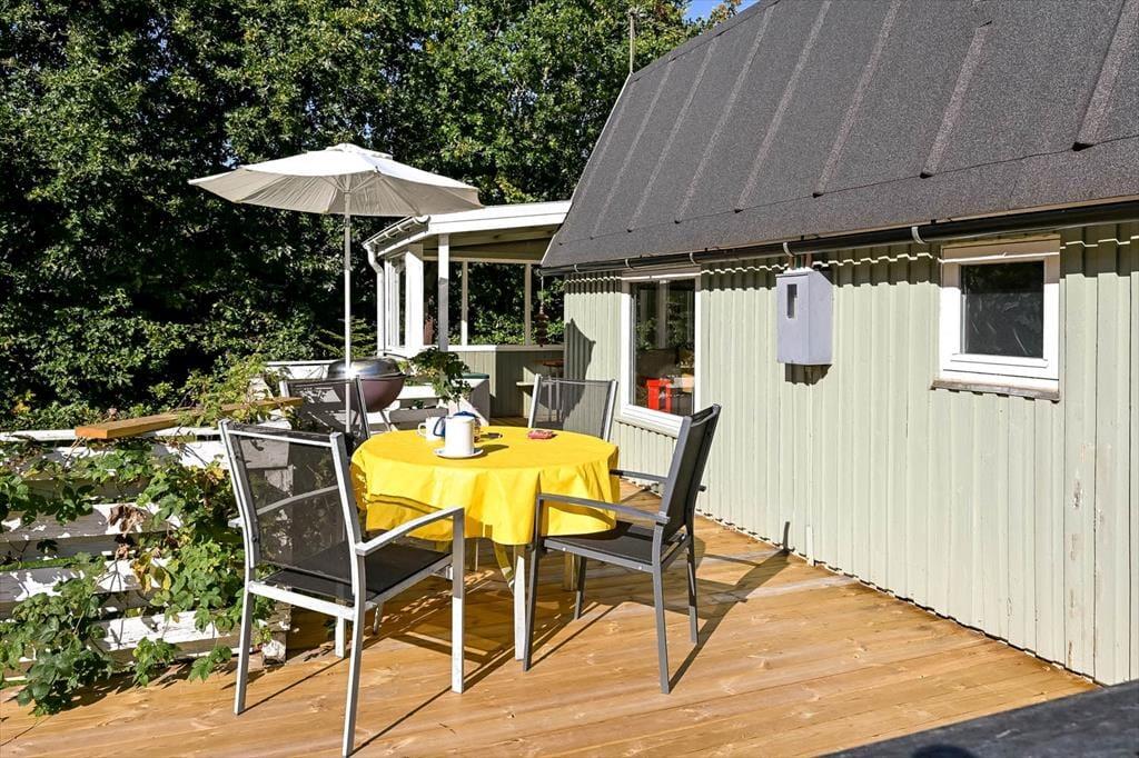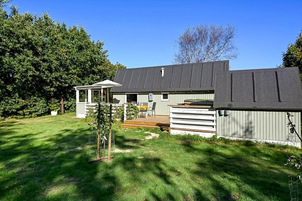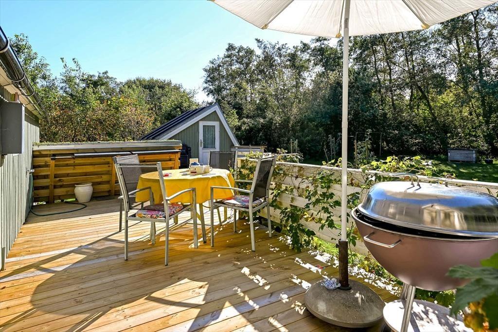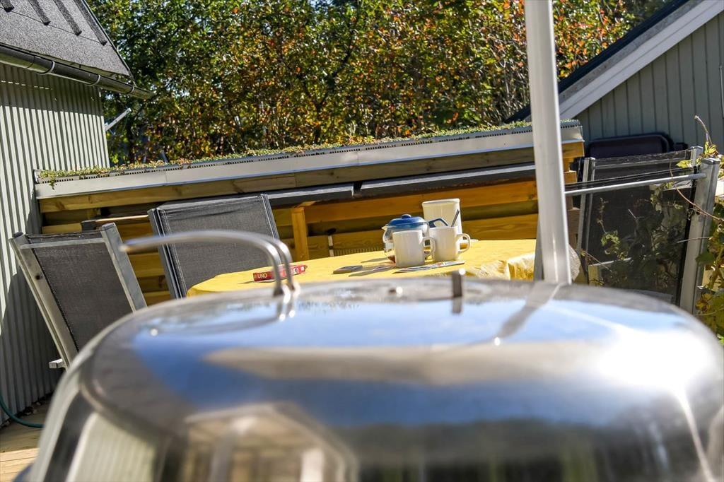 Sommerhuset på Horsfold 39 har en helt særlig styrke: Udearealerne. Her får du en fredelig have, hvor fuglesang og sus i trætoppene udgør baggrundsmusikken til feriedagene. Den nye træterrasse fra 2025 giver en fantastisk ramme om alt det, man forbinder med sommerhuslivet – fra rolige morgener med friskbrygget kaffe til lune aftener med lækker mad, og tiden står lidt stille. Terrassen er placeret, så du både kan finde sol og skygge i løbet af dagen, og med den dejlige og overdækkede hyggekrog får man lyst til at bruge hele dagen udenfor. Haven indbyder til afslapning i et helt roligt tempo. Måske finder børnene et favoritspot til leg på græsset, eller måske forsvinder I bare alle ind i den særlige sommerferiestilhed, som kun en velafskærmet have kan give.