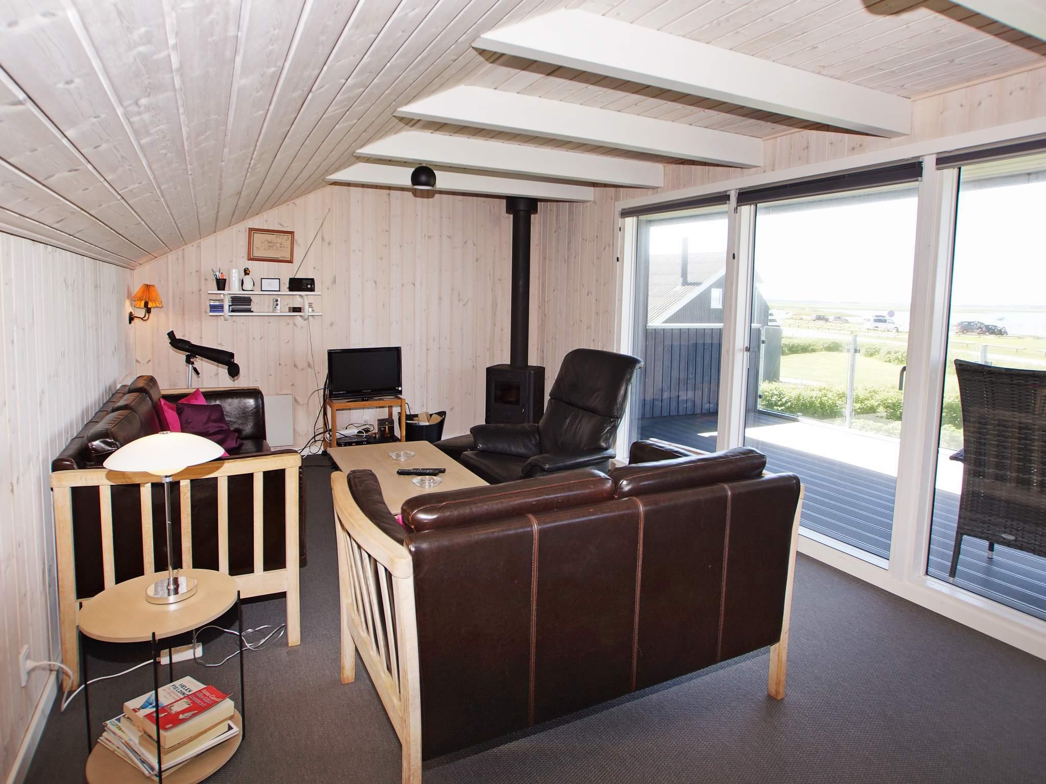 Dette lyse og velindrettede sommerhus har en enestående placering med fjorden som nærmeste nabo. Allerede fra stueplan, hvor spisepladsen ligger, kan I nyde udsigten over vandet – men det er fra førstesalen, at det virkelig folder sig ud: en imponerende panoramaudsigt, hvor I på klare dage kan skimte både Ringkøbing by og klitterne ved Vesterhavet.