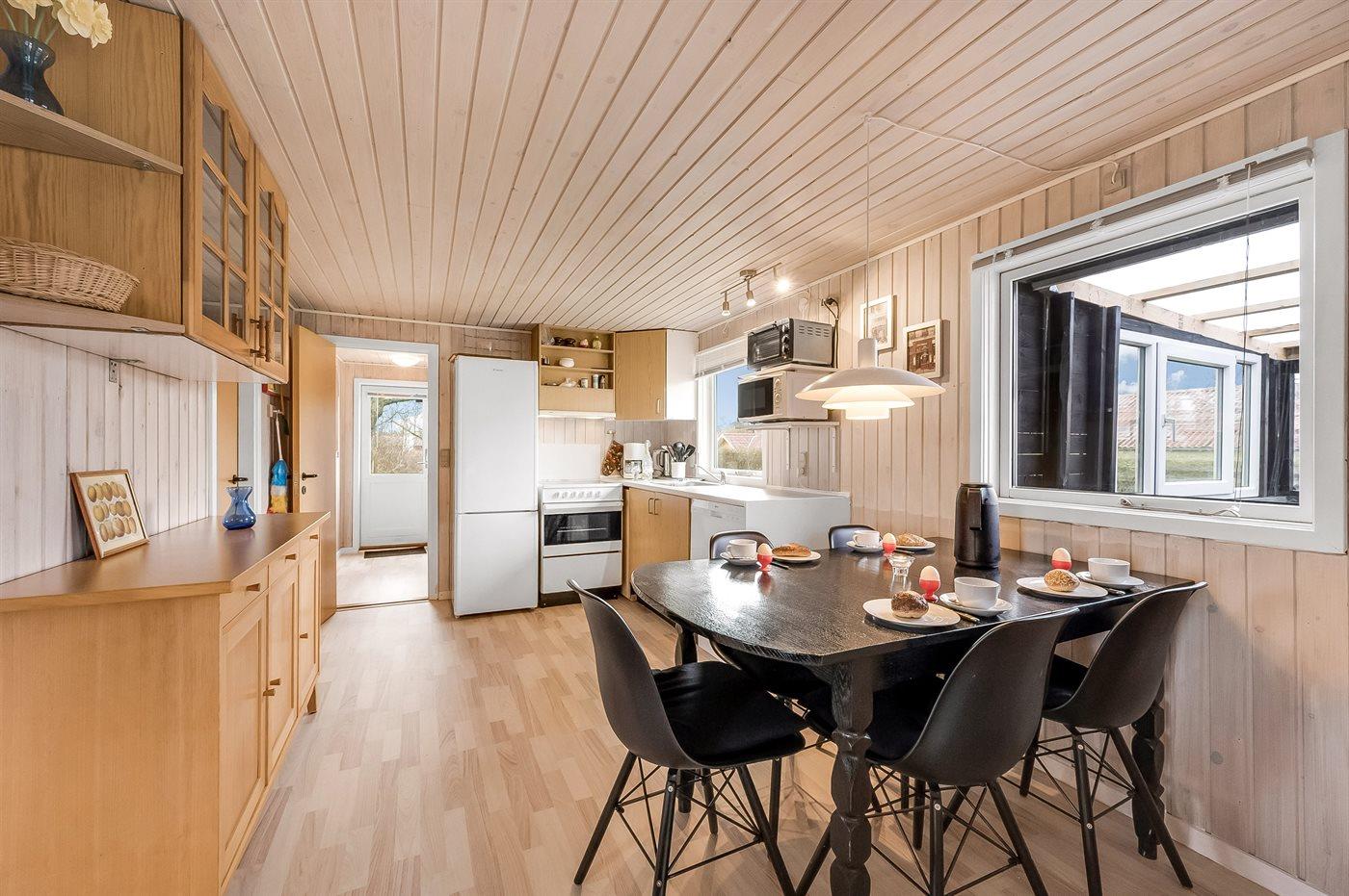 Køkkenet er udstyret med 1 køleskab. Der er 4 elkogeplader, miniovn, varmluftovn, mikrobølgeovn samt opvaskemaskine.