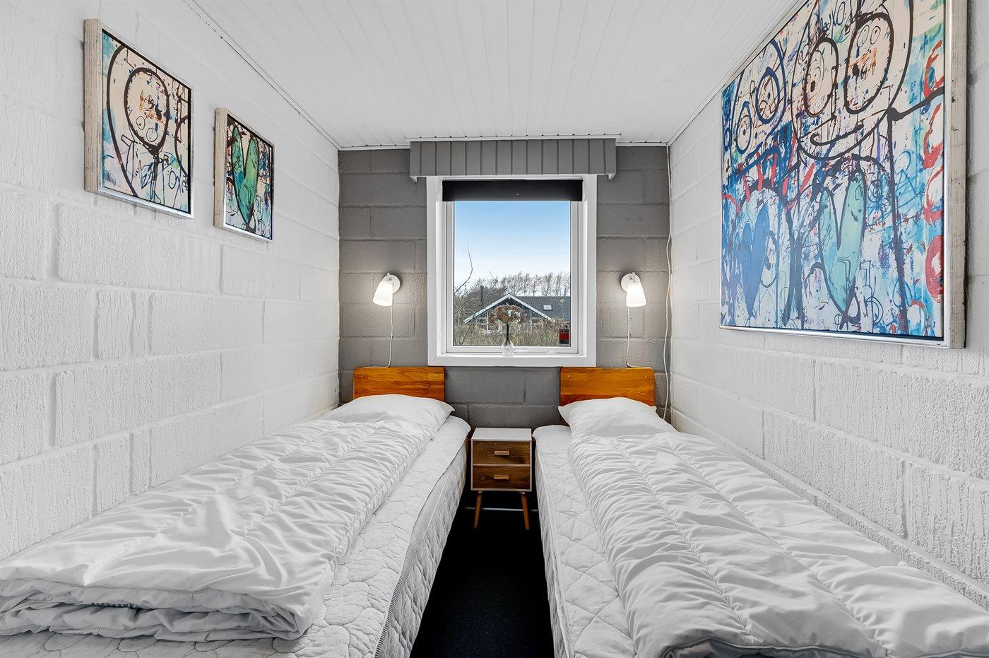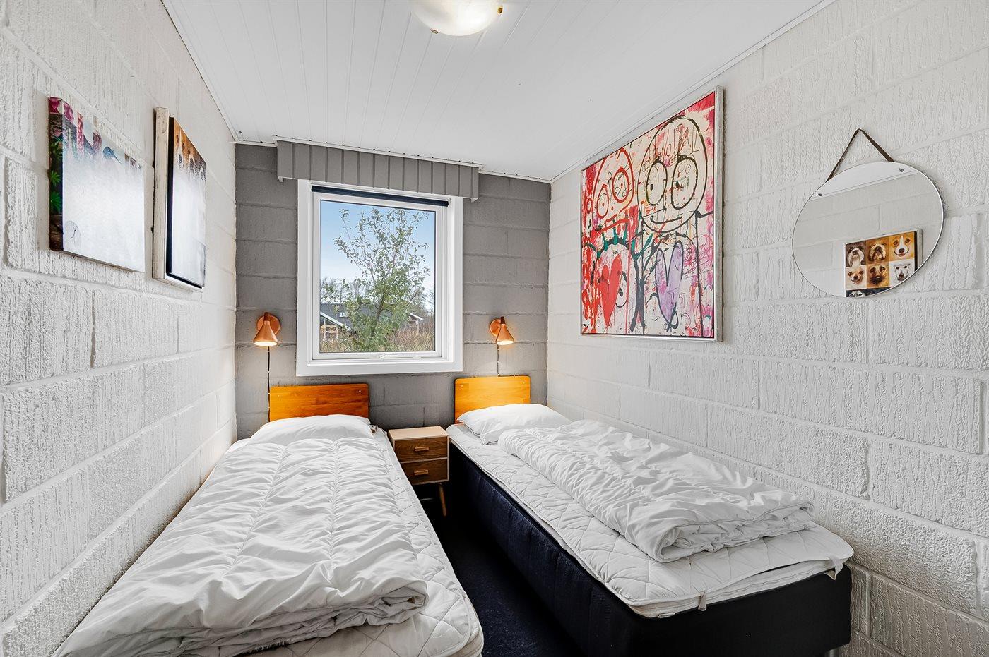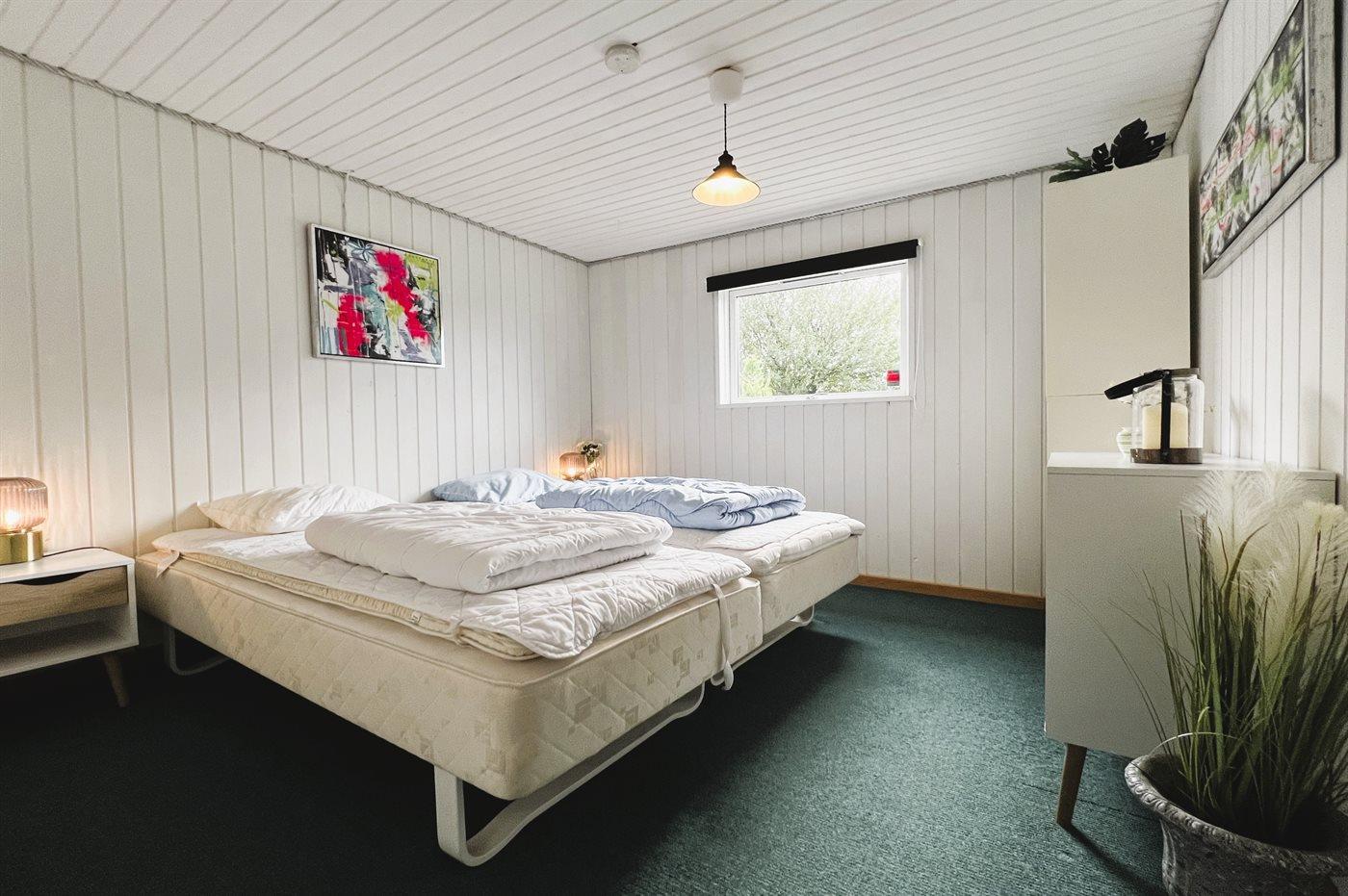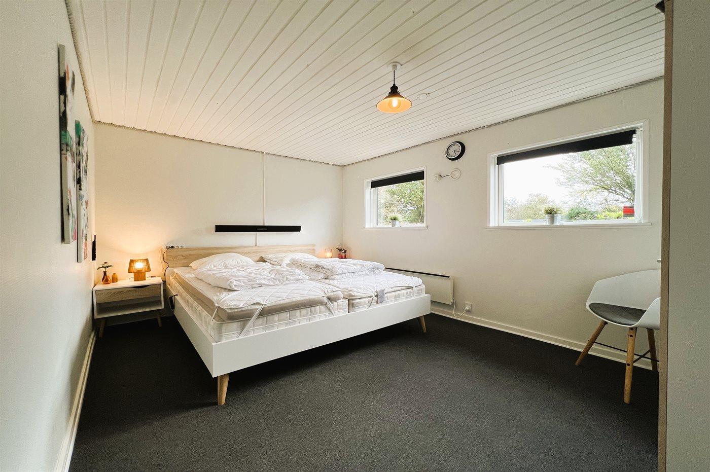 Der er i alt 4 soveværelser. Sovepladserne fordeler sig på: 4 sovepladser i dobbeltsenge. 2 sovepladser i enkeltsenge.2 sovepladser i elevationssenge.