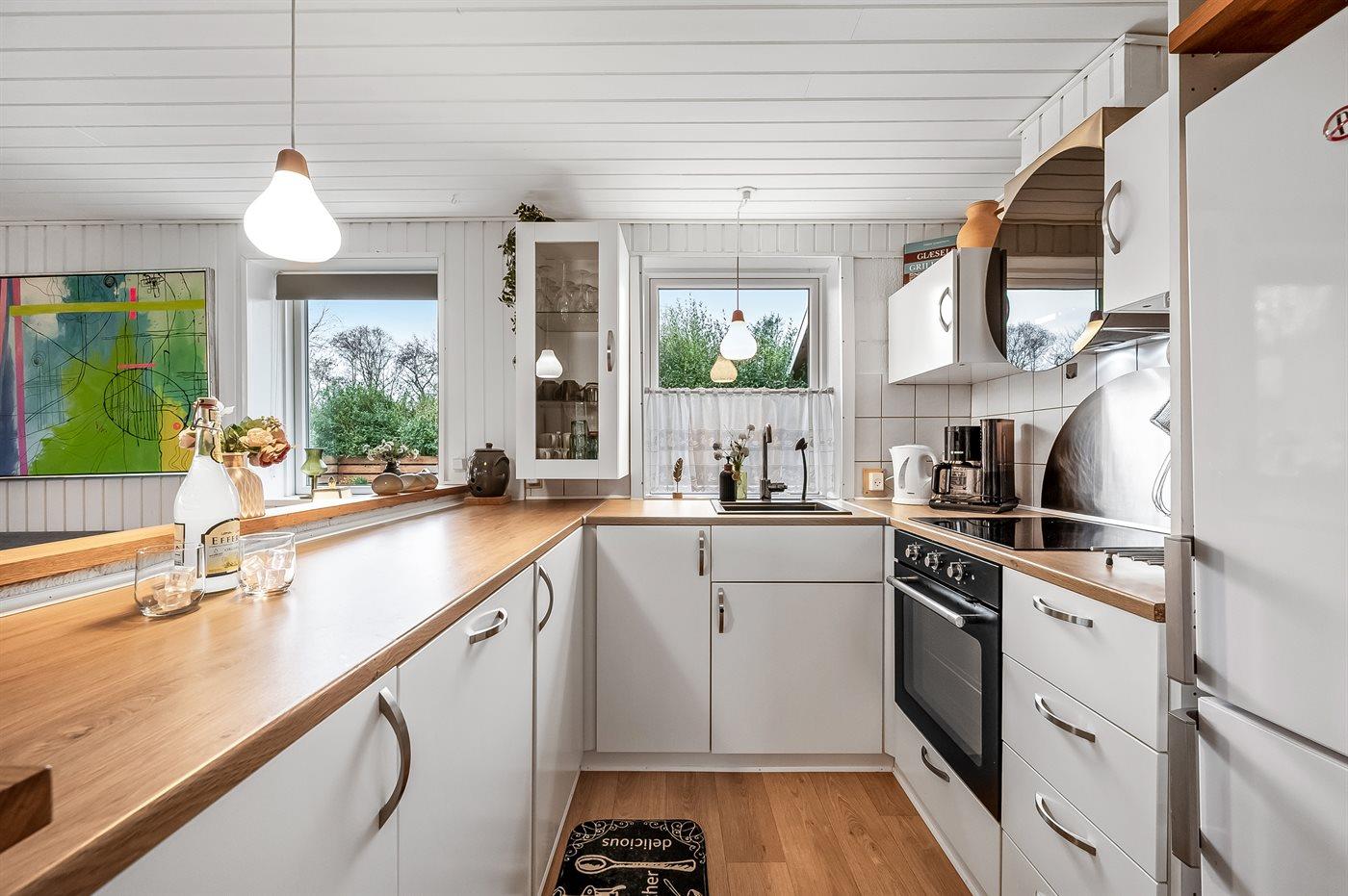 Køkkenet er udstyret med 1 køleskab. Der er 4 keramiske kogeplader, varmluftovn, mikrobølgeovn samt opvaskemaskine.