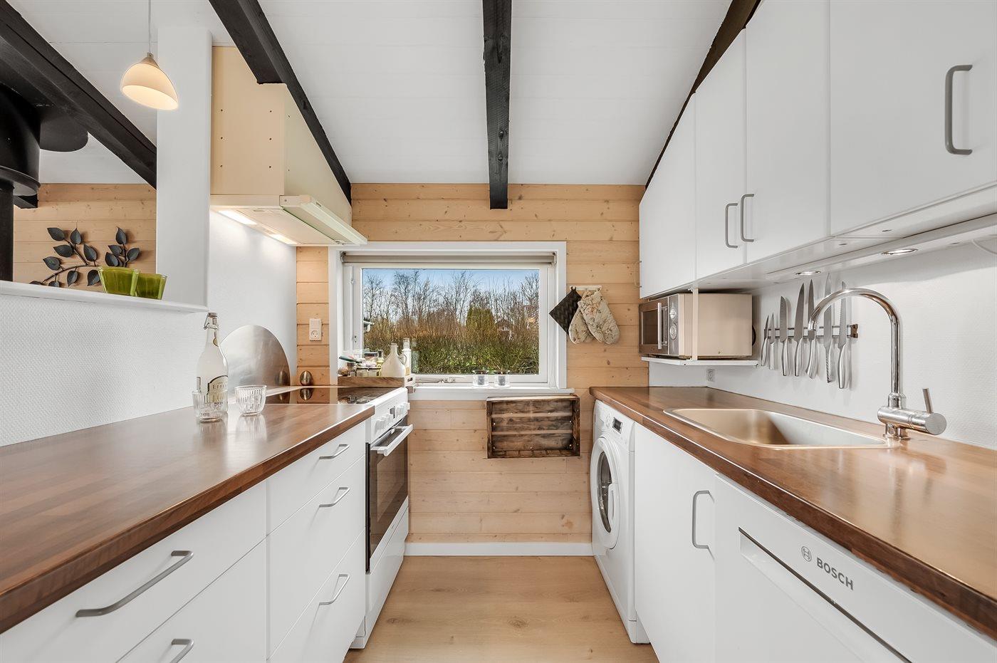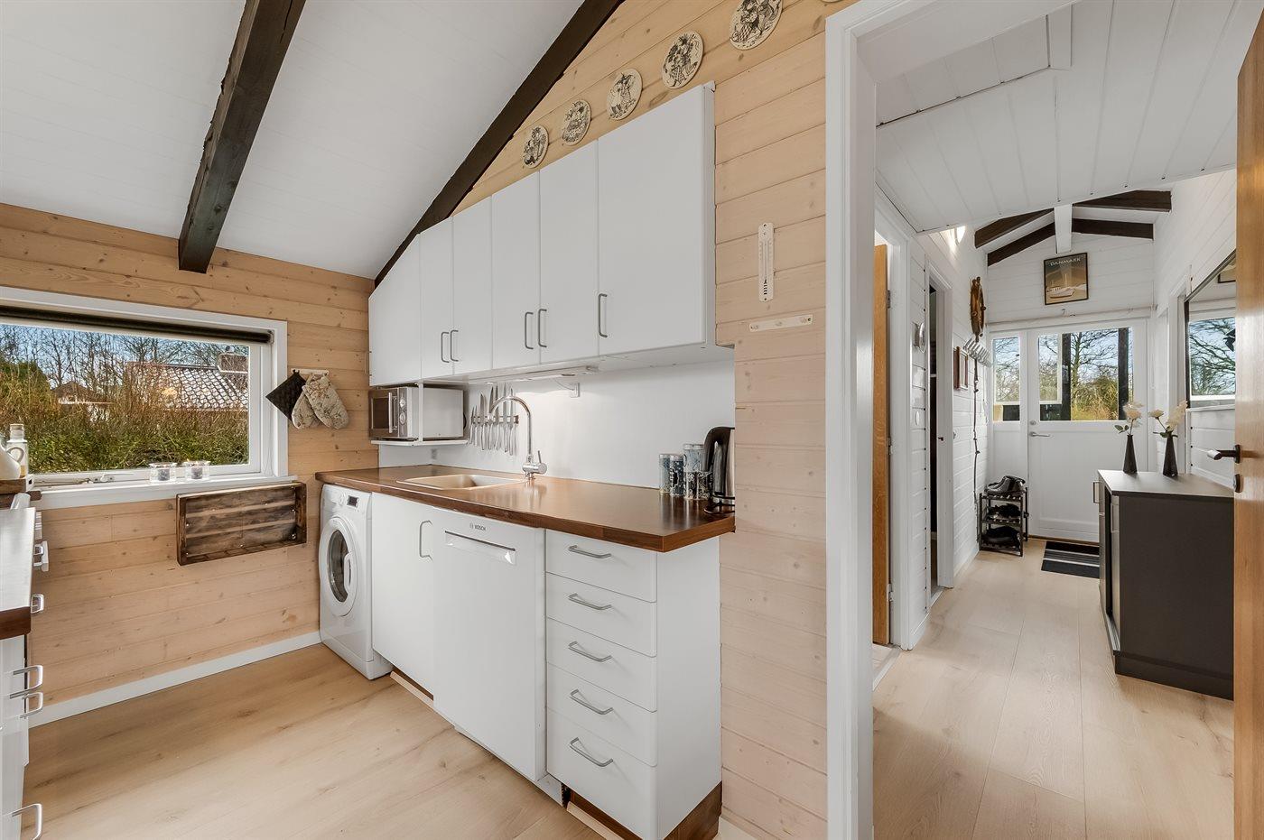 Køkkenet er udstyret med 1 køleskab. Der er 4 keramiske kogeplader, bageovn, mikrobølgeovn samt opvaskemaskine.