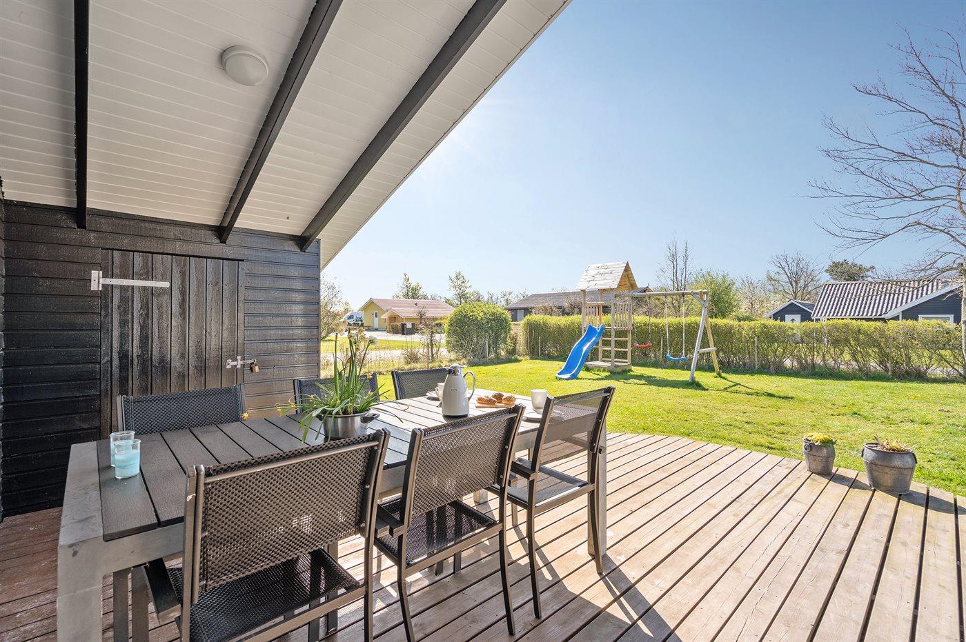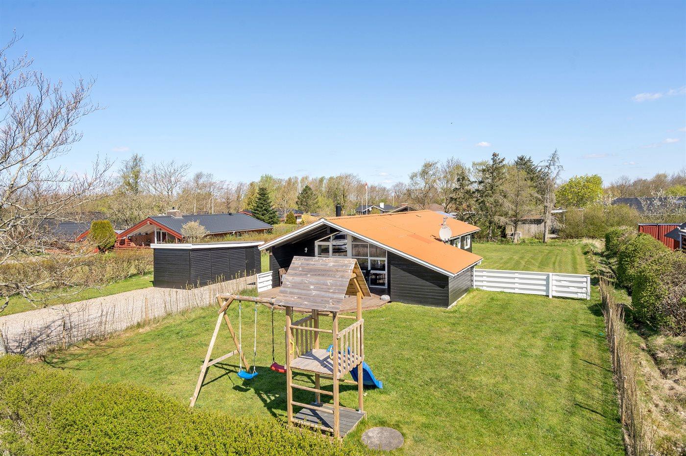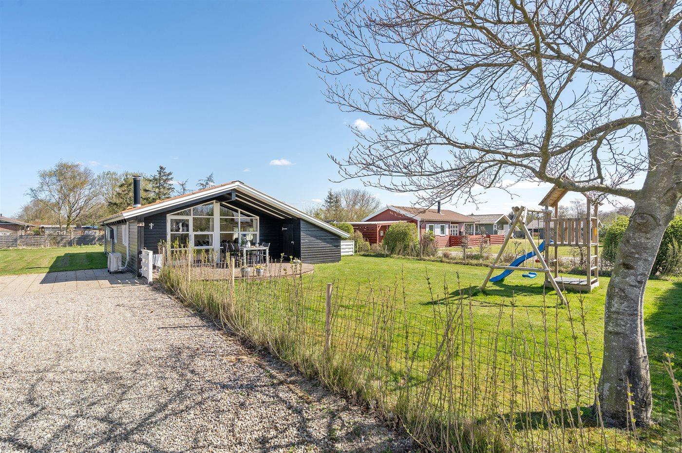 Ferieboligen er beliggende på en 1000 m² stor havegrund. Grunden er indhegnet. Der er 7200 m til havet. Der er 800 m til fjorden. Nærmeste forretning er beliggende i en afstand af 800 m. Til ferieboligen hører 25 m² terrasseareal. Desuden er der 30 m² overdækket terrasse. Der er redskabsrum. Gynge. Sandkasse. Rutchebane. Der er installeret stik til opladning af elbil. Type 2 stik. Parkering ved ferieboligen.