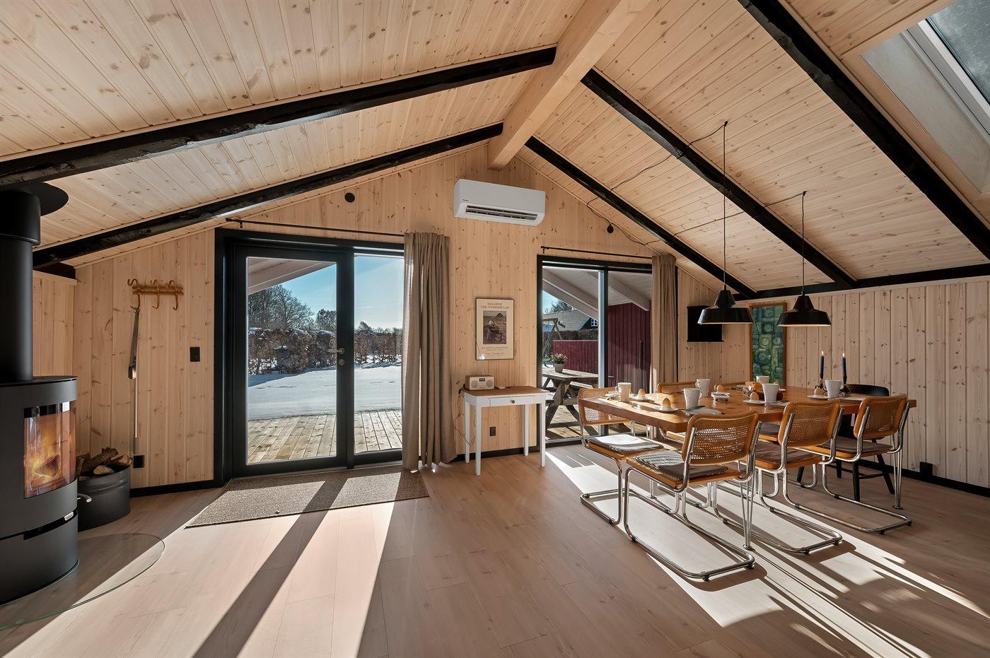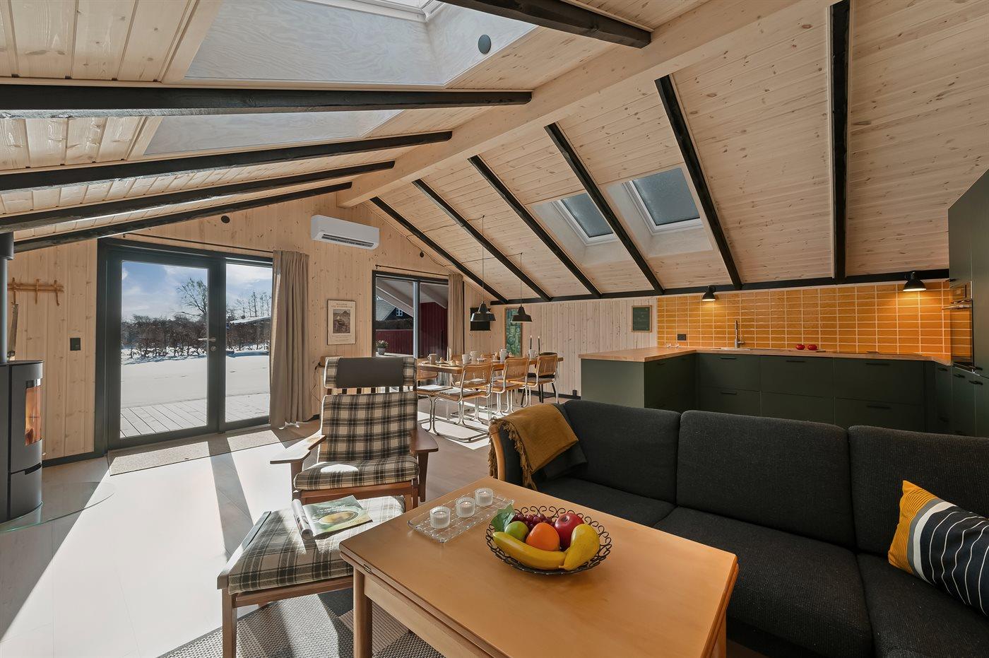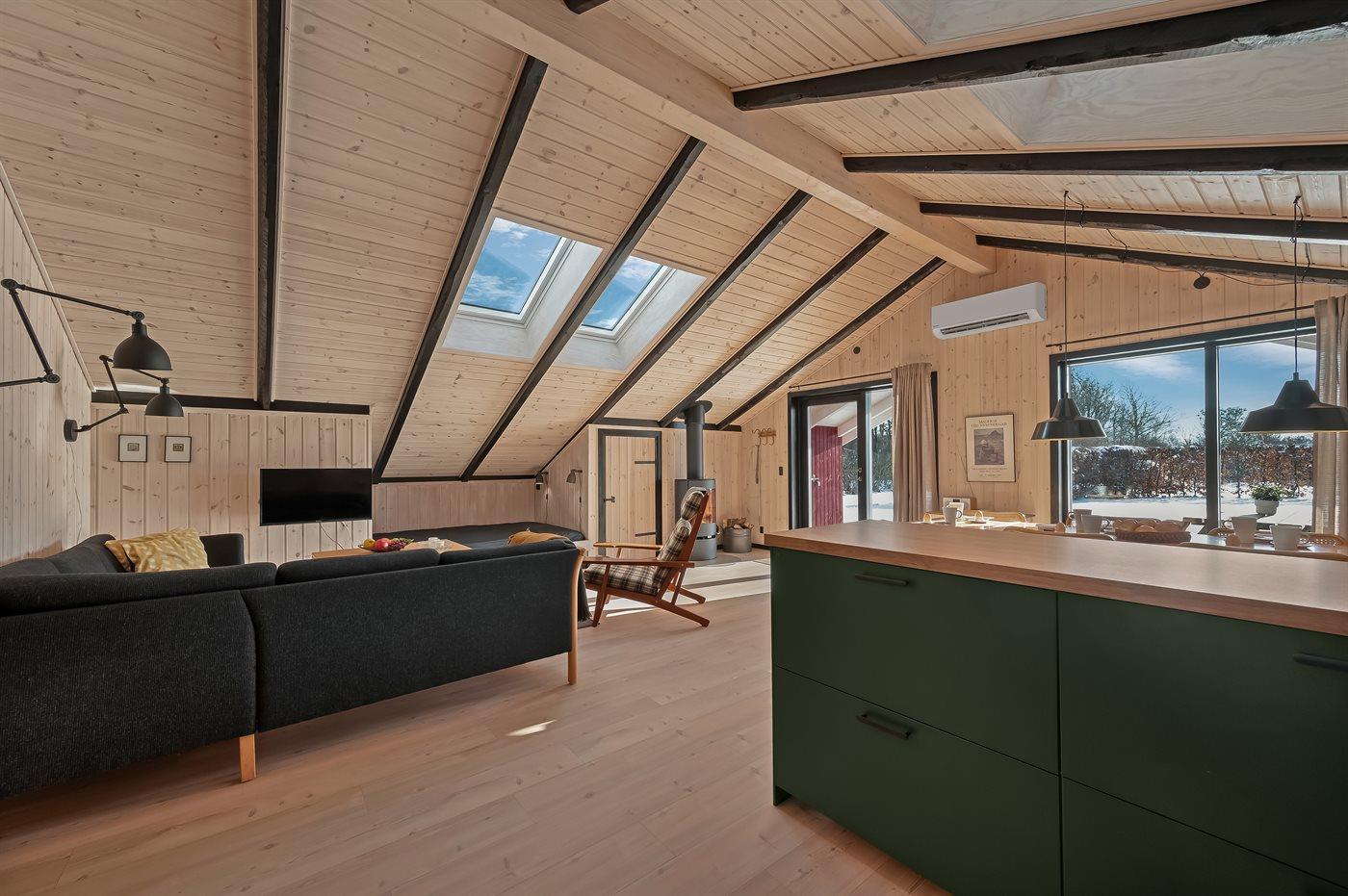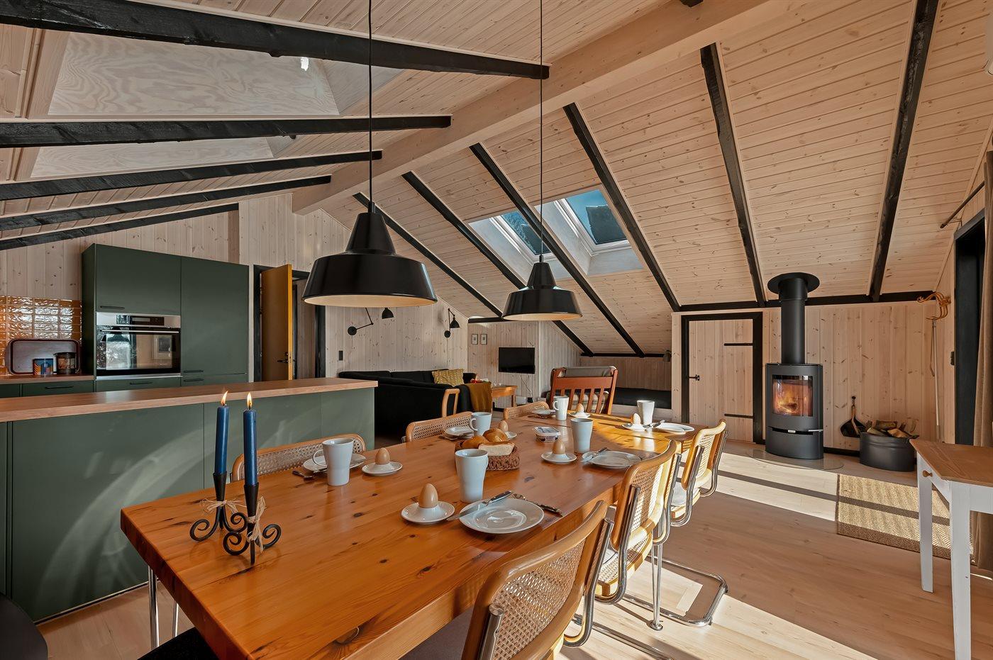 I det nye (2026) og smukt indrettet køkken-alrum er der god plads til at hjælpe hinanden med madlavningen, og når der skal slappes af, kan I slænge jer i sofaerne eller i den hyggelige alkove, mens brændeovnen knitrer i baggrunden.