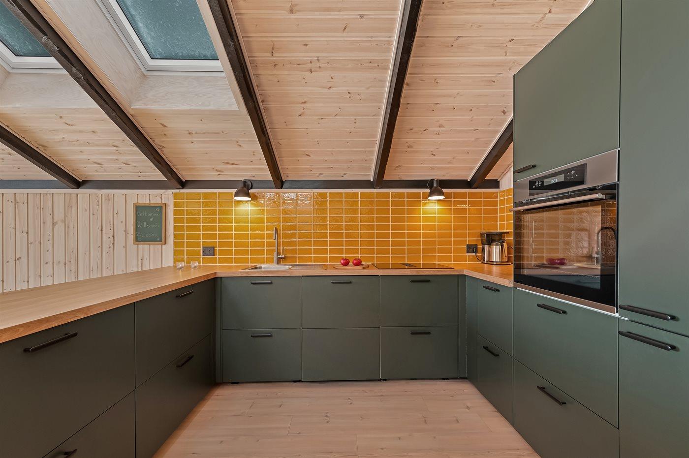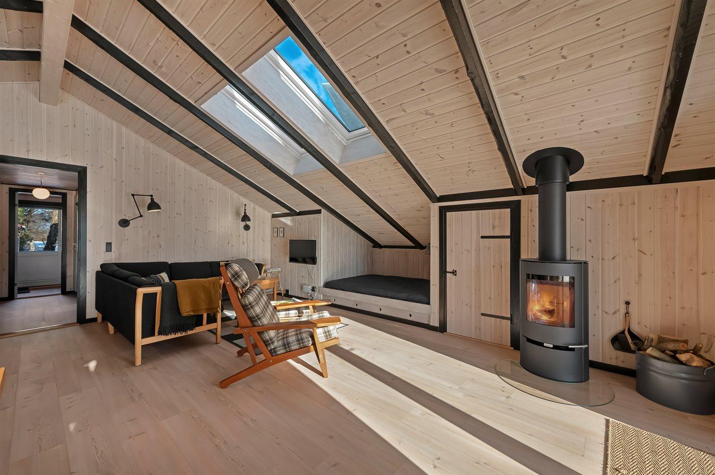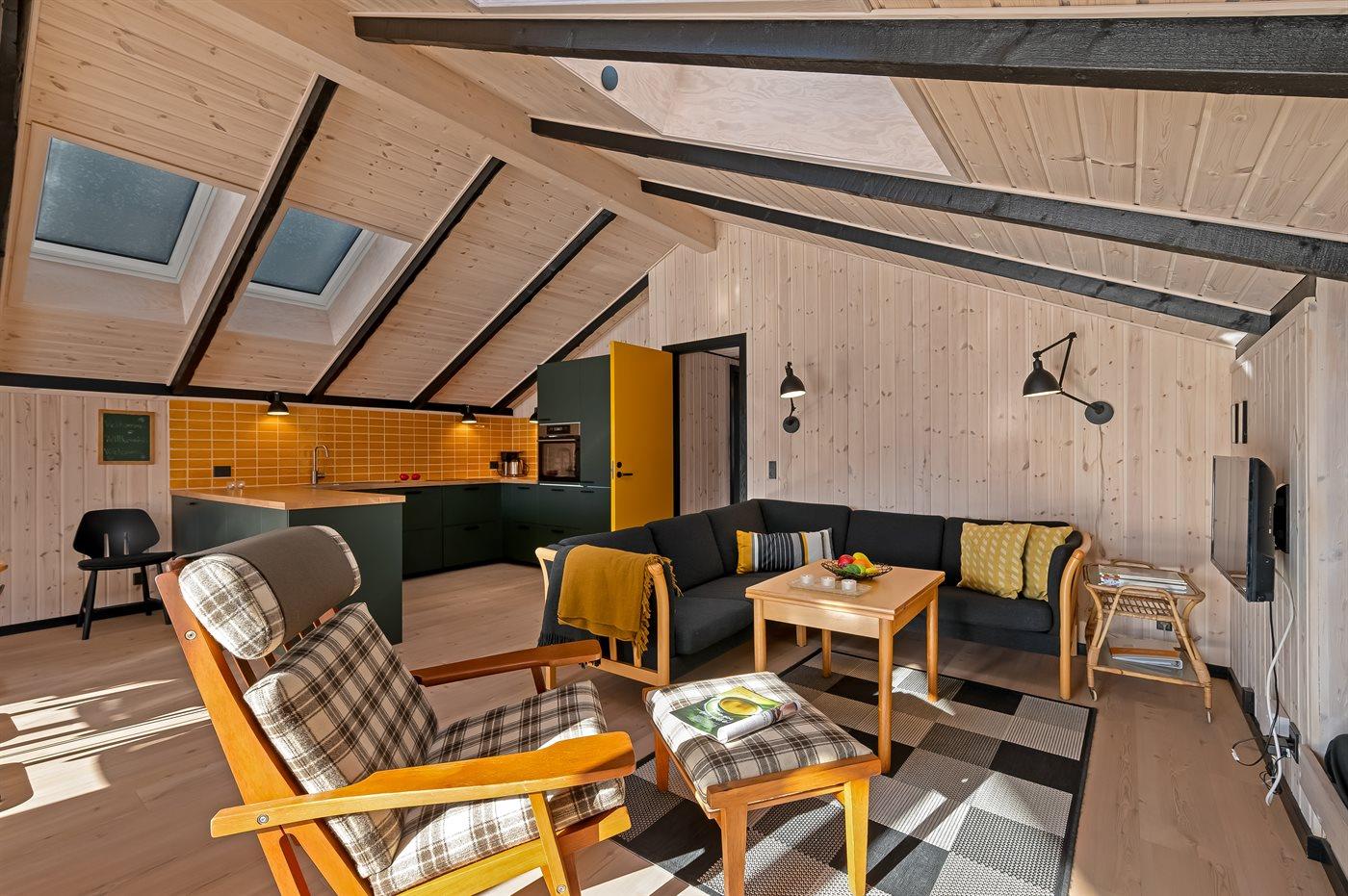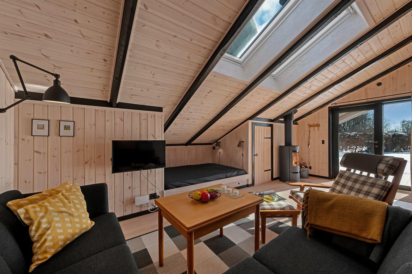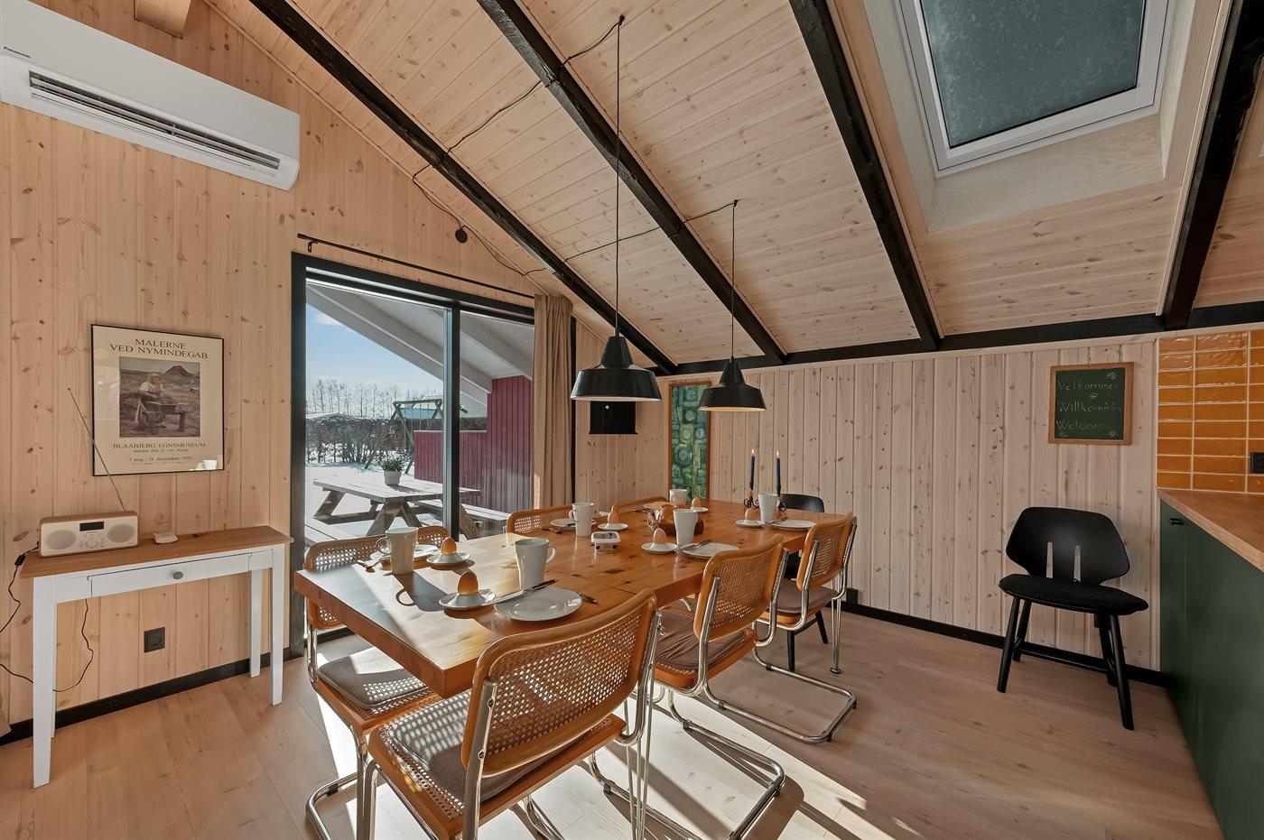 I det nye (2026) og smukt indrettet køkken-alrum er der god plads til at hjælpe hinanden med madlavningen, og når der skal slappes af, kan I slænge jer i sofaerne eller i den hyggelige alkove, mens brændeovnen knitrer i baggrunden.