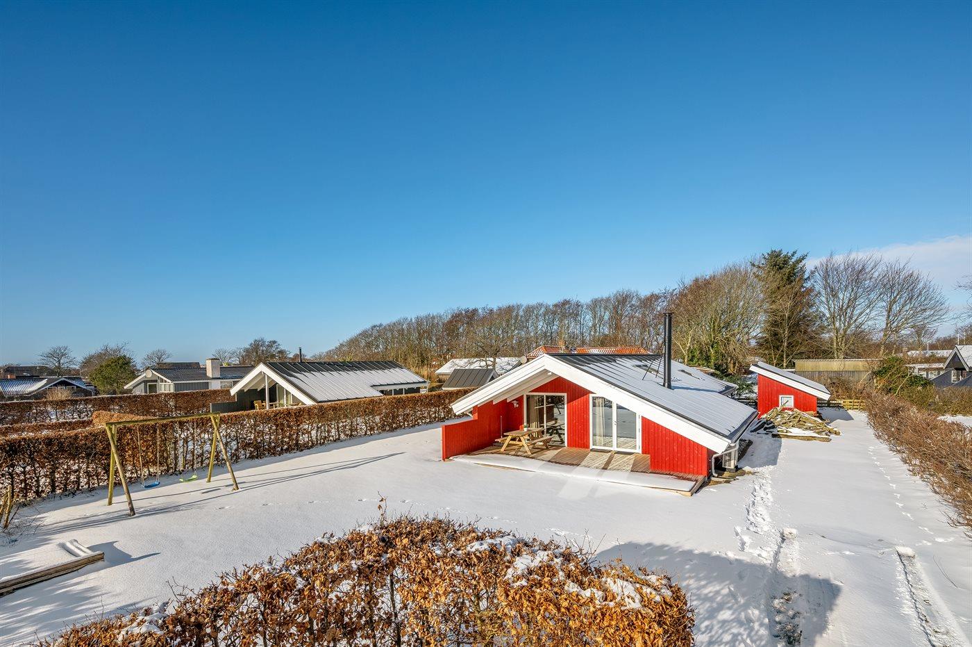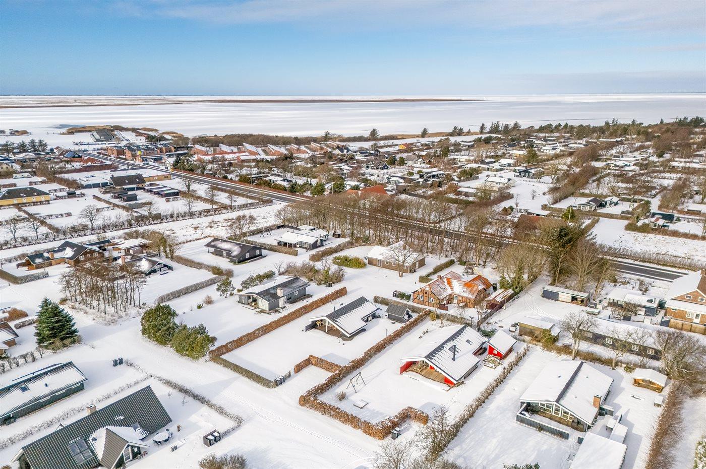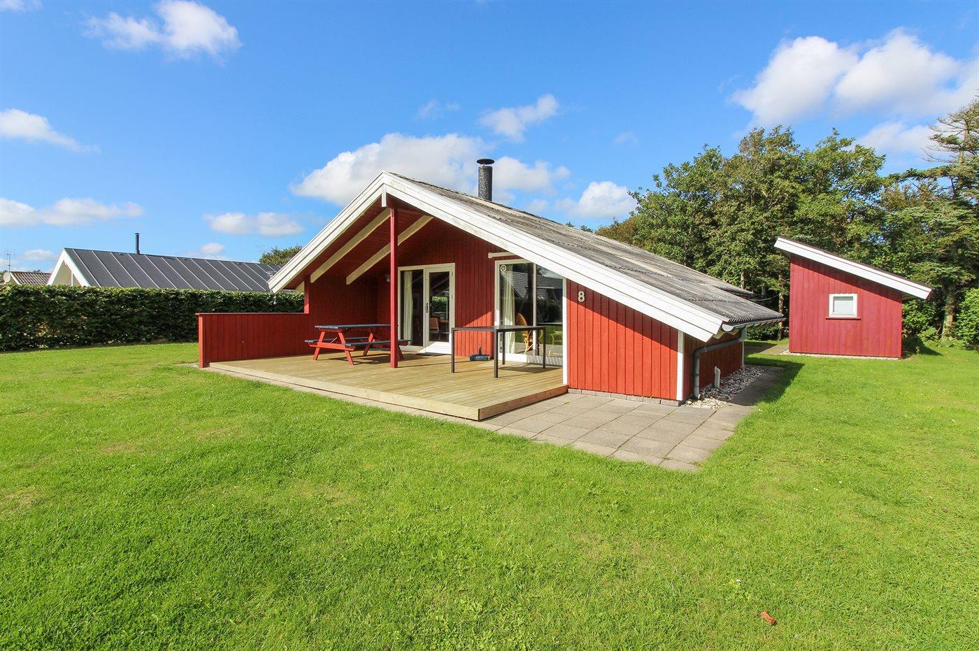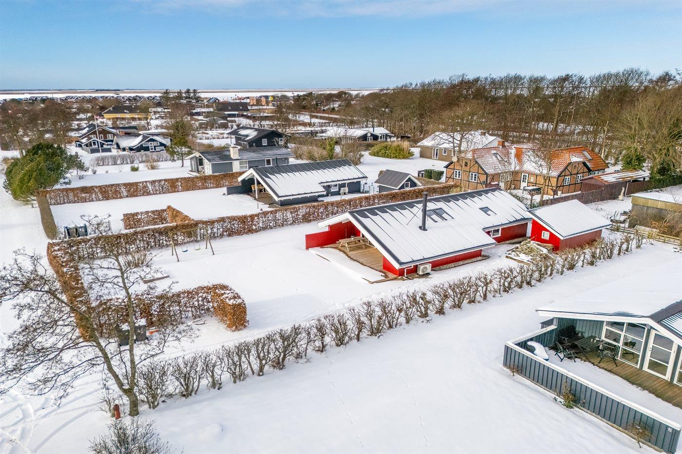 Ferieboligen er beliggende på en 720 m² stor Der er 7700 m til havet. Der er 450 m til fjorden. Nærmeste forretning er beliggende i en afstand af 200 m. Til ferieboligen hører 15 m² terrasseareal. Desuden er der 20 m² overdækket terrasse. Der er redskabsrum. Gynge. Sandkasse. Parkering ved ferieboligen.