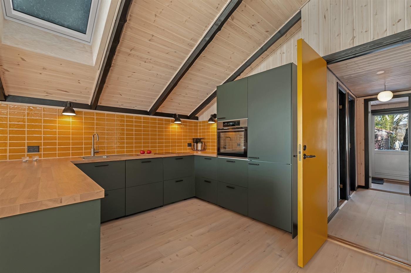 Køkkenet er udstyret med 1 køleskab. Der er 4 induktionskogeplader med indbygget emhætte (starter automatisk), varmluftovn, mikrobølgeovn samt opvaskemaskine.