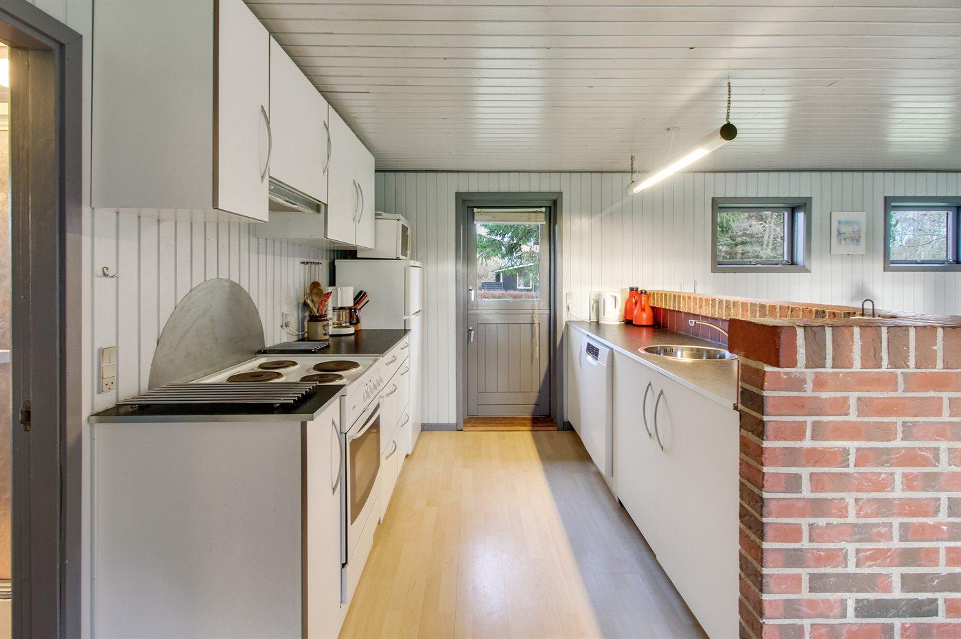 Køkkenet er udstyret med 1 køleskab. Der er 4 elkogeplader, bageovn, mikrobølgeovn samt opvaskemaskine.