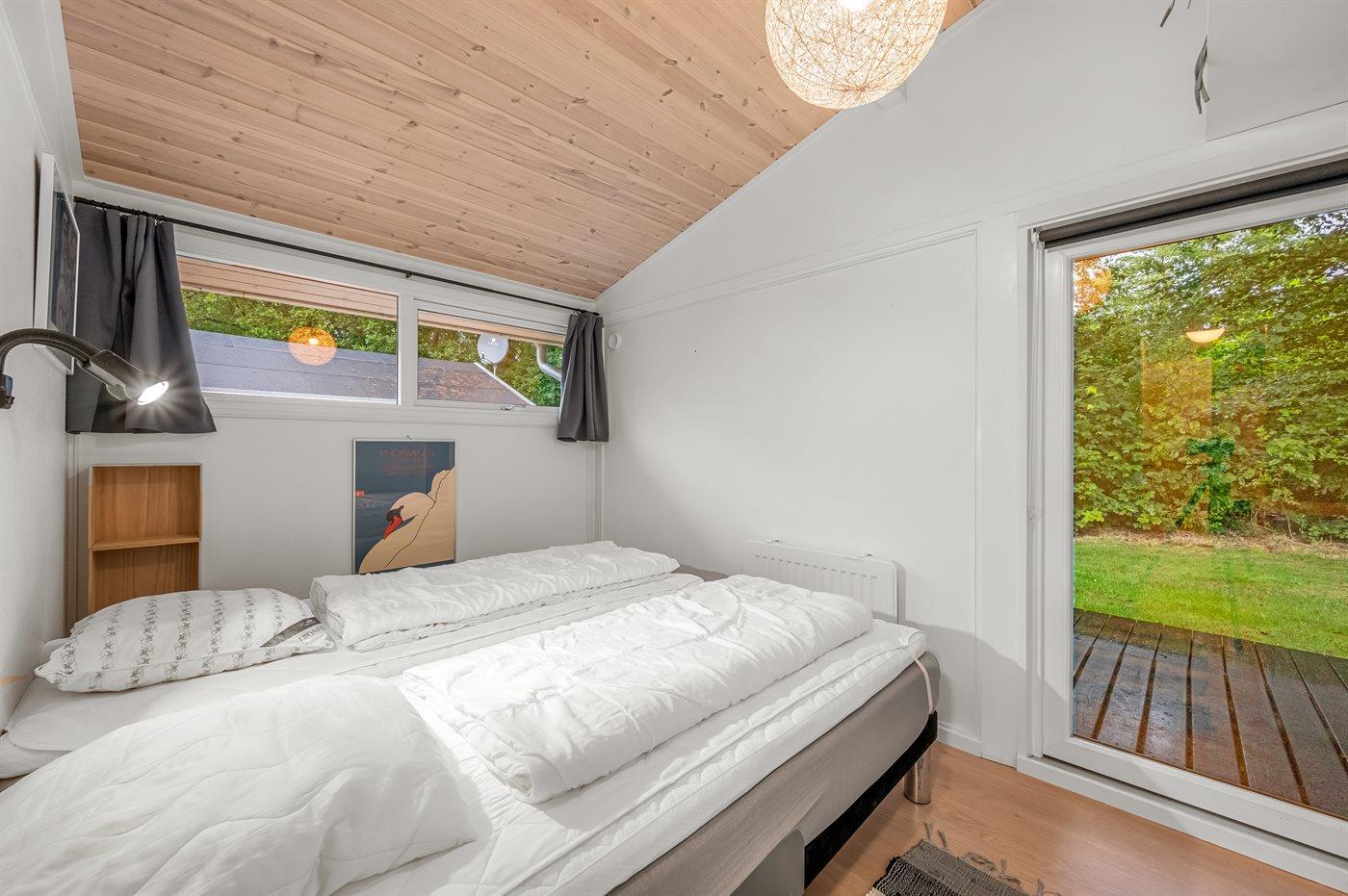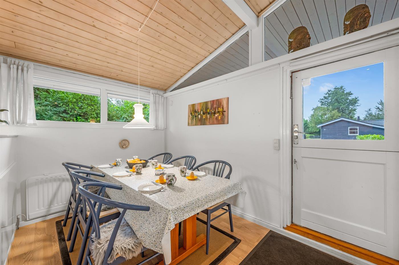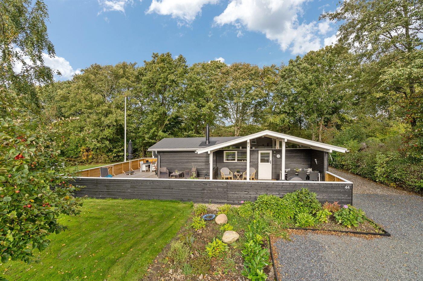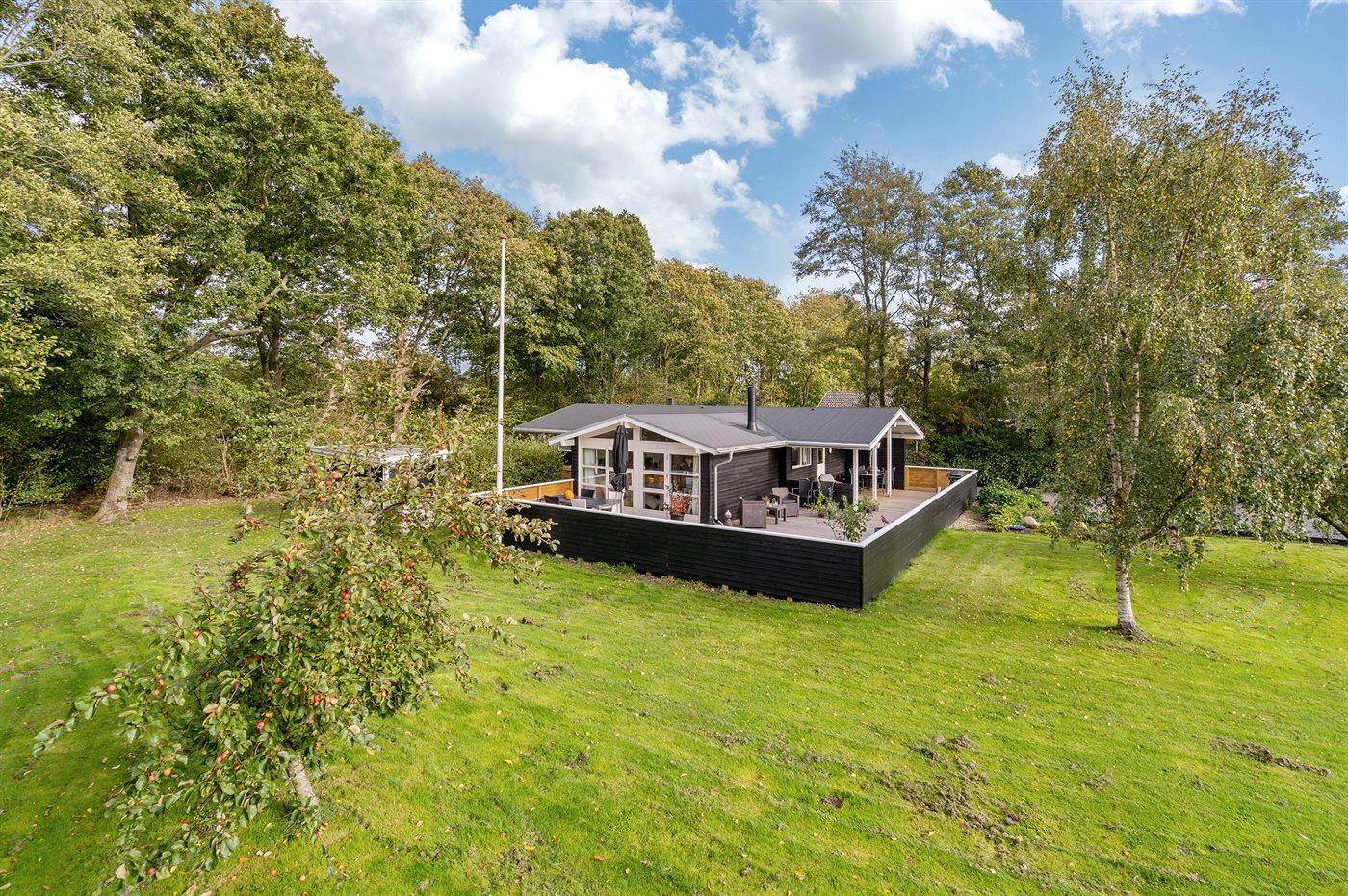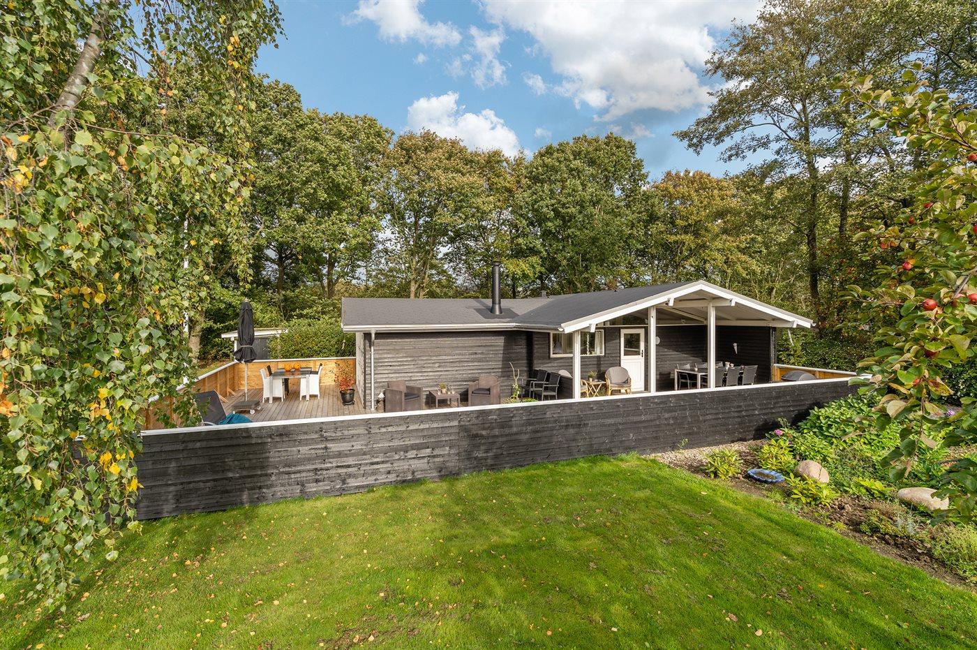 Huset er skønt indrettet med plads til 6 personer. Terrassen er indhegnet og delvist overdækket, og huset er placeret på en dejlig naturgrund omkranset af buske og træer. Der ligger en stor legeplads i nærheden.