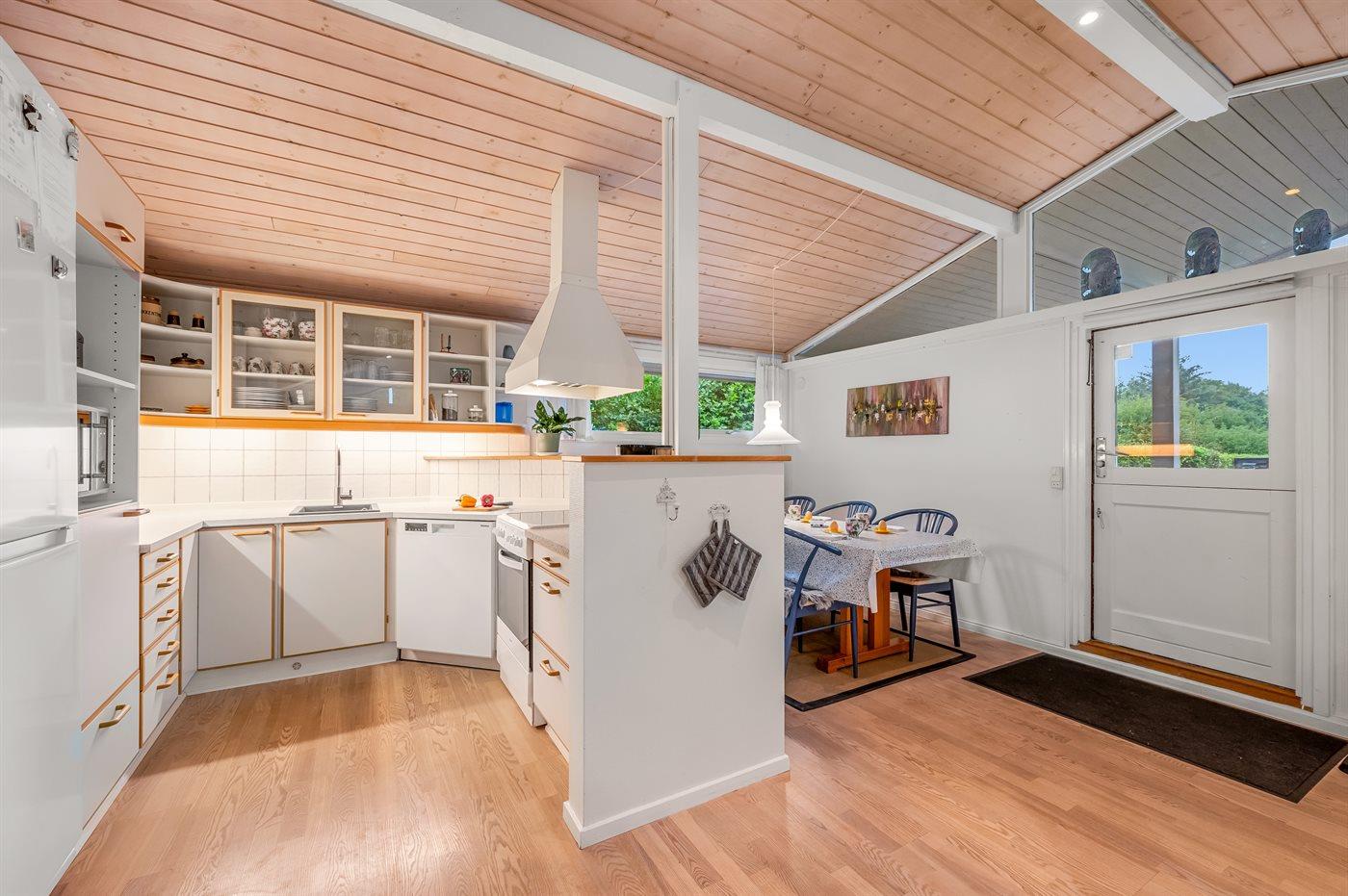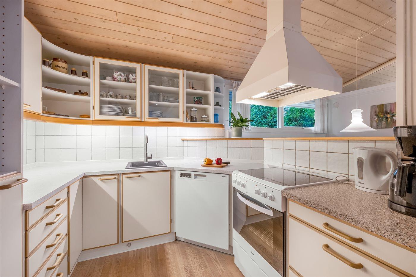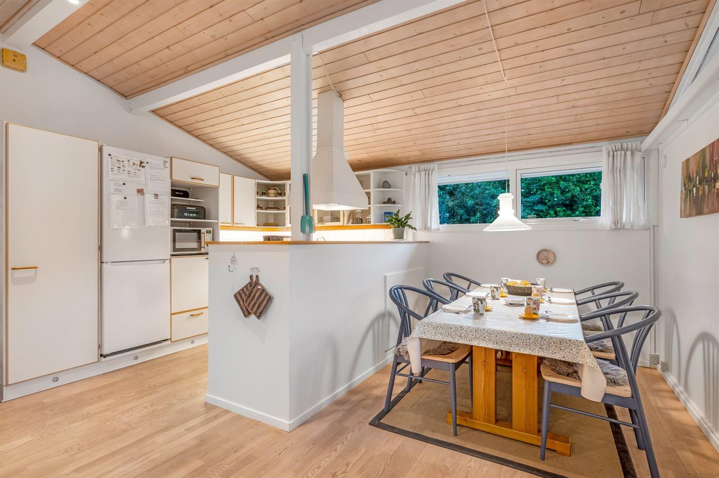 Køkkenet er udstyret med 1 køleskab. Der er 4 keramiske kogeplader, varmluftovn, mikrobølgeovn samt opvaskemaskine.