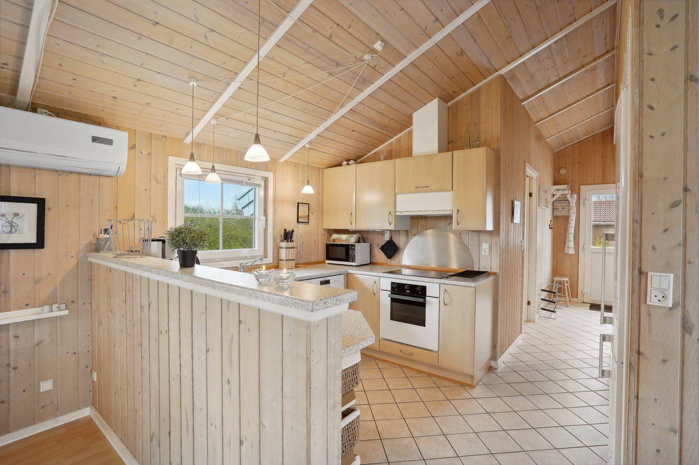 Køkkenet er udstyret med 1 køleskab. Der er 4 keramiske kogeplader, varmluftovn, mikrobølgeovn samt opvaskemaskine.