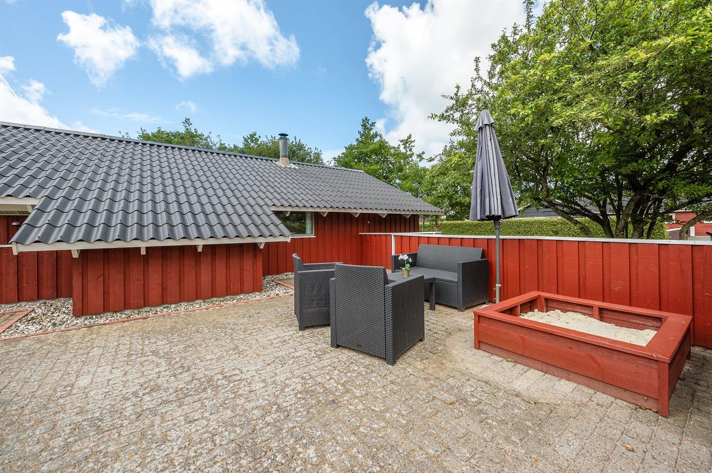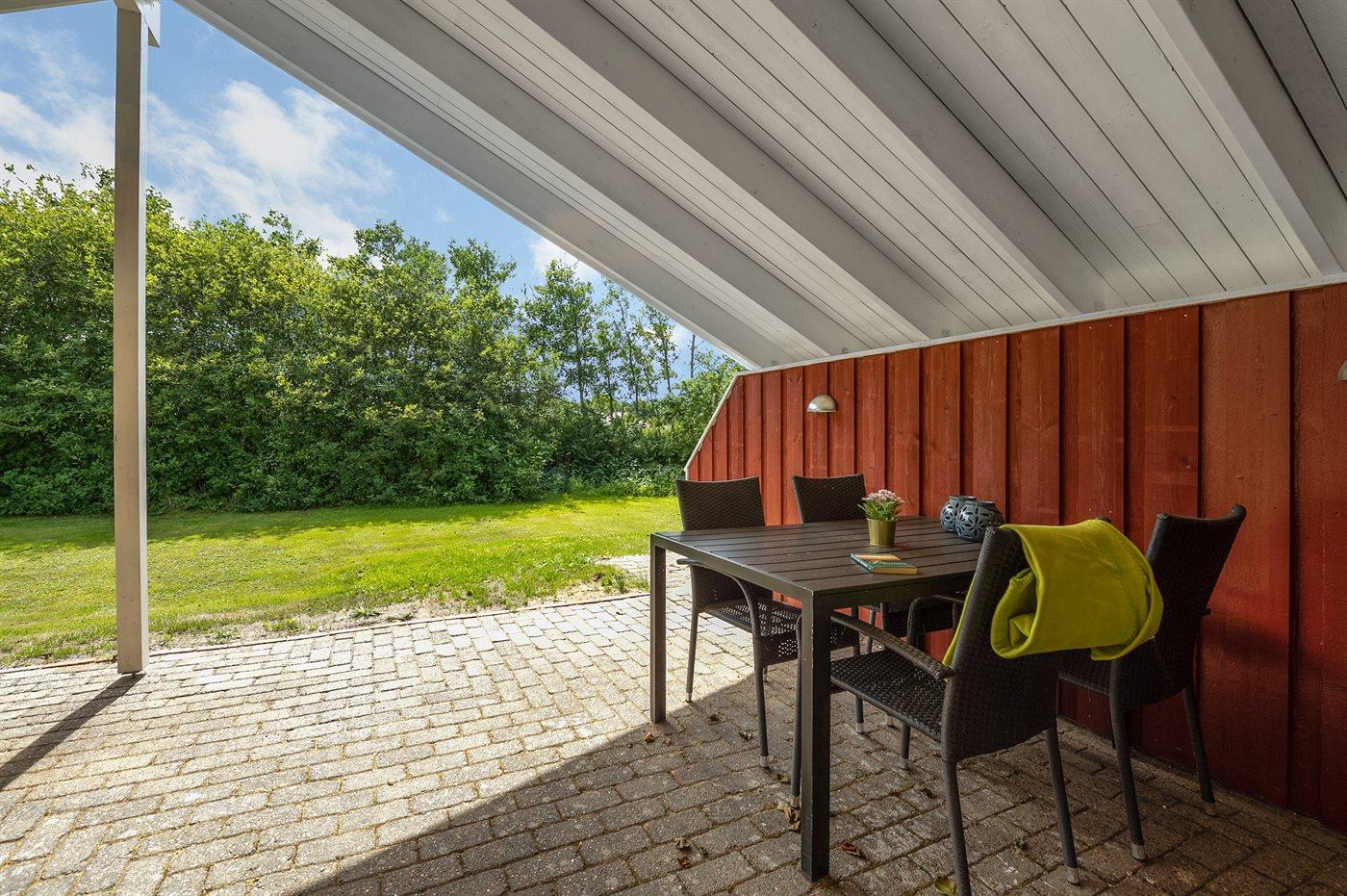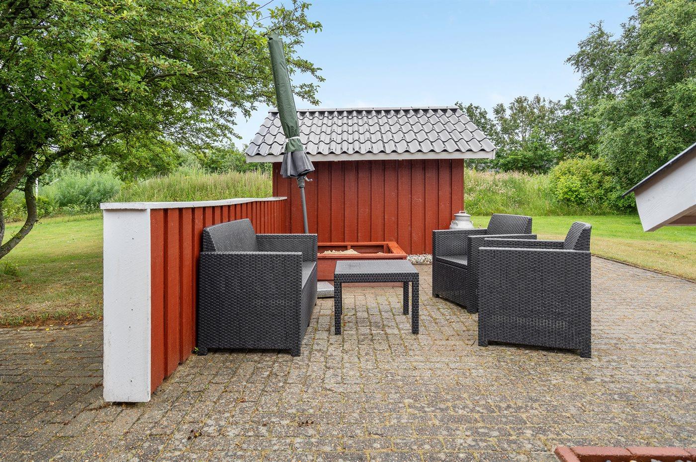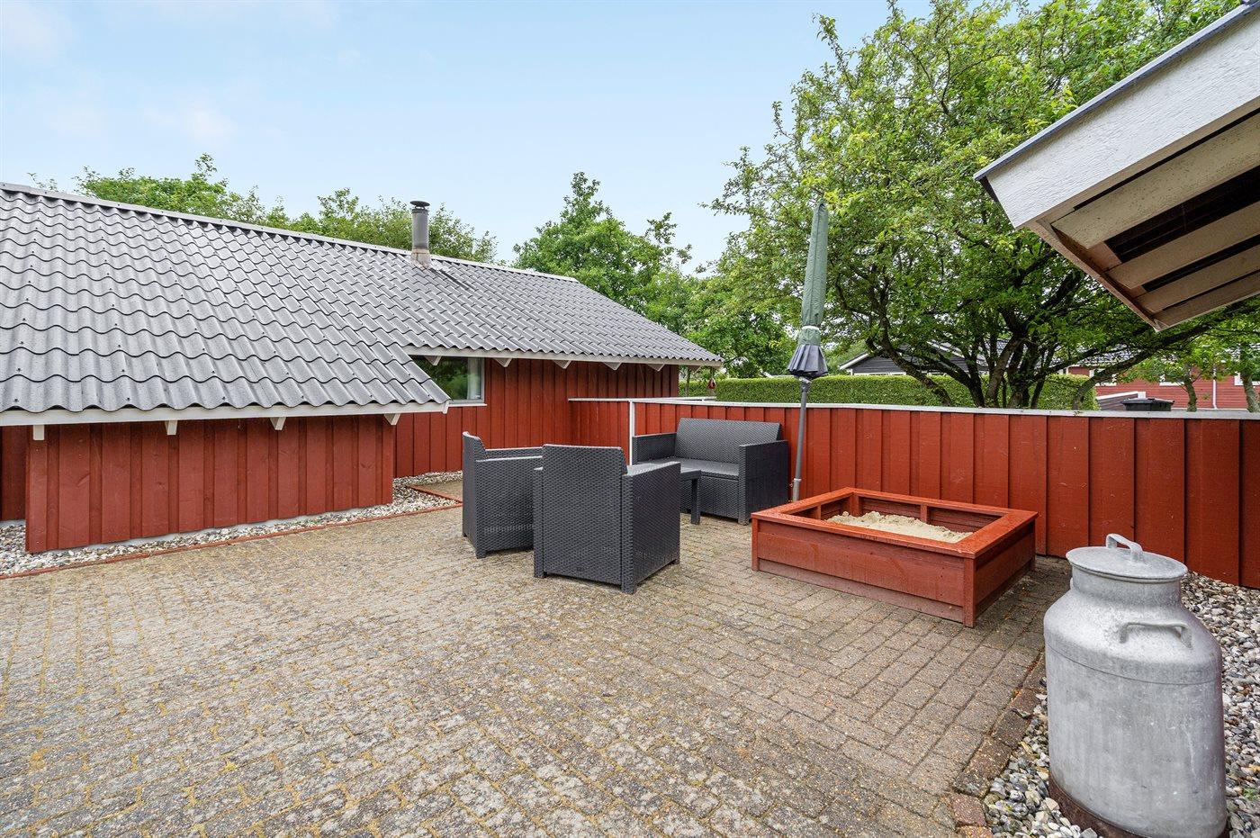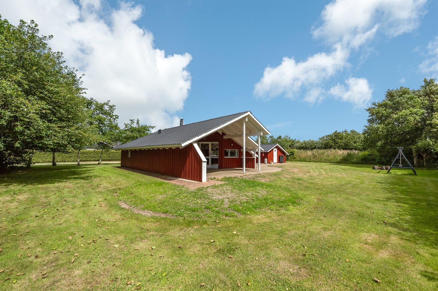 Ferieboligen er beliggende på en 1250 m² stor naturgrund. Der er 7350 m til havet. Der er 850 m til fjorden. Nærmeste forretning er beliggende i en afstand af 1200 m. Til ferieboligen hører 45 m² terrasseareal. Desuden er der 8 m² overdækket terrasse. Der er redskabsrum. Gynge. Sandkasse. Bålsted. Grill til rådighed. Parkering ved ferieboligen.