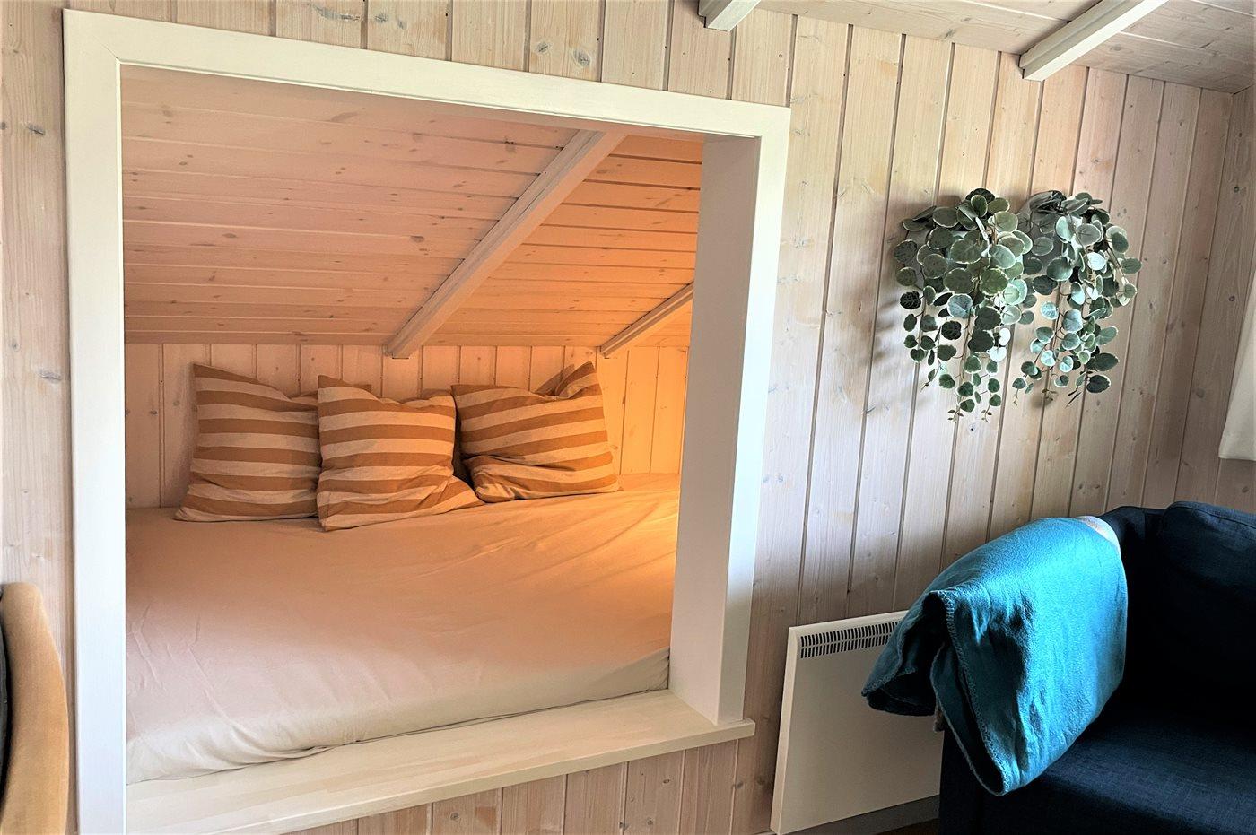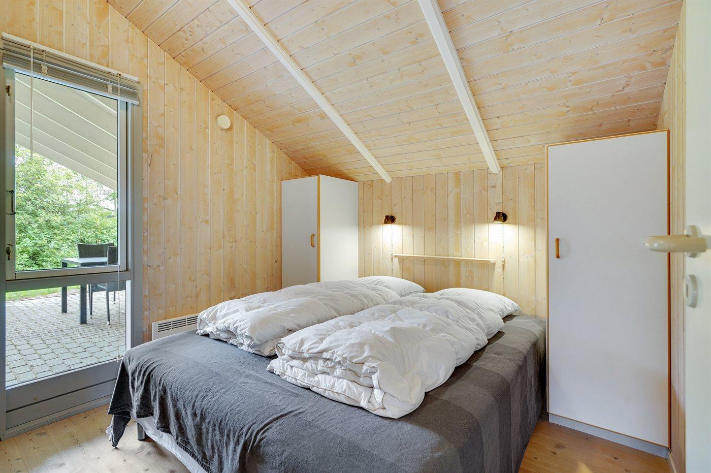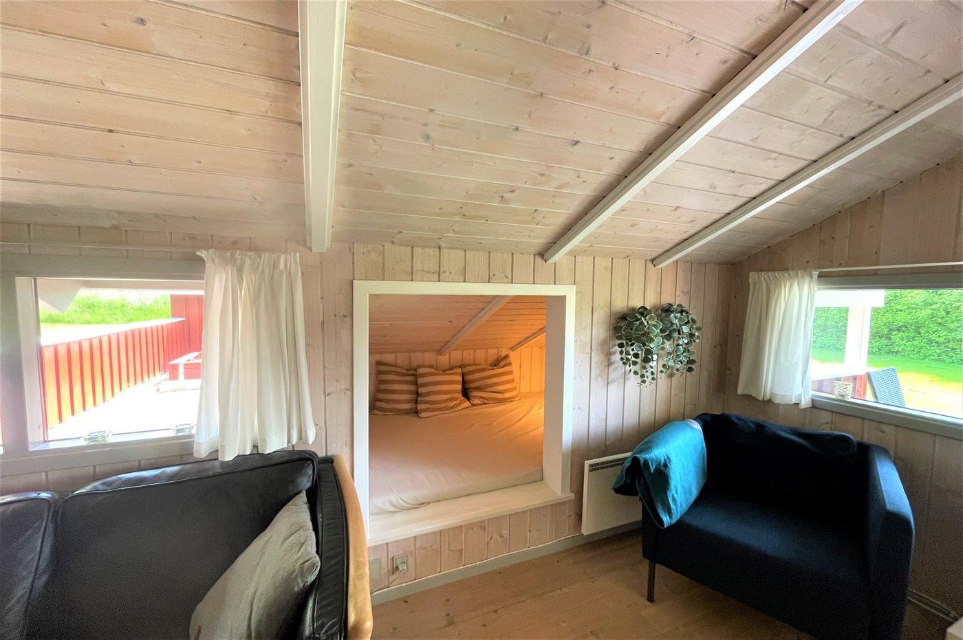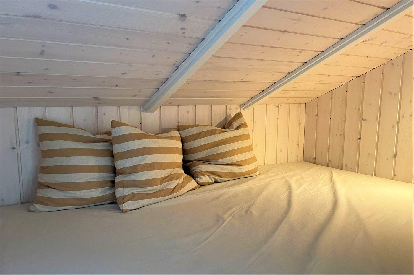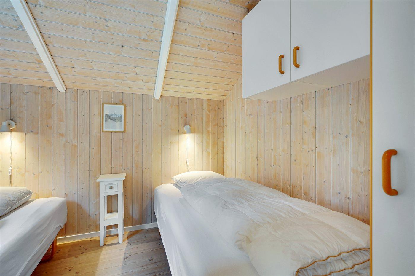 Der er i alt 2 soveværelser. Sovepladserne fordeler sig på: 2 sovepladser i dobbeltseng. 2 sovepladser i enkeltsenge. Derudover er der 1 stk. barneseng.