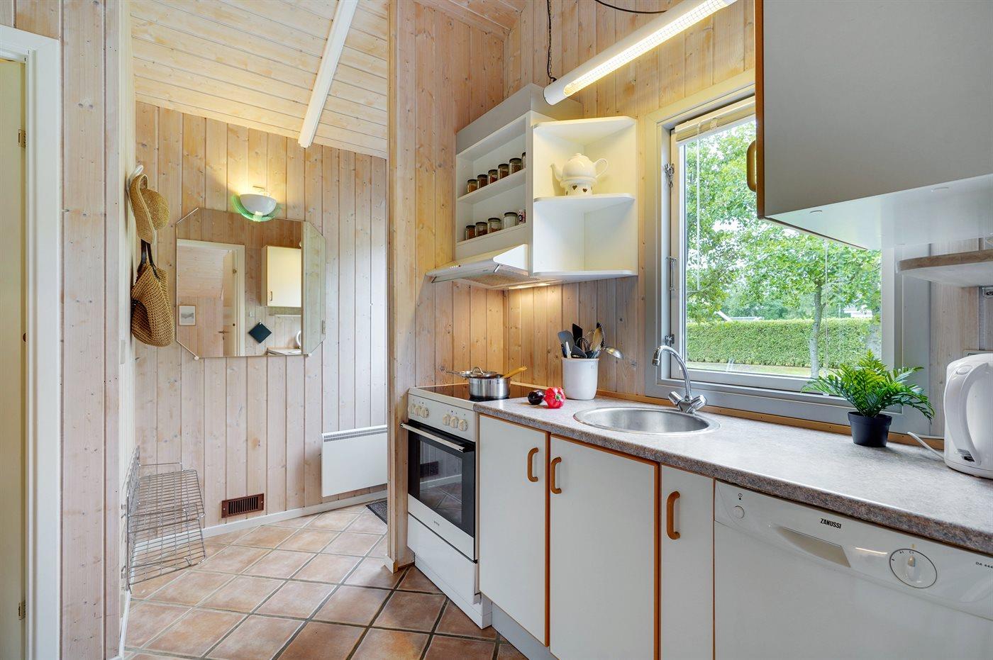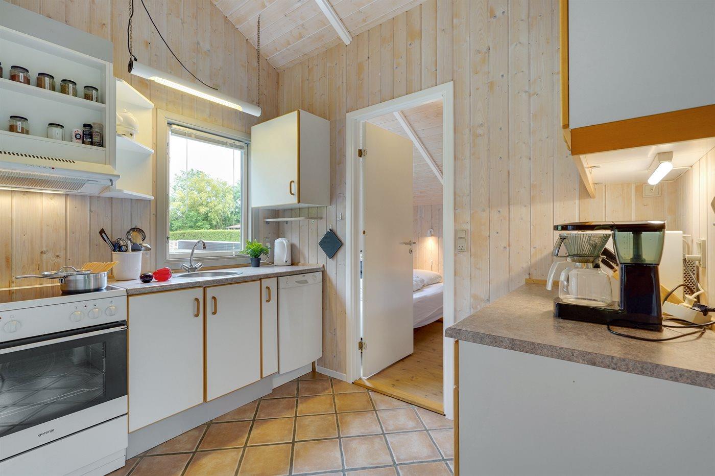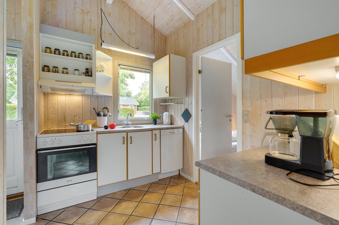 Køkkenet er udstyret med 1 køleskab. Der er 4 keramiske kogeplader, bageovn, mikrobølgeovn samt opvaskemaskine.
