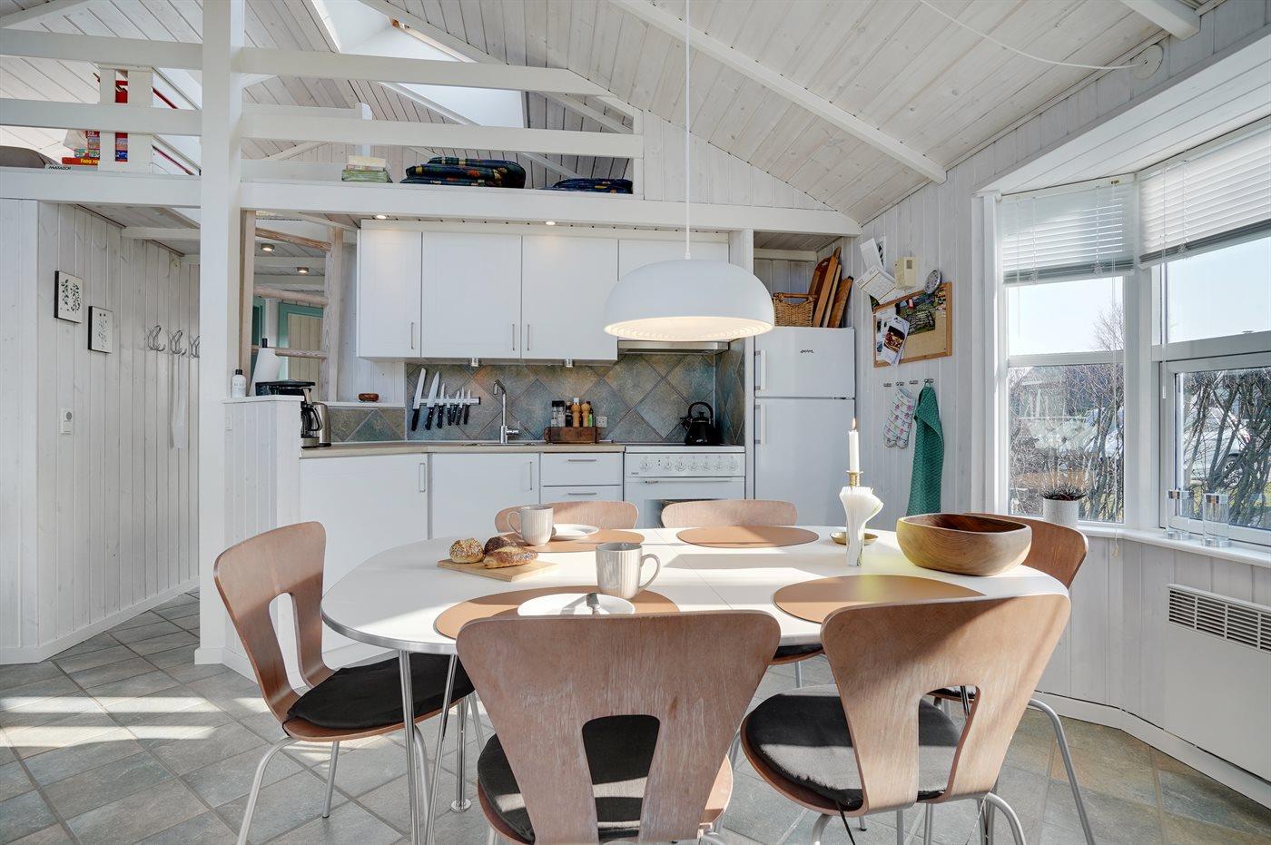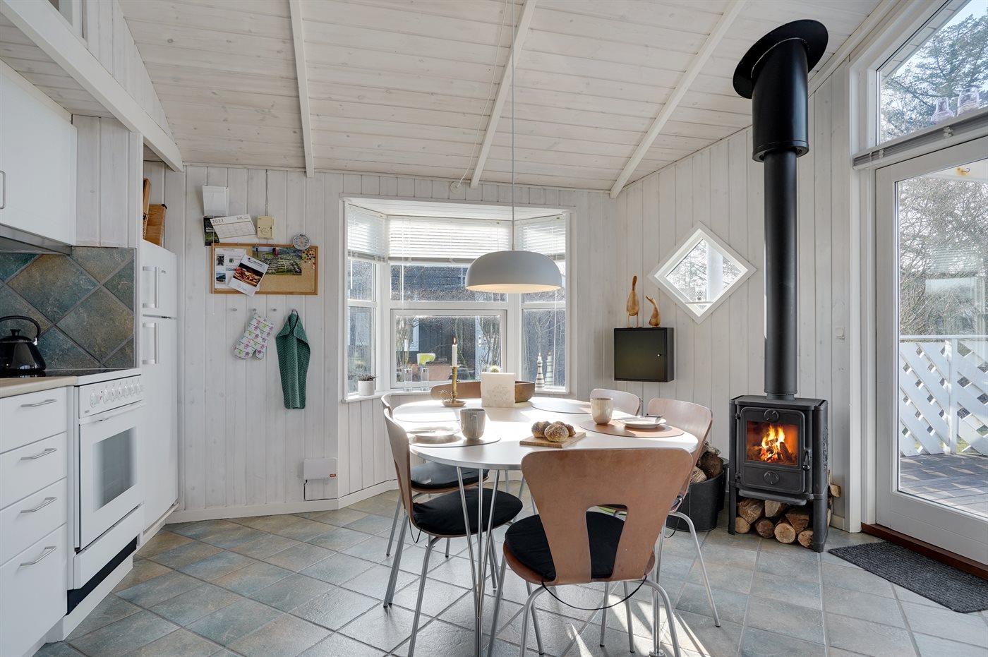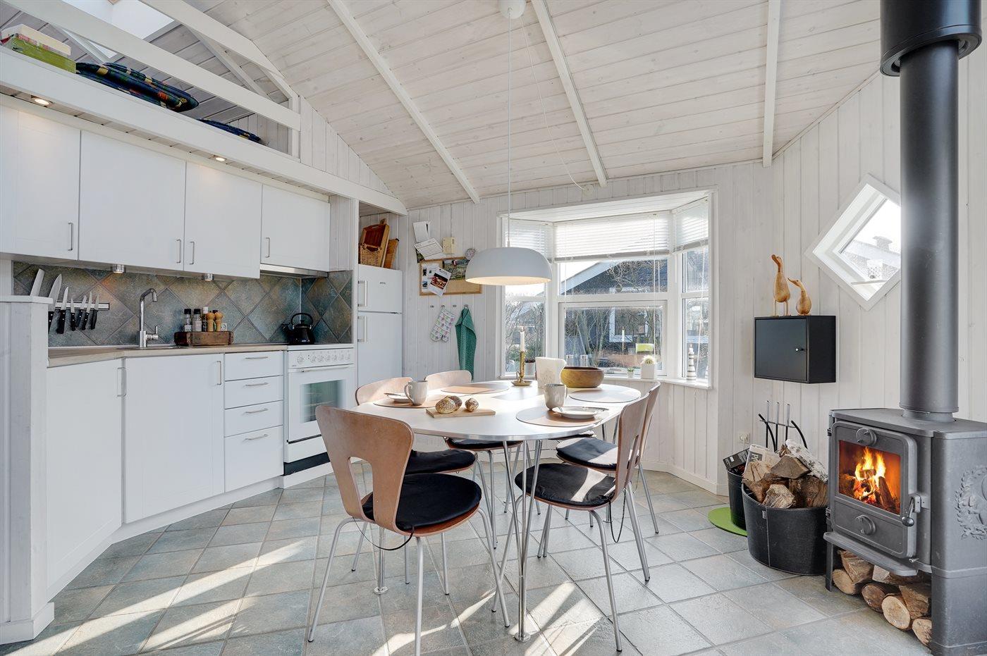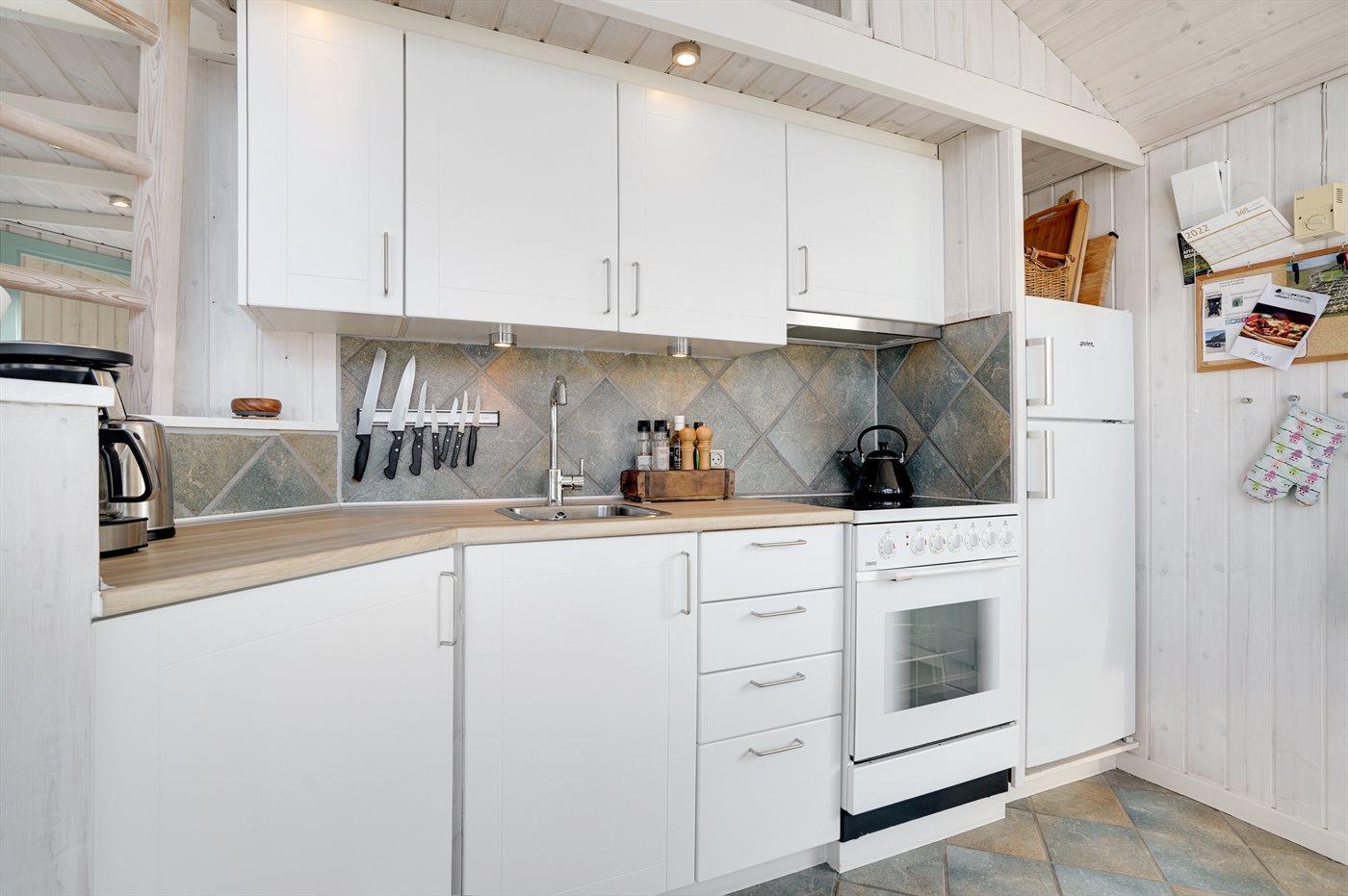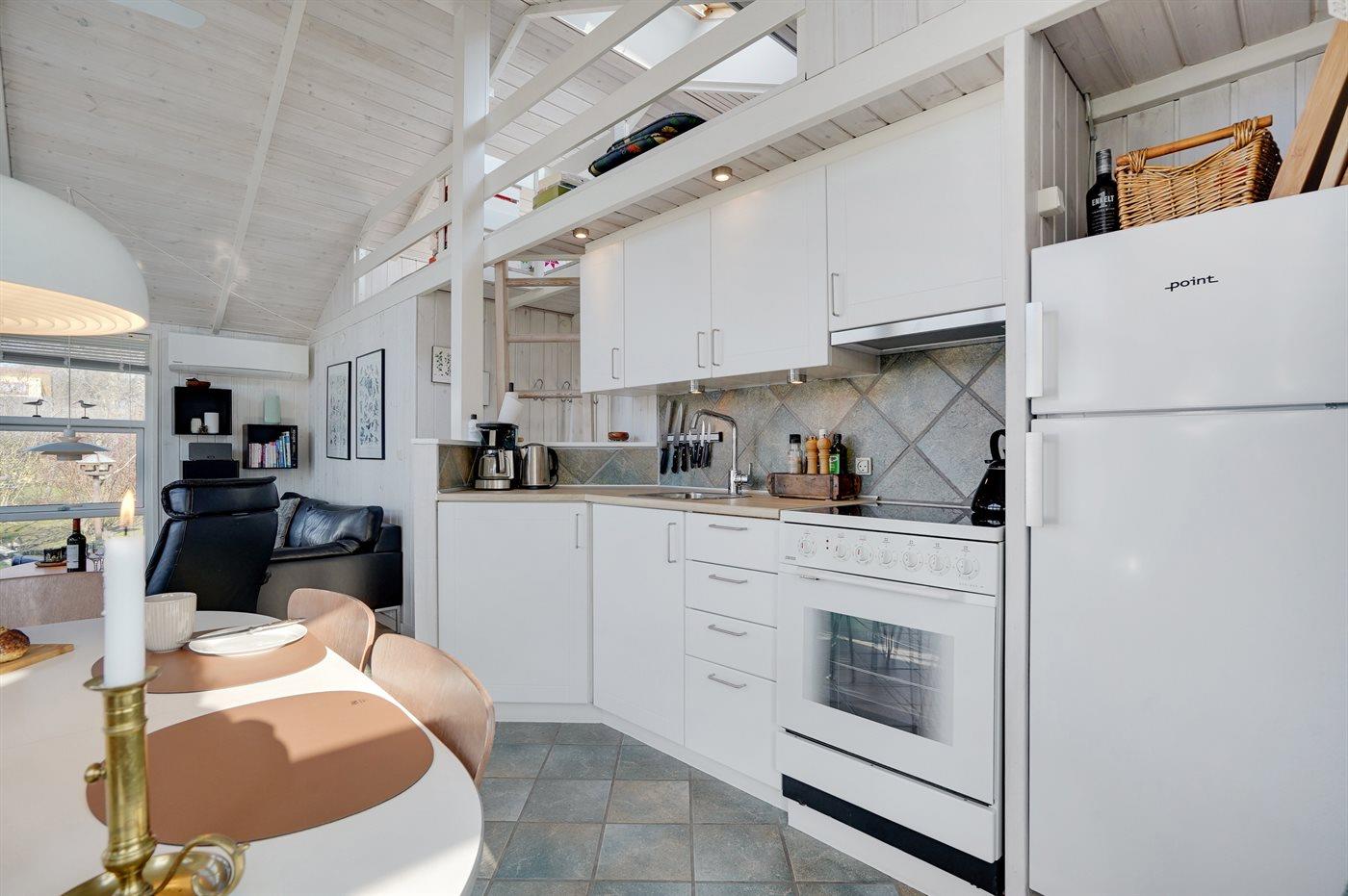 Køkkenet er udstyret med 1 køleskab. Der er 4 keramiske kogeplader, varmluftovn.