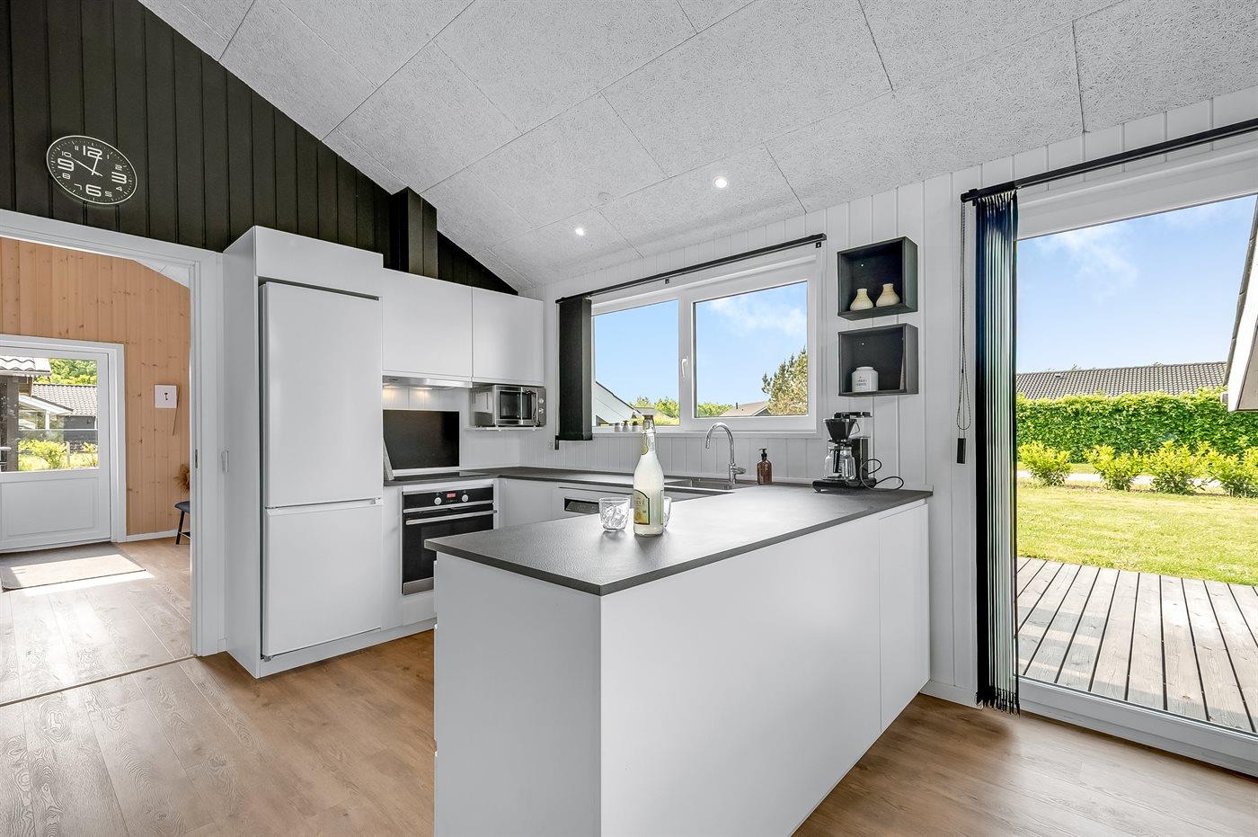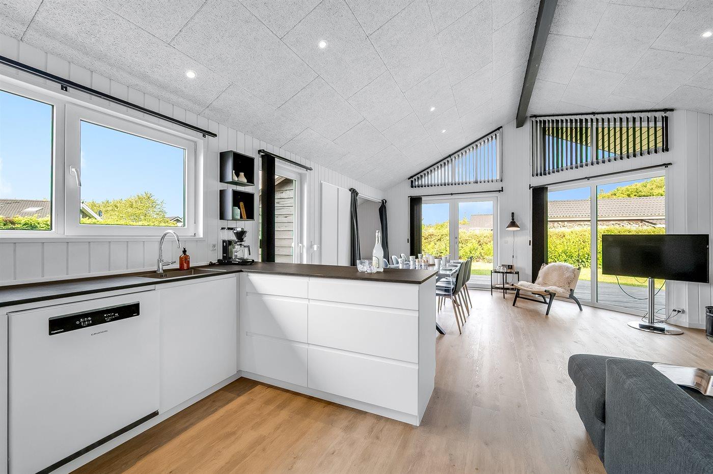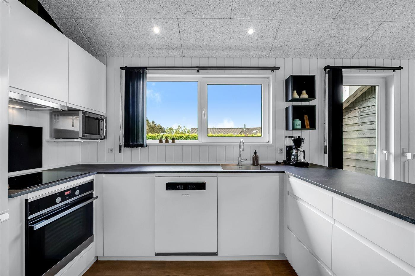 Køkkenet er udstyret med 1 køleskab, frysekapacitet på 10 liter, 4 keramiske kogeplader, varmluftovn, mikrobølgeovn samt opvaskemaskine.