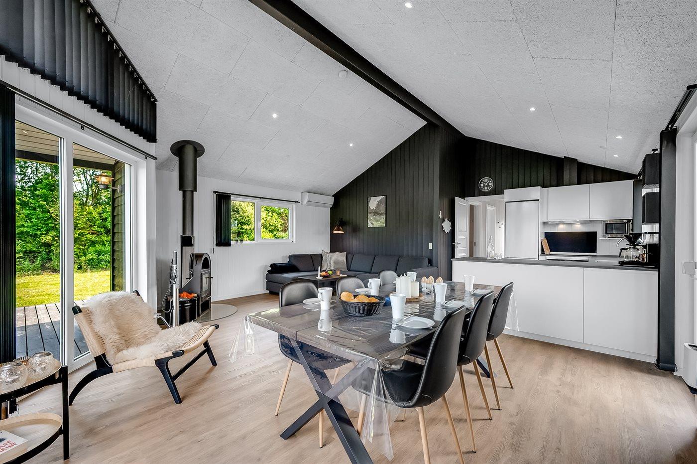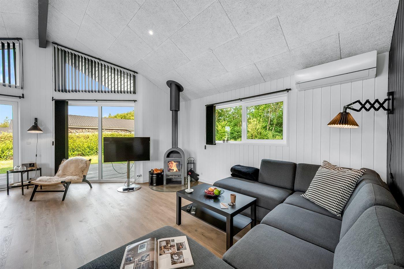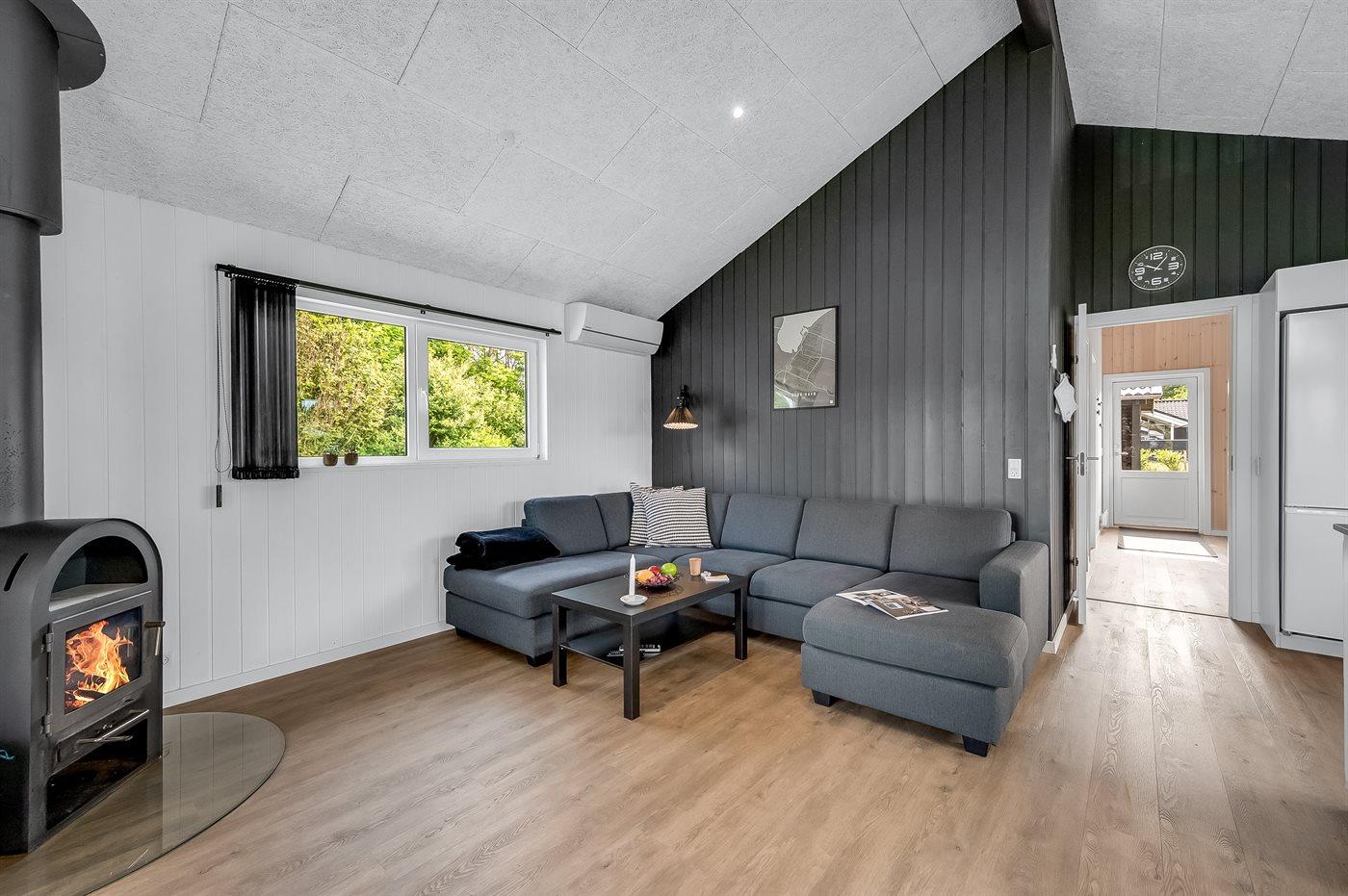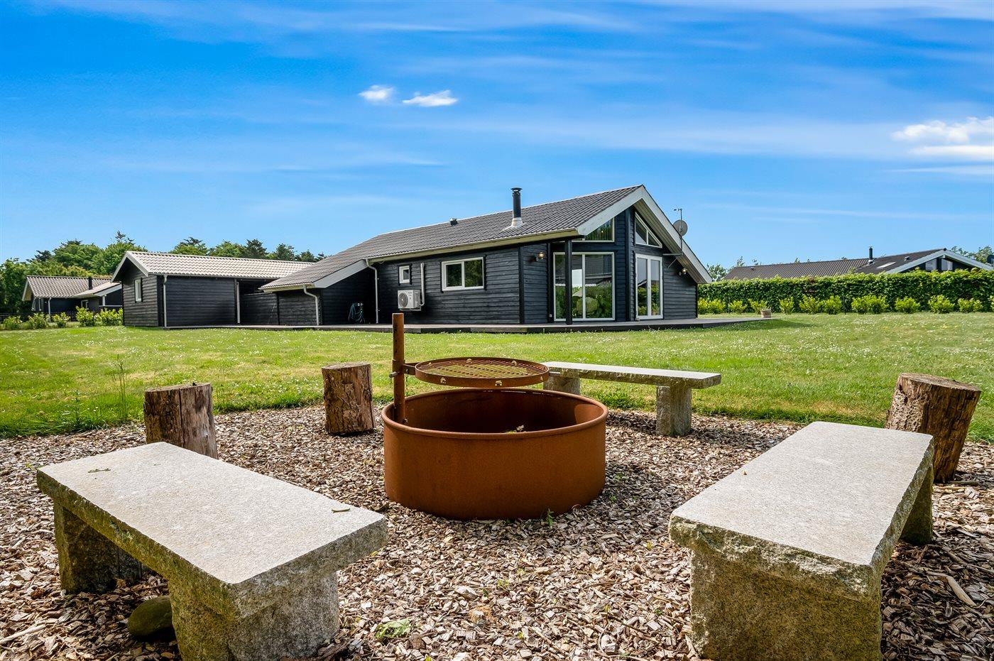 Hyggeligt sommerhus i Bork Havn med naturgrund, spa, brændeovn og indhegnet have.