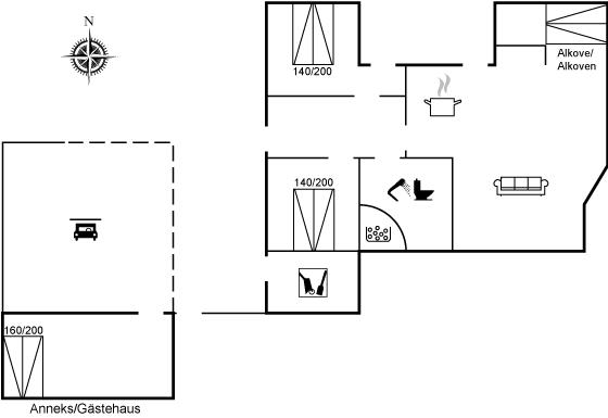 Husets sovepladser fordeler sig på 2 værelser med dobbeltseng og 2 sovepladser i en alkove i opholdsstuen. Desuden findes der et anneks, som er indrettet med dobbeltseng.