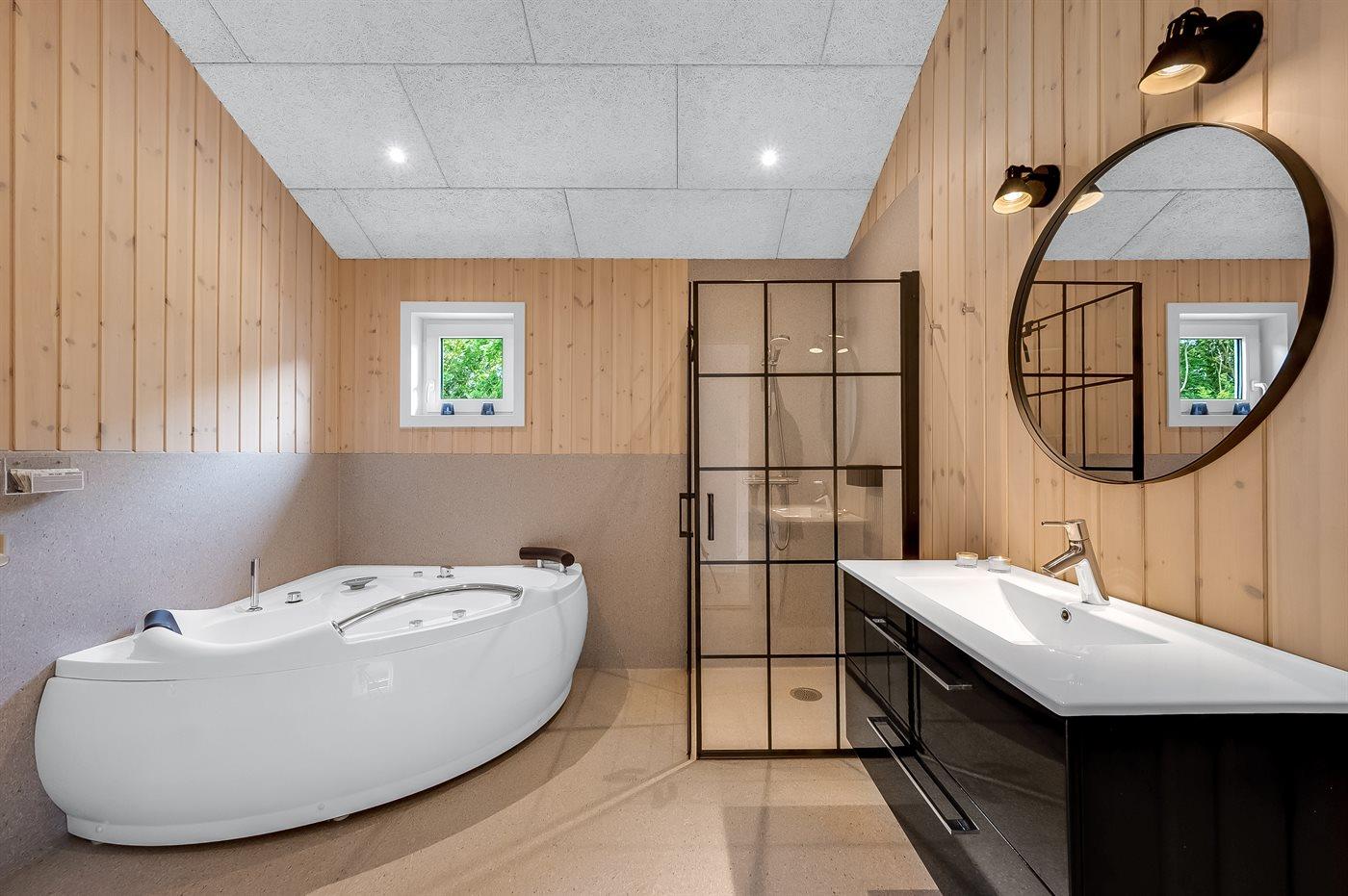 Der er 1 badeværelse med bruseniche og 1 toilet samt indendørs spa til 2 personer, hvor man kan slappe af og nyde det varme vand.