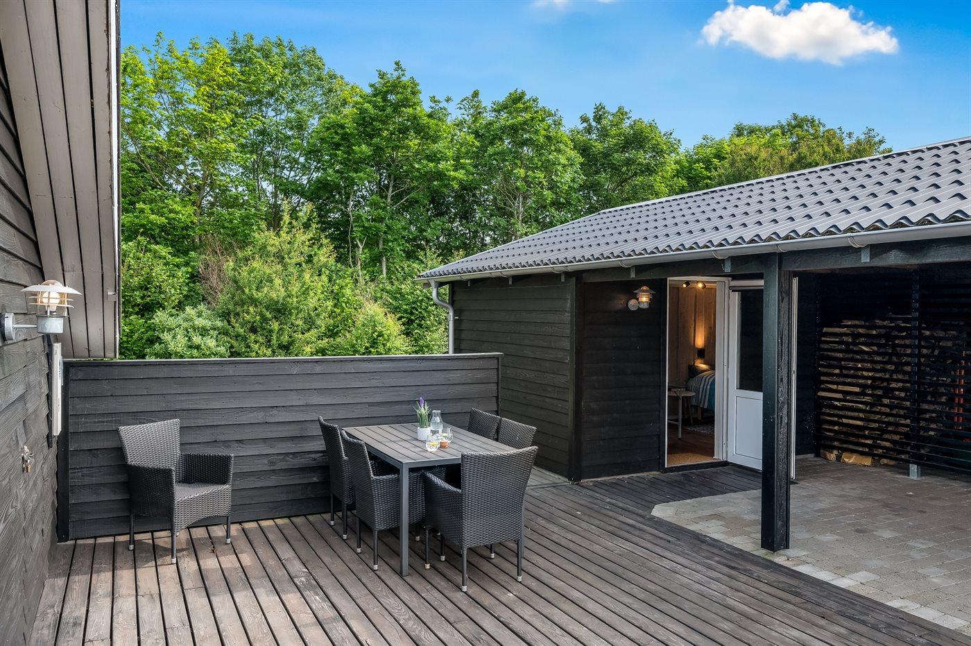 Ferieboligen er beliggende på en 1241 m² stor naturgrund. Grunden er indhegnet. Der er 7000 m til havet. Der er 1400 m til fjorden. Nærmeste forretning er beliggende i en afstand af 1500 m. Til ferieboligen hører 70 m² terrasseareal. Bålsted. Der er carport til rådighed. Parkering ved ferieboligen.
