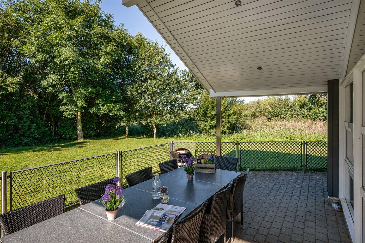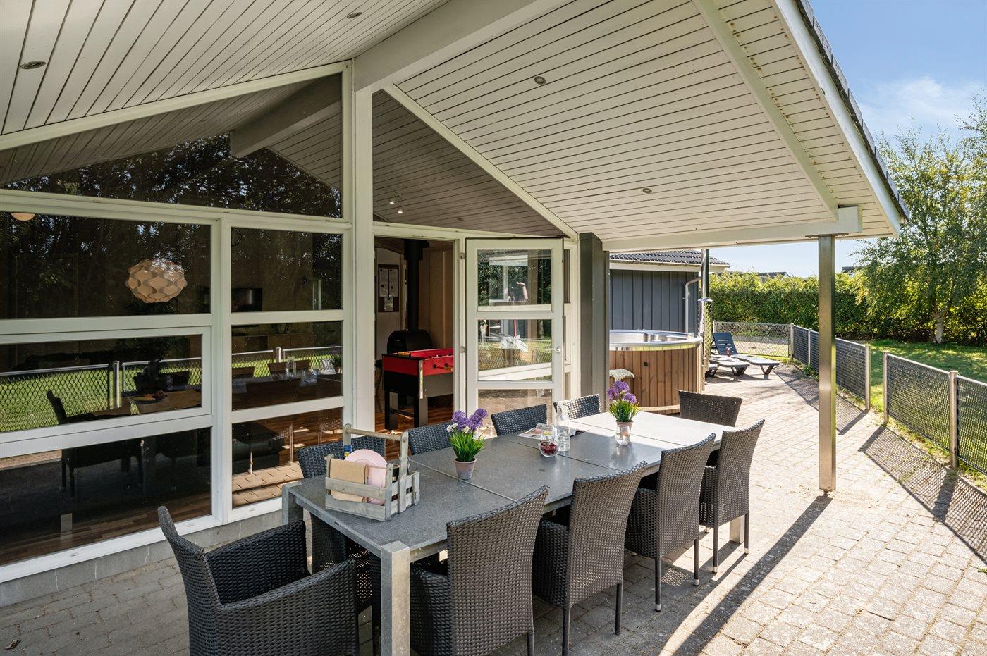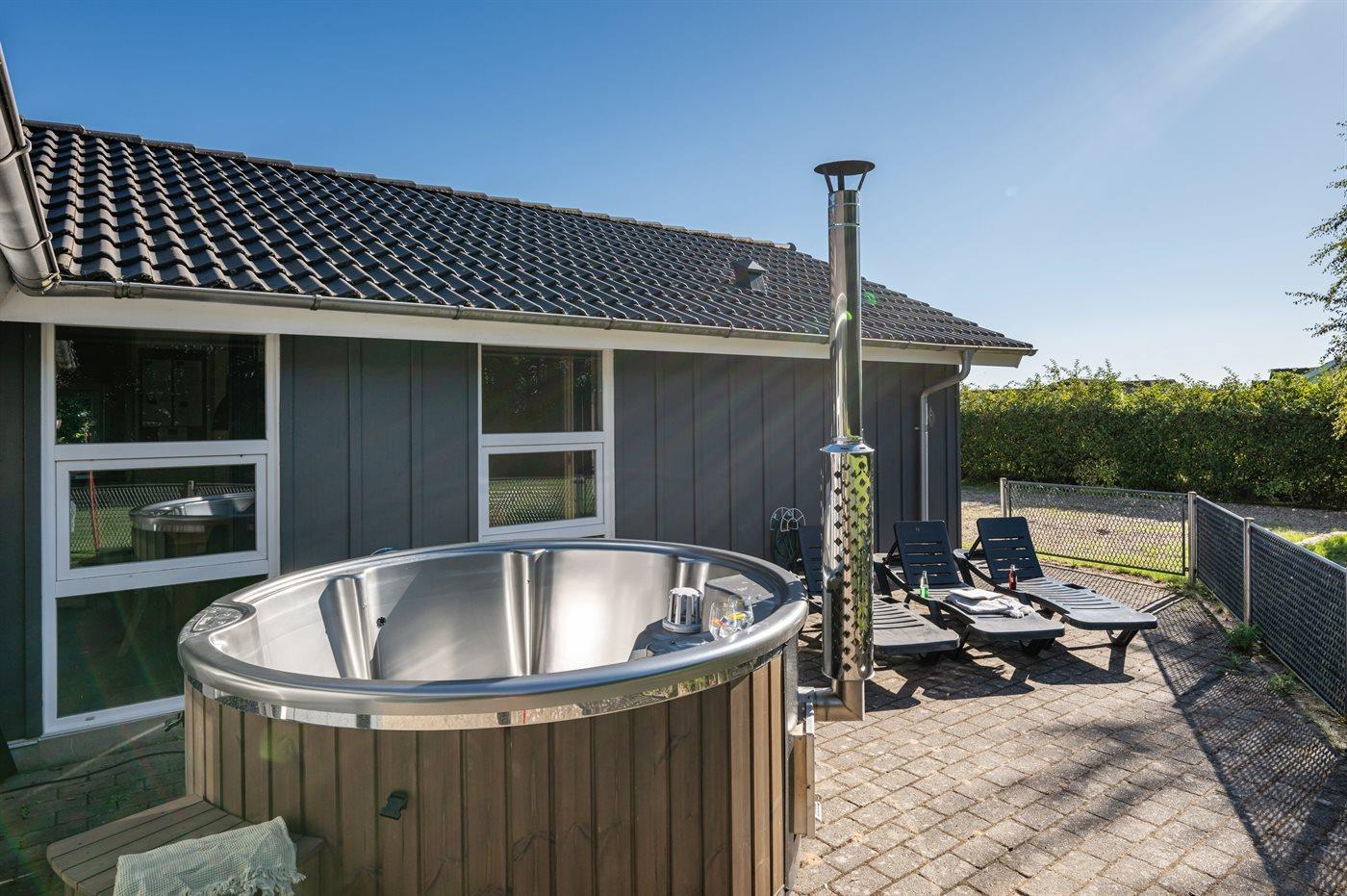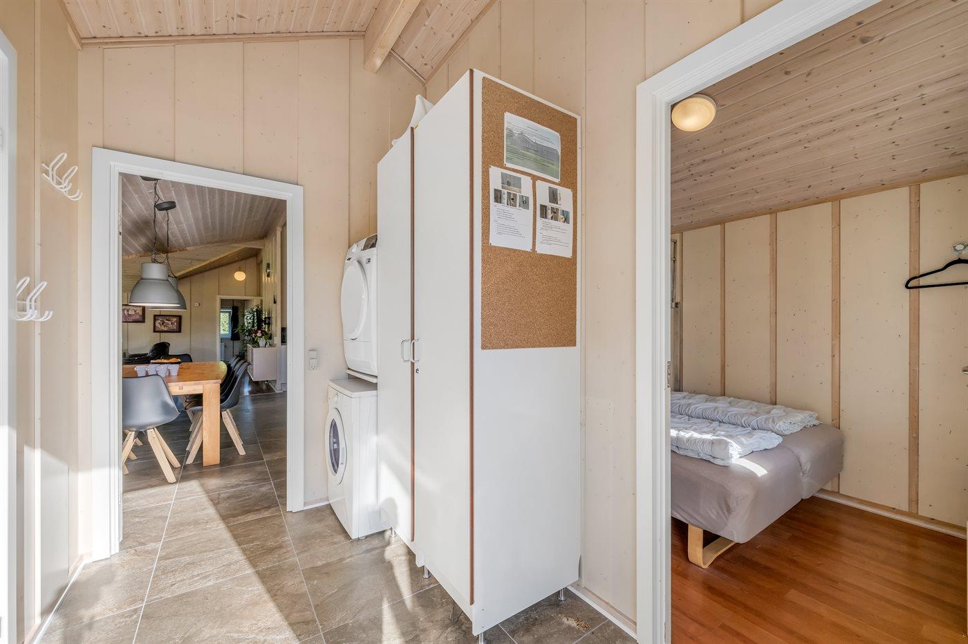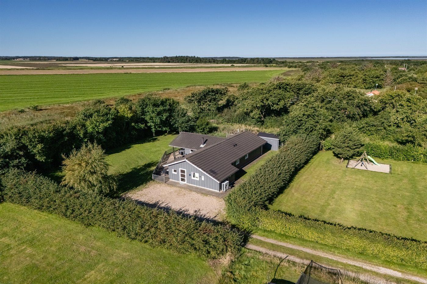 Ferieboligen er beliggende på en 1200 m² stor havegrund. Der er 7000 m til havet. Der er 1200 m til fjorden. Nærmeste forretning er beliggende i en afstand af 1500 m. Til ferieboligen hører 70 m² terrasseareal. Desuden er der 15 m² overdækket terrasse. Der er redskabsrum. Gynge. Der er installeret stik til opladning af elbil. Type 2 stik. Med 11 kW ladeeffekt. Parkering ved ferieboligen.