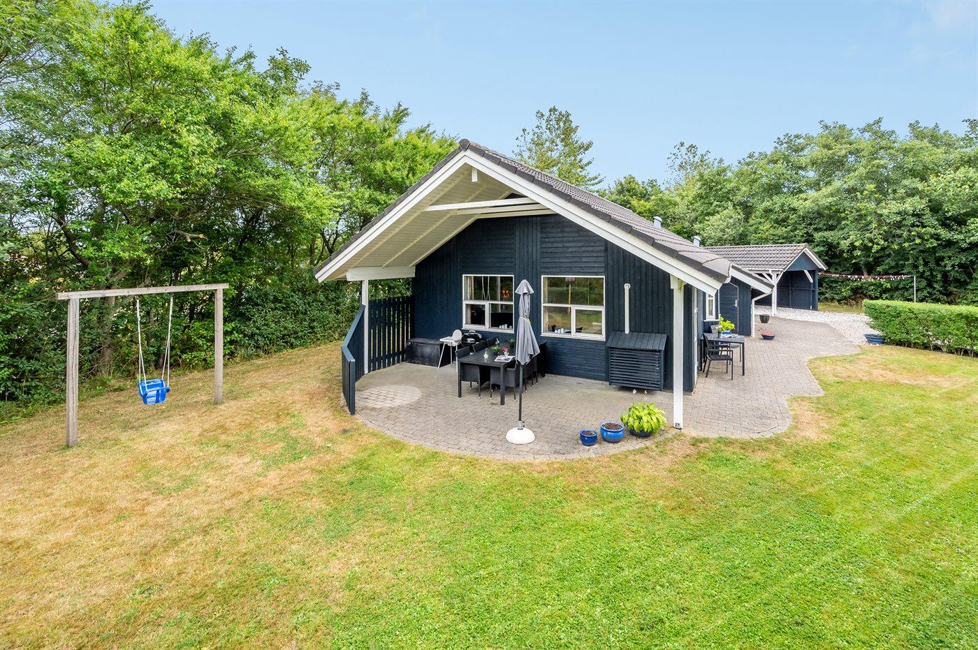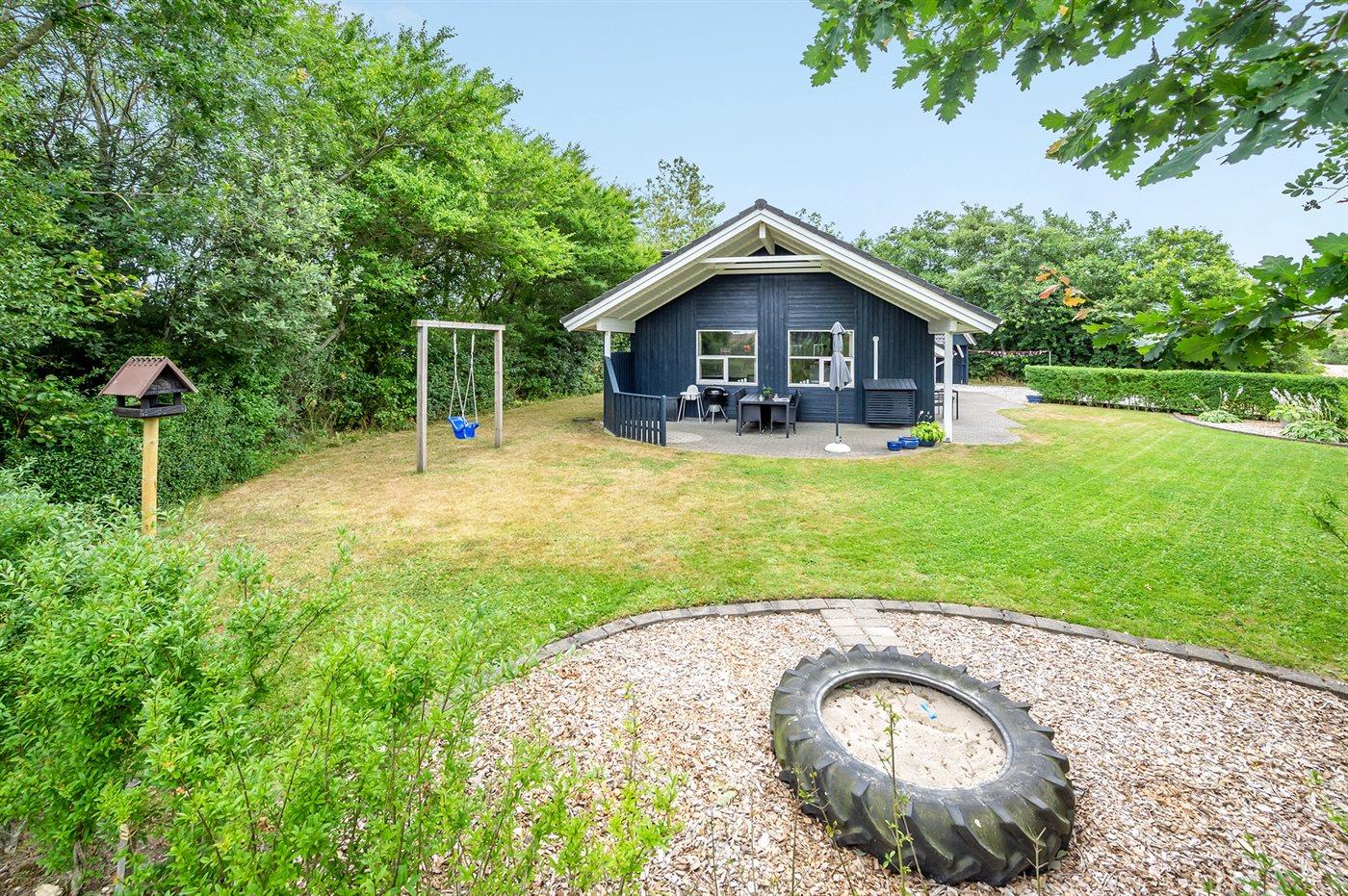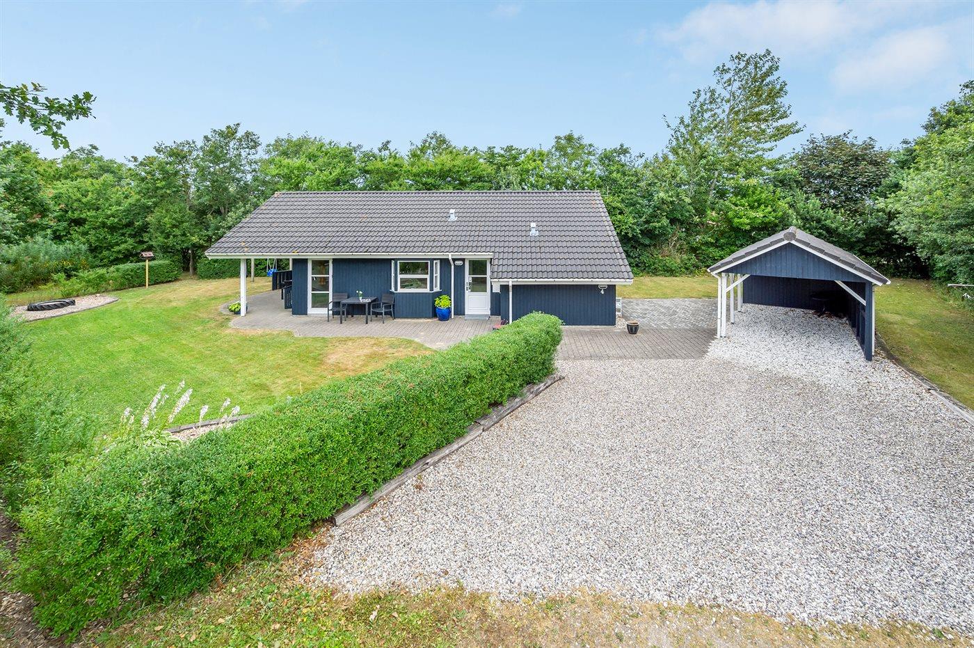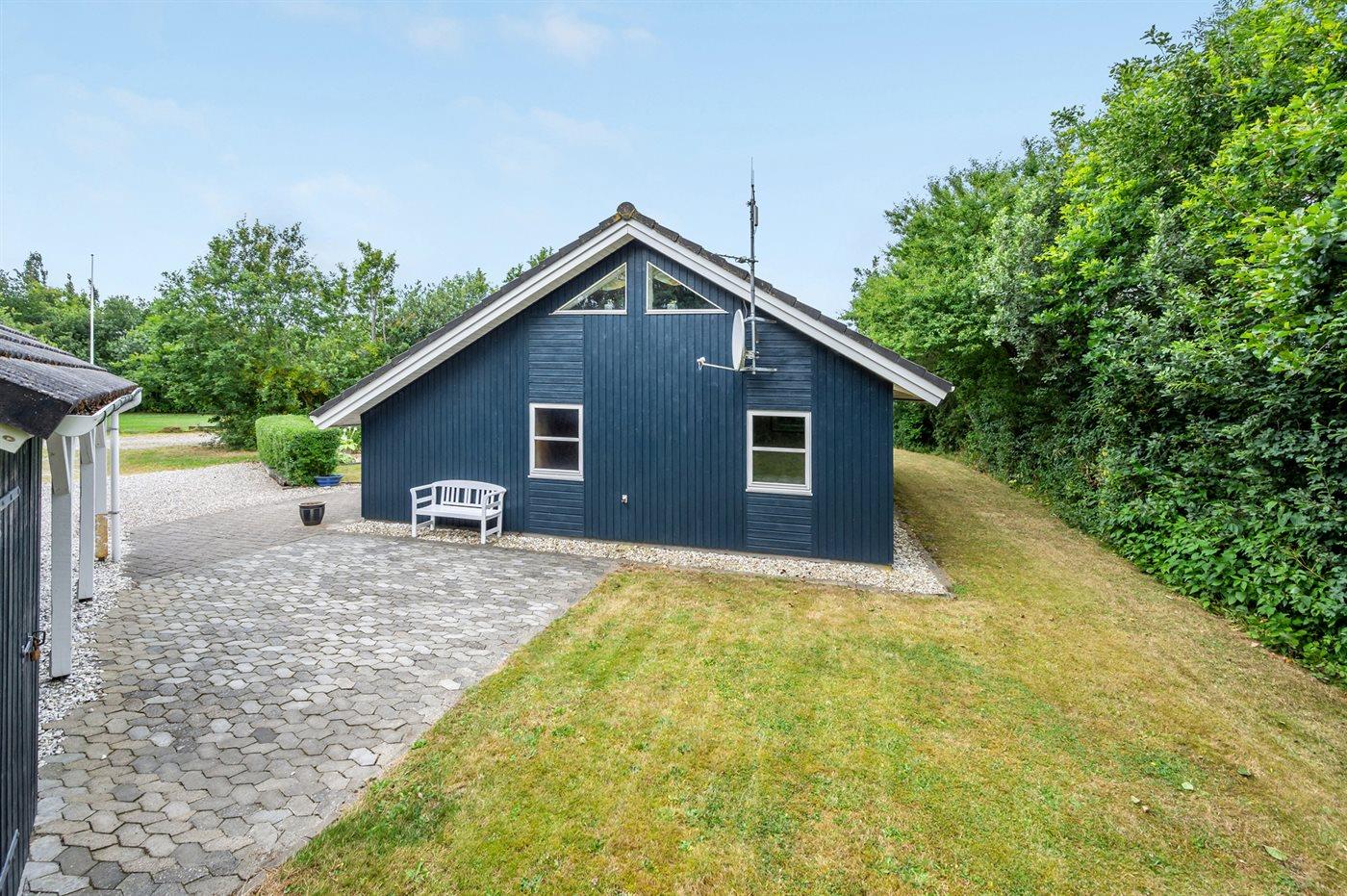Ferieboligen er beliggende på en 968 m² stor havegrund. Der er 7000 m til havet. Der er 1000 m til fjorden. Nærmeste forretning er beliggende i en afstand af 1000 m. Til ferieboligen hører 24 m² terrasseareal. Desuden er der 14 m² overdækket terrasse. Der er redskabsrum. Gynge. Sandkasse. Der er carport til rådighed. Parkering ved ferieboligen.