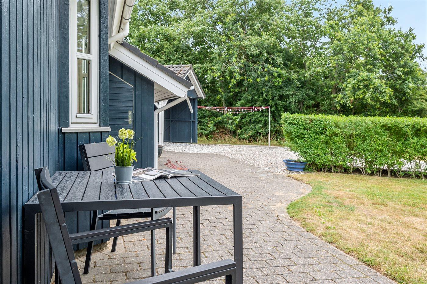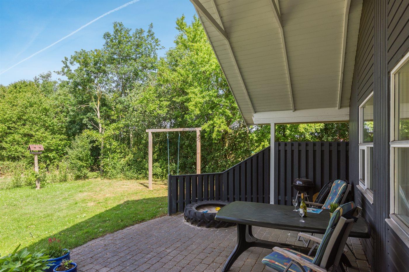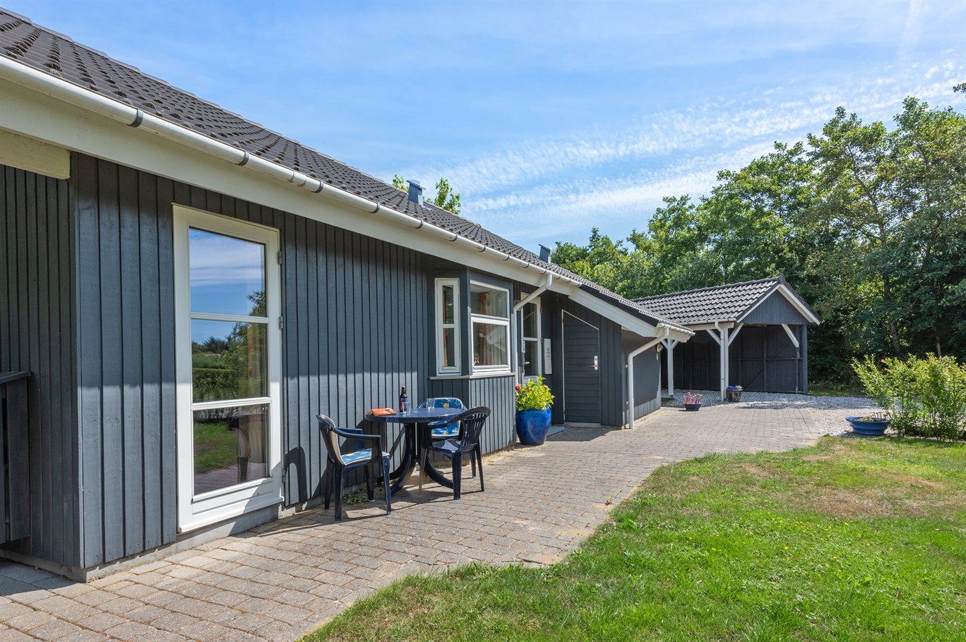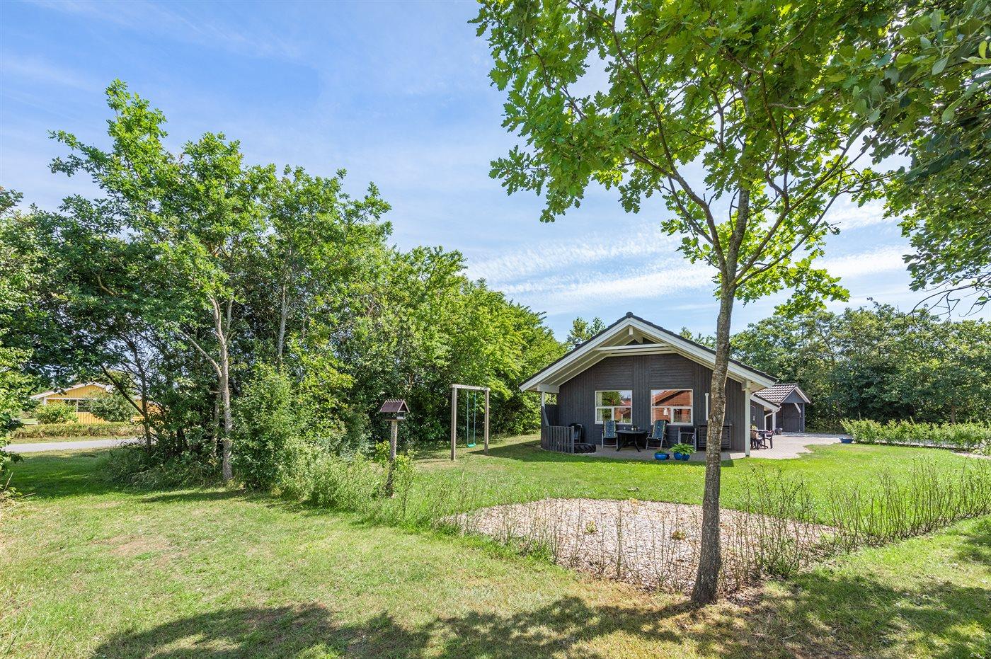Ferieboligen er beliggende på en 968 m² stor havegrund. Der er 7000 m til havet. Der er 1000 m til fjorden. Nærmeste forretning er beliggende i en afstand af 1000 m. Til ferieboligen hører 24 m² terrasseareal. Desuden er der 14 m² overdækket terrasse. Der er redskabsrum. Gynge. Sandkasse. Der er carport til rådighed. Parkering ved ferieboligen.