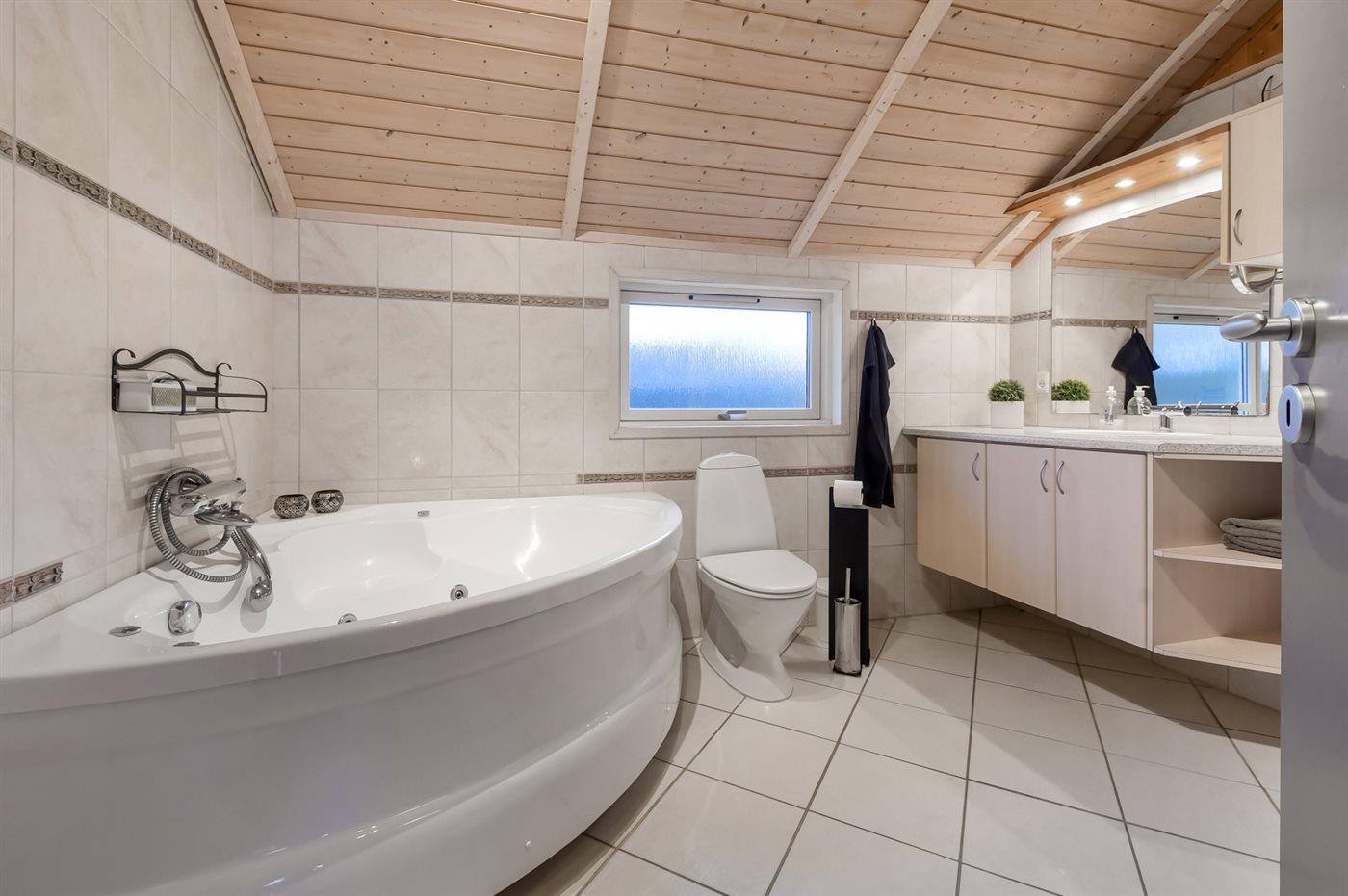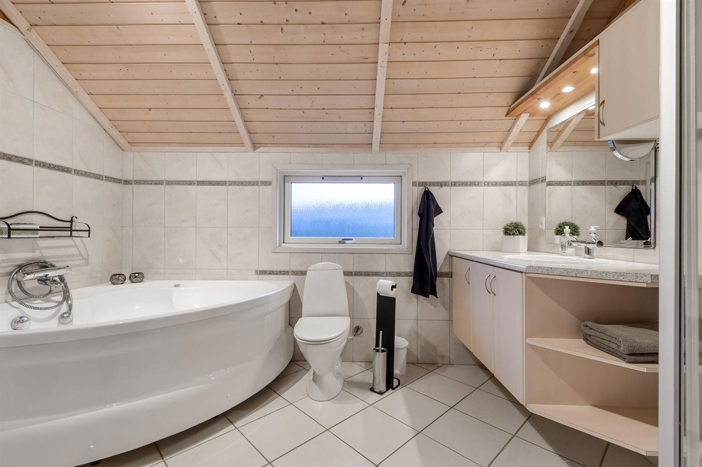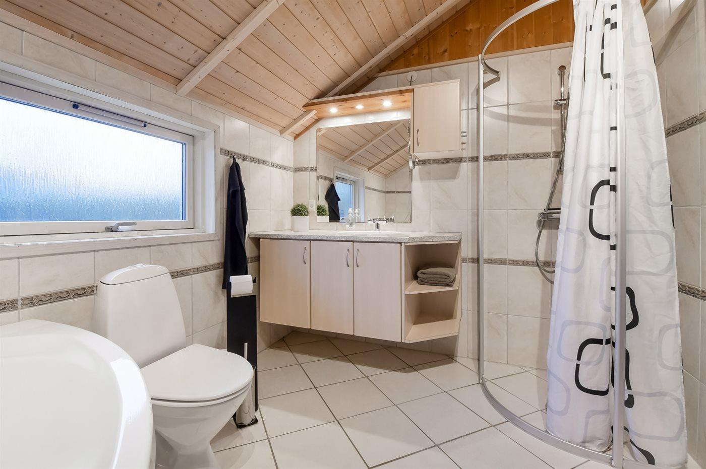 Der er 2 badeværelser med bruseniche og 2 toiletter. Der er gulvvarme på 2 badeværelser. I saunaen er der mulighed for afslapning.