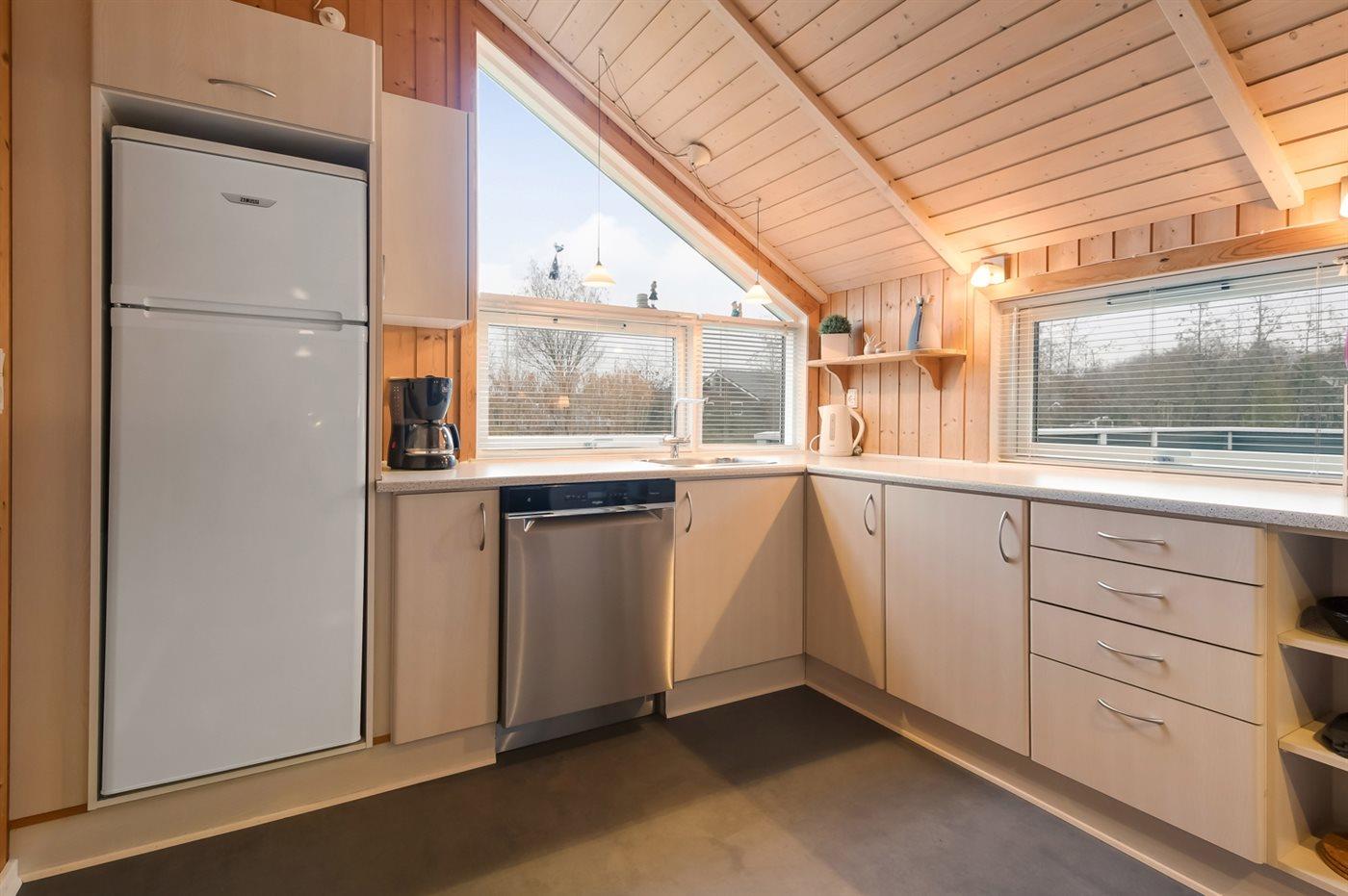 Køkkenet er udstyret med 1 køleskab. Der er 4 keramiske kogeplader, bageovn, varmluftovn, mikrobølgeovn samt opvaskemaskine.