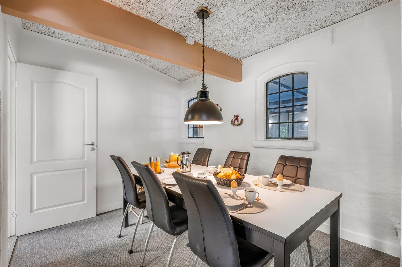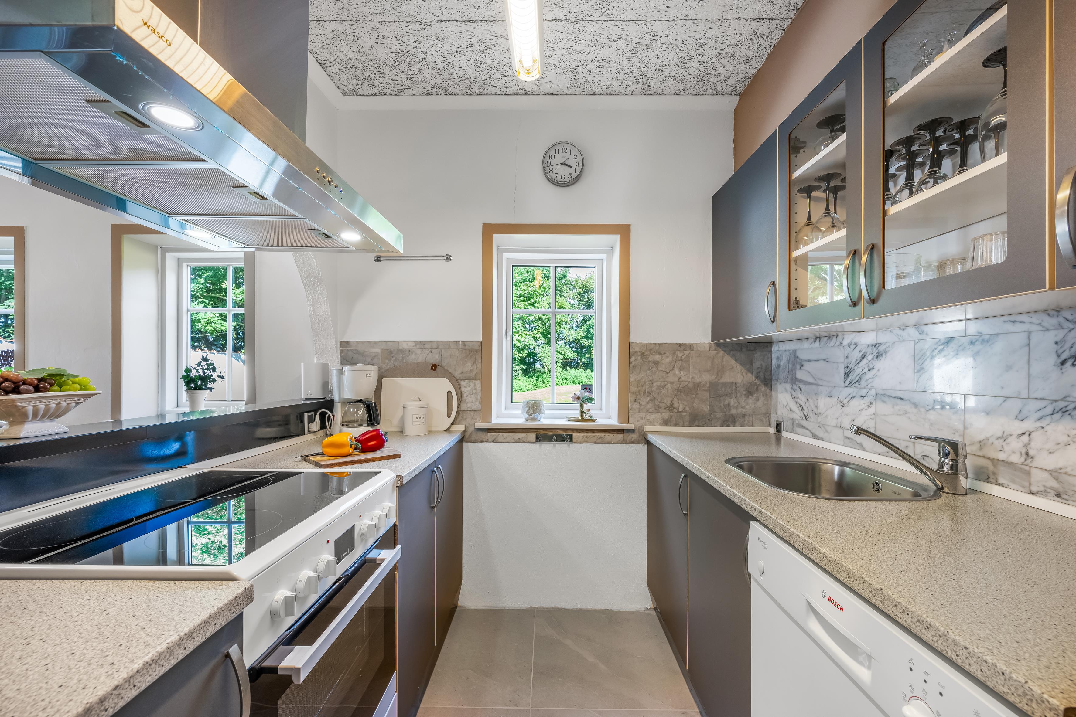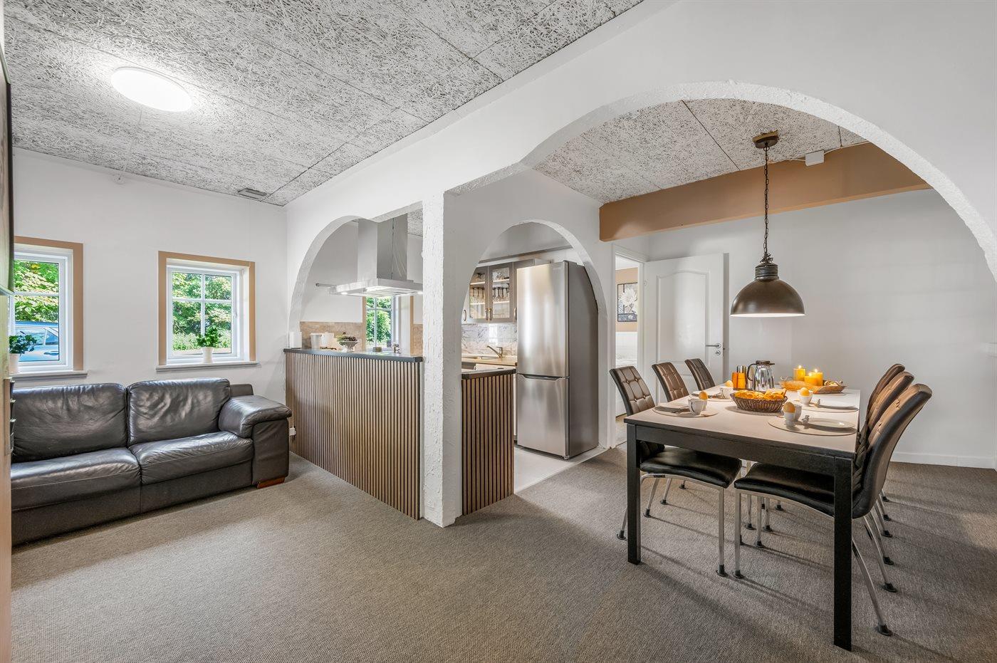 Køkkenet er udstyret med 1 køleskab. Der er 4 keramiske kogeplader, varmluftovn, mikrobølgeovn samt opvaskemaskine.