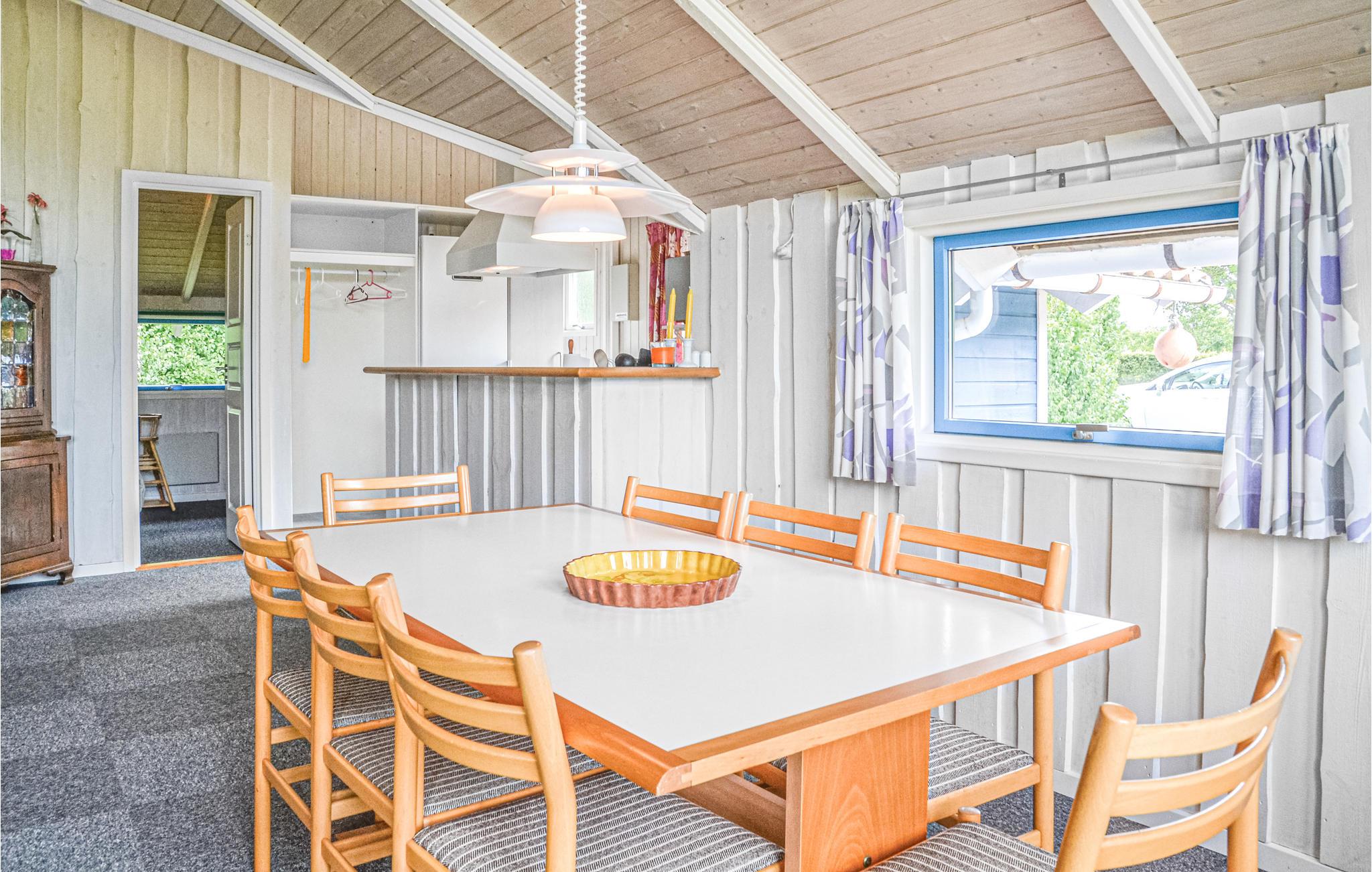 Her finder vi er tradionelt sommerhus. Et dejligt opholdsområde, hvor I kan flade ud i sofaerne og lænestolene, mens fladskærmen afspiller en god film. Stort spisebord med plads til hele familien, så I kan samles om det gode måltid eller brætspillet.