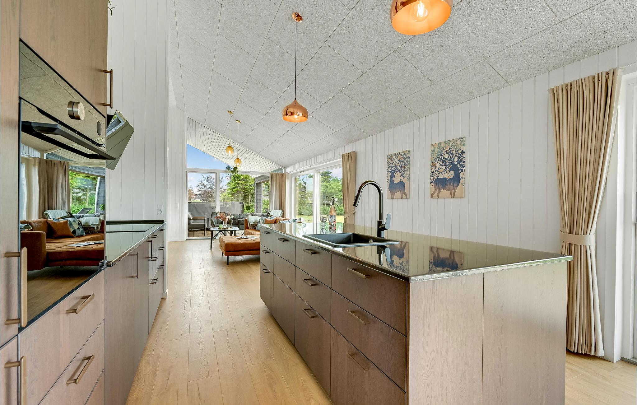 Velkommen til dette fantastiske feriehus, der kan rumme en stor familie eller to mindre familier plus to hunde. Det byder på store, åbne og smagfuldt indrettede rum med et utroligt dejligt lysindfald takket være de store vinduespartier. I kan blandt andet se frem til et rummeligt og veludstyret køkken, hvor flere gæster kan gå sammen om at tilberede lækre feriemåltider, og en skøn opholdsstue med fladskærm, der indbyder til hyggelige filmaftener.